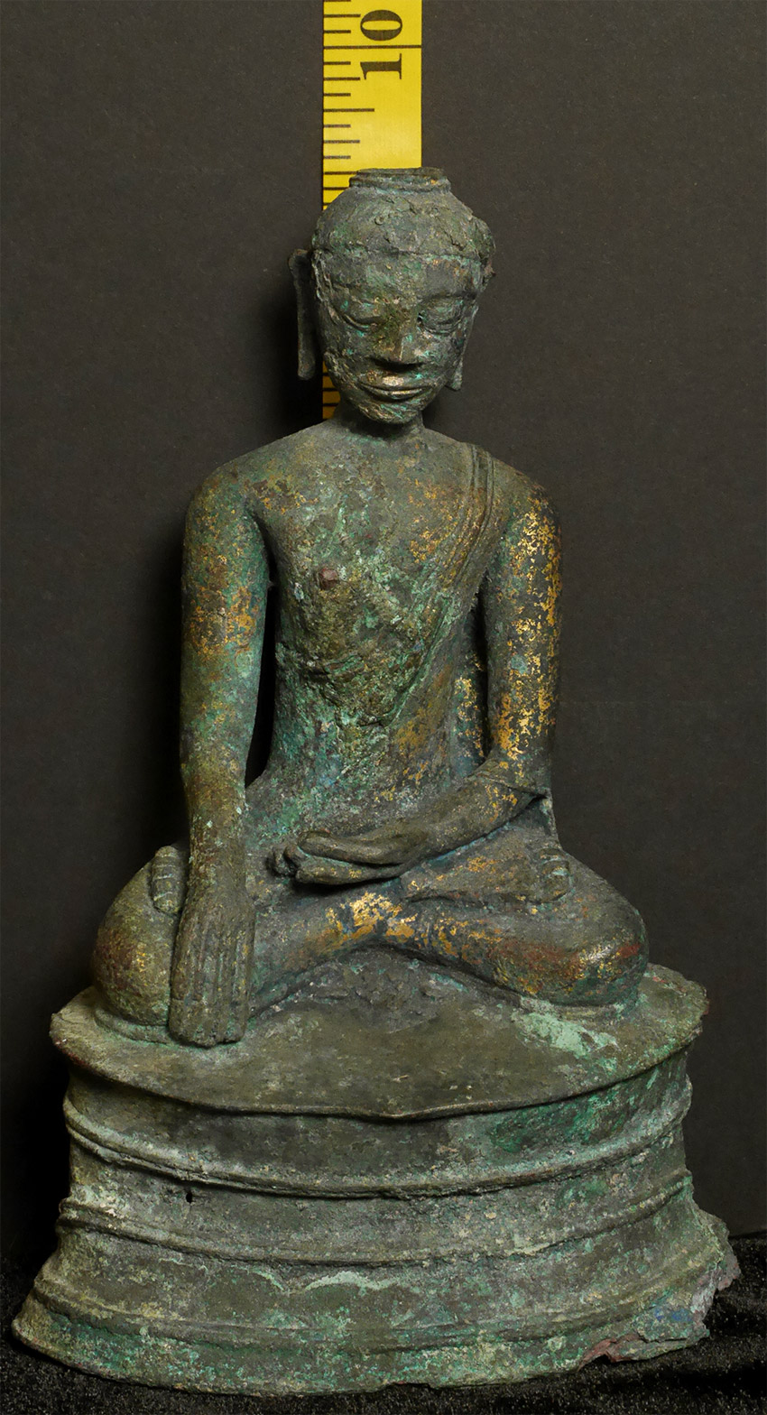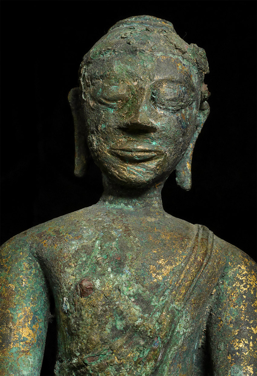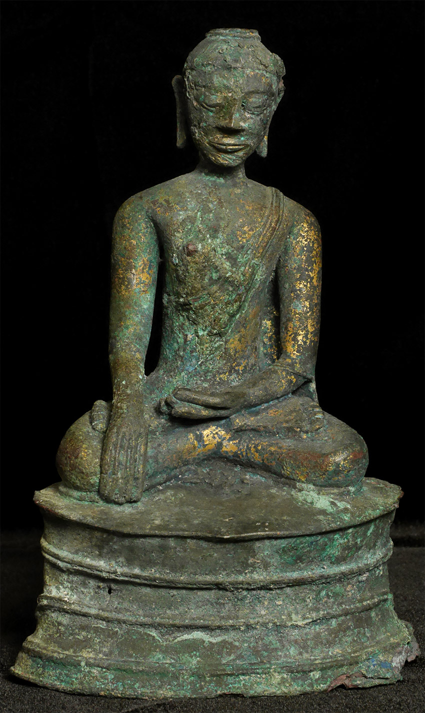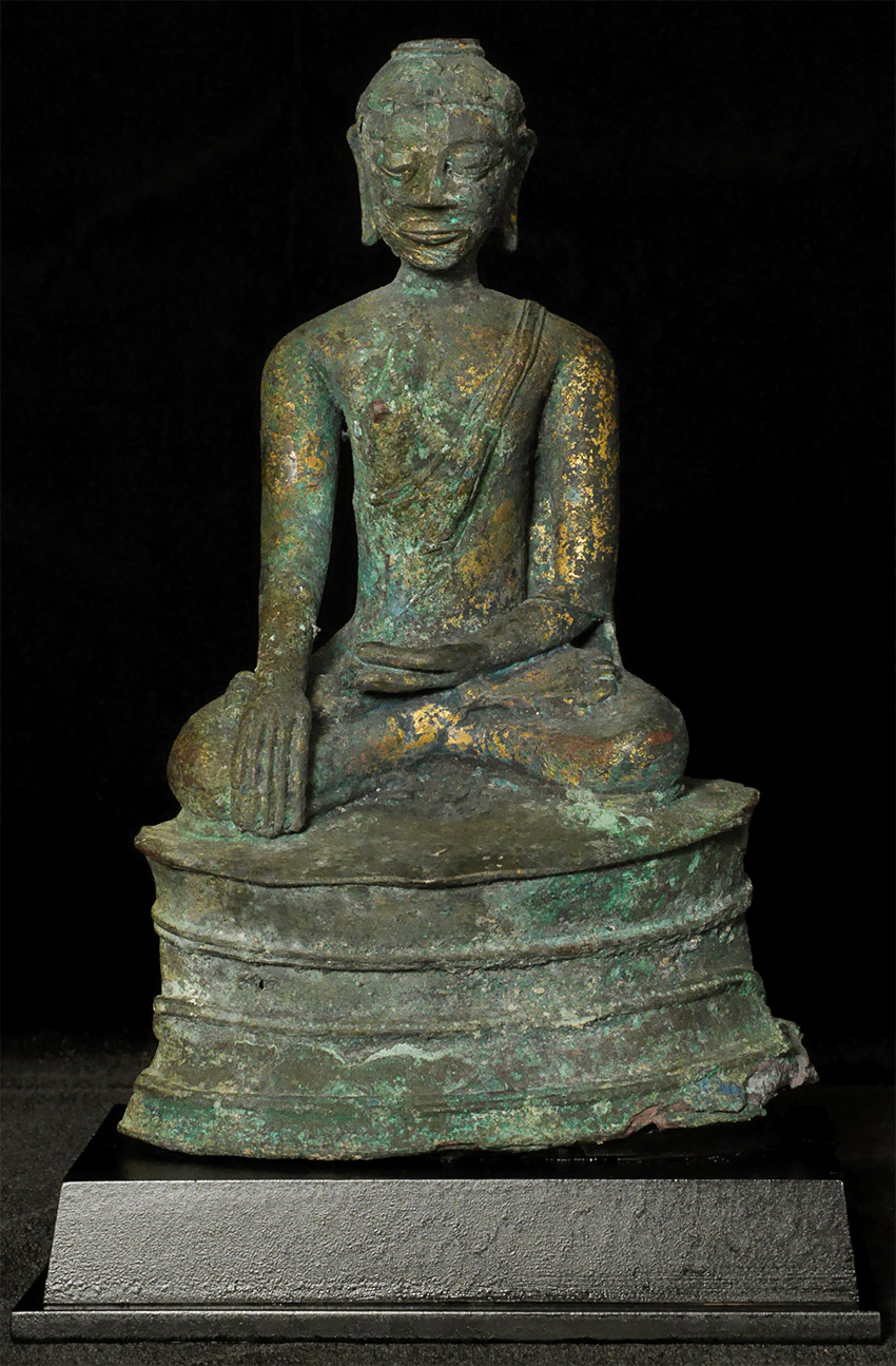 Probably Northern Thailand. Beautiful burial patina and remains of rich gilding, though the face does have significant loss and recarving. Very unusual depiction of the Buddha cutting his hair on the back of the base. 9.25 inches tall, 10.5 inches on custom stand. Likely 14thC or earlier, and my guess is from the Kingdom of Fang.