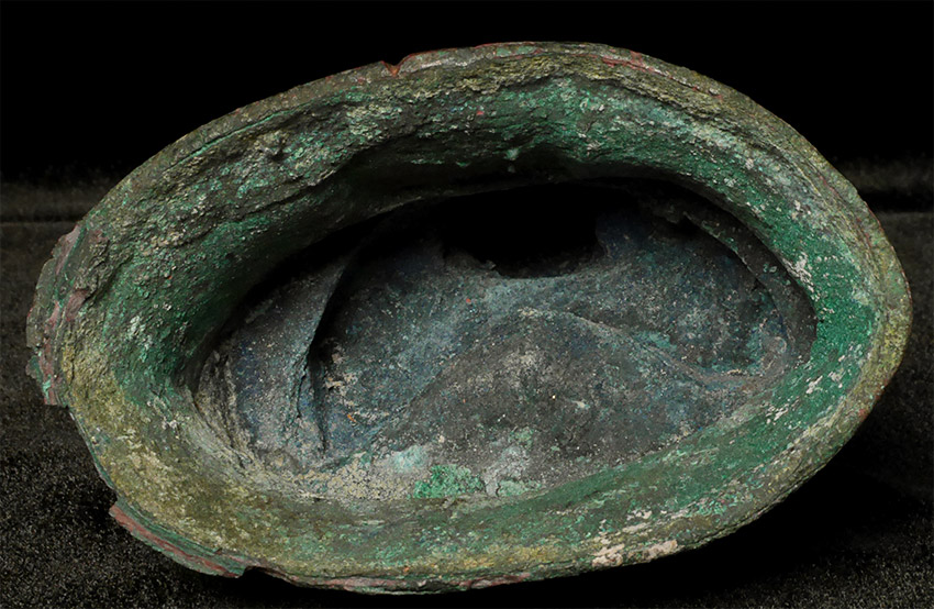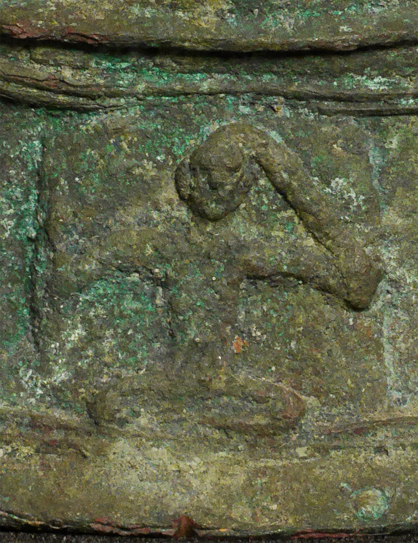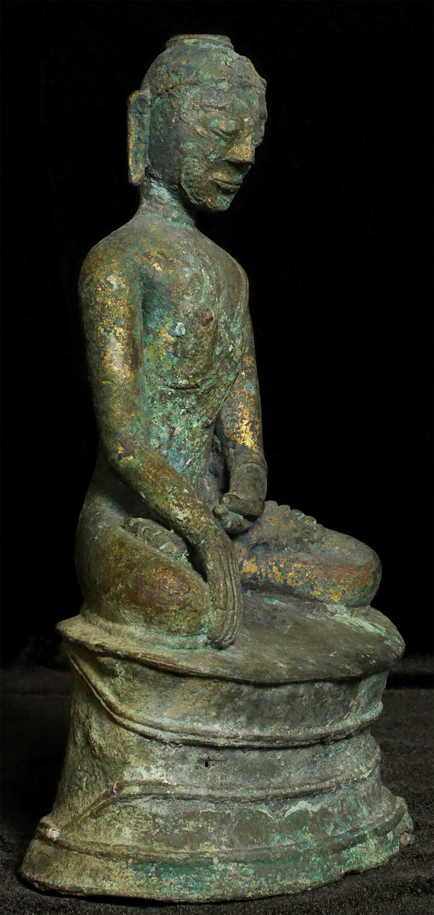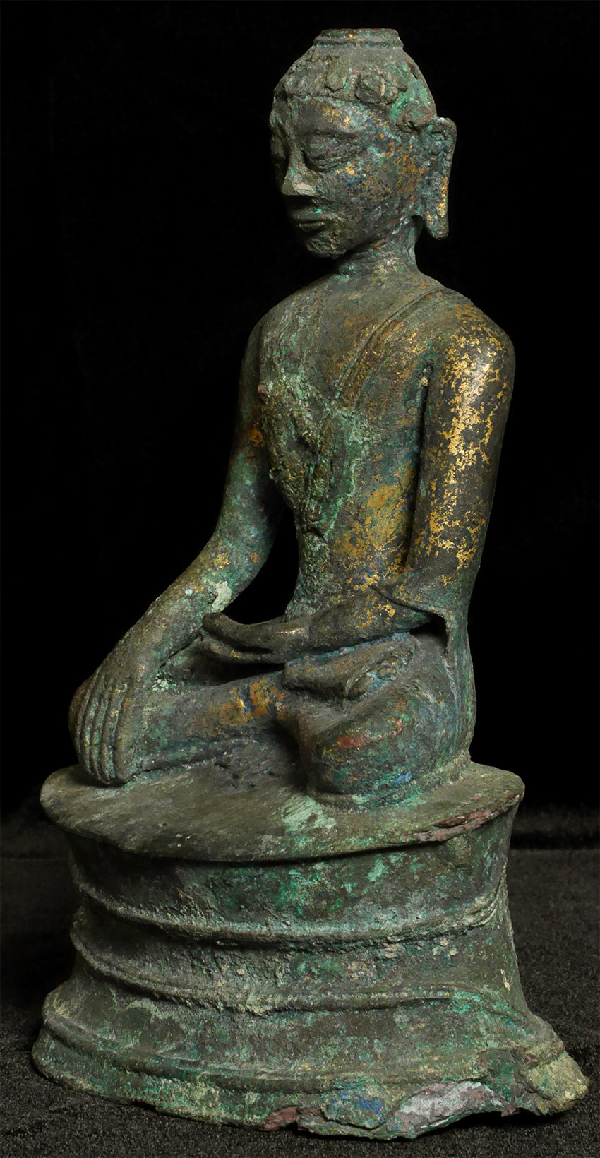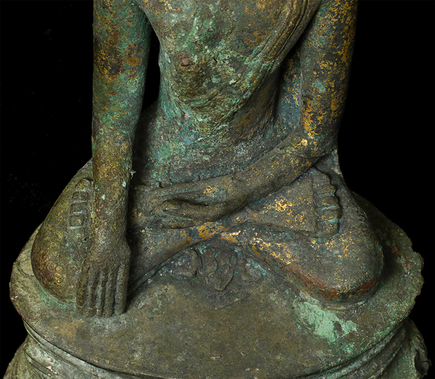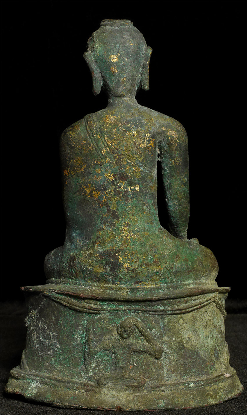 Probably Northern Thailand. Beautiful burial patina and remains of rich gilding, though the face does have significant loss and recarving. Very unusual depiction of the Buddha cutting his hair on the back of the base. 9.25 inches tall, 10.5 inches on custom stand. Likely 14thC or earlier, and my guess is from the Kingdom of Fang.