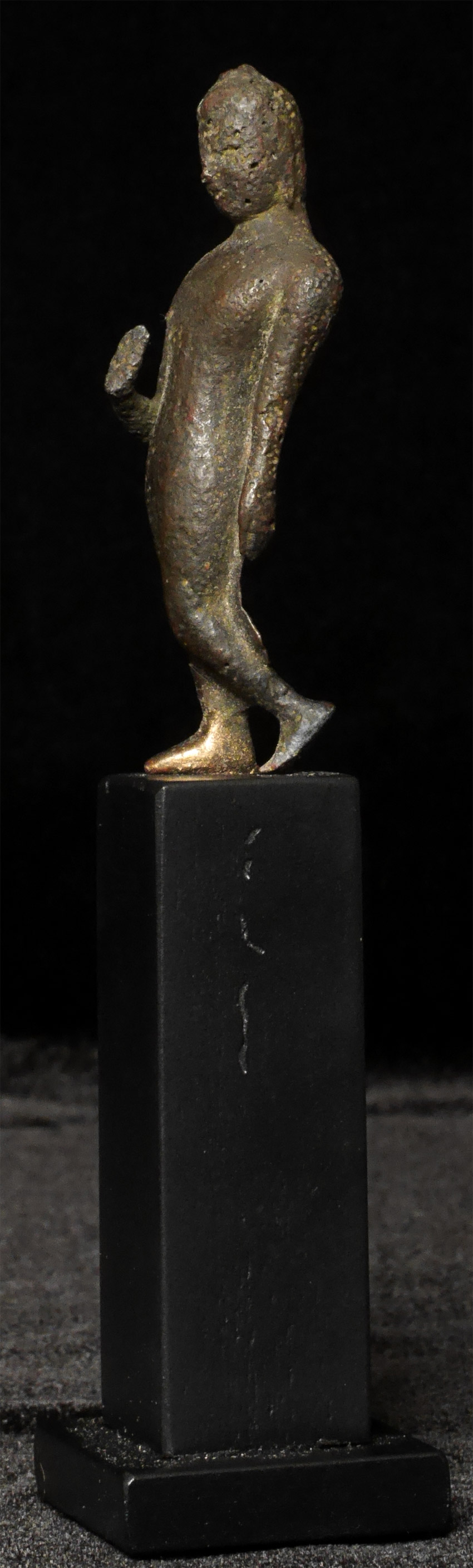 13thC or earlier Thai bronze Walking Buddha-certainly the earliest walking Buddha I've ever seen- a real museum piece. One foot replaced. Figure is 3.25 inches tall, height on the custom base is 6.5 inches. Graceful in form. A really great face given the amount of wear.