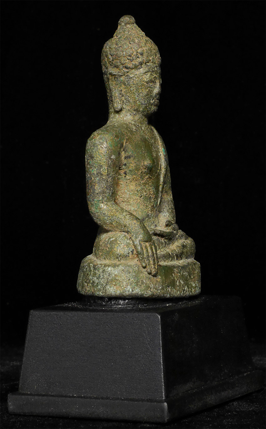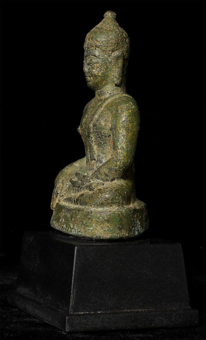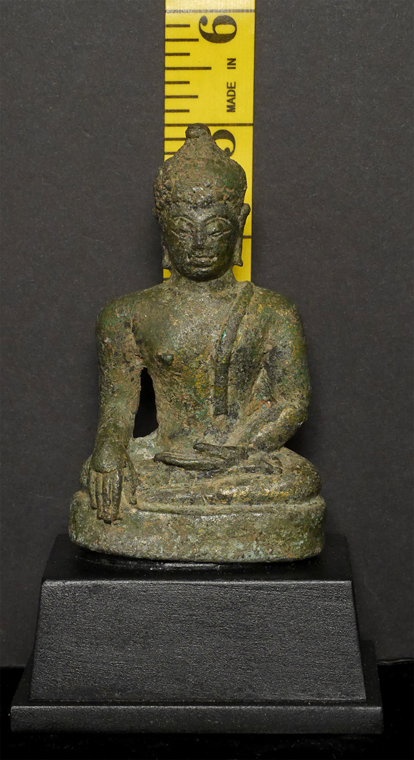 14/15thC Thai Bronze Buddha. Sits 3.5" tall, optional stand adds 1.5" for a total height of 5 inches. Early one! Strong, deeply meditative face. Nearly solid cat.
