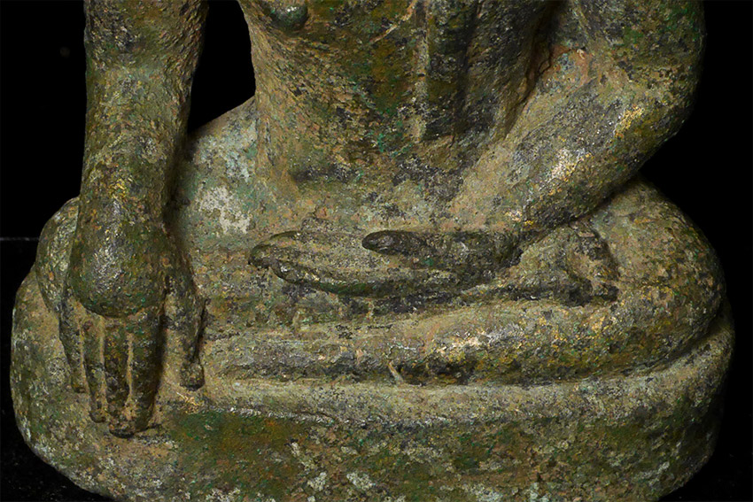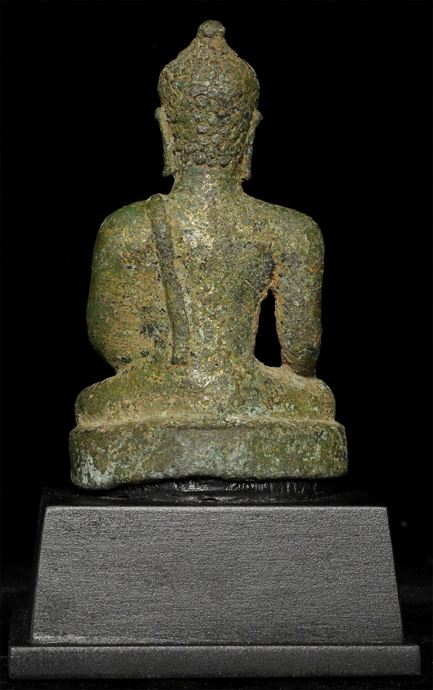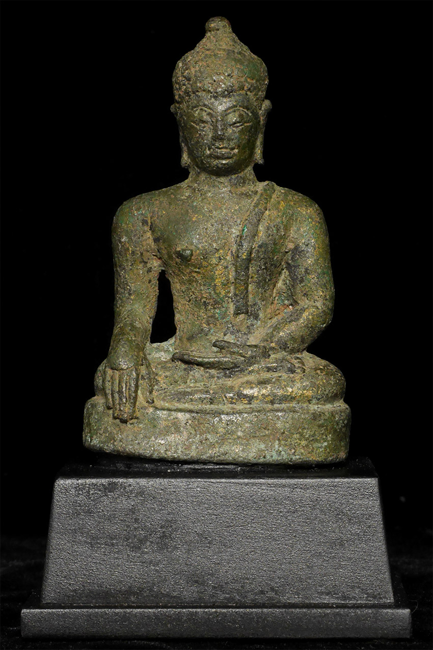 14/15thC Thai Bronze Buddha. Sits 3.5" tall, optional stand adds 1.5" for a total height of 5 inches. Early one! Strong, deeply meditative face. Nearly solid cat.