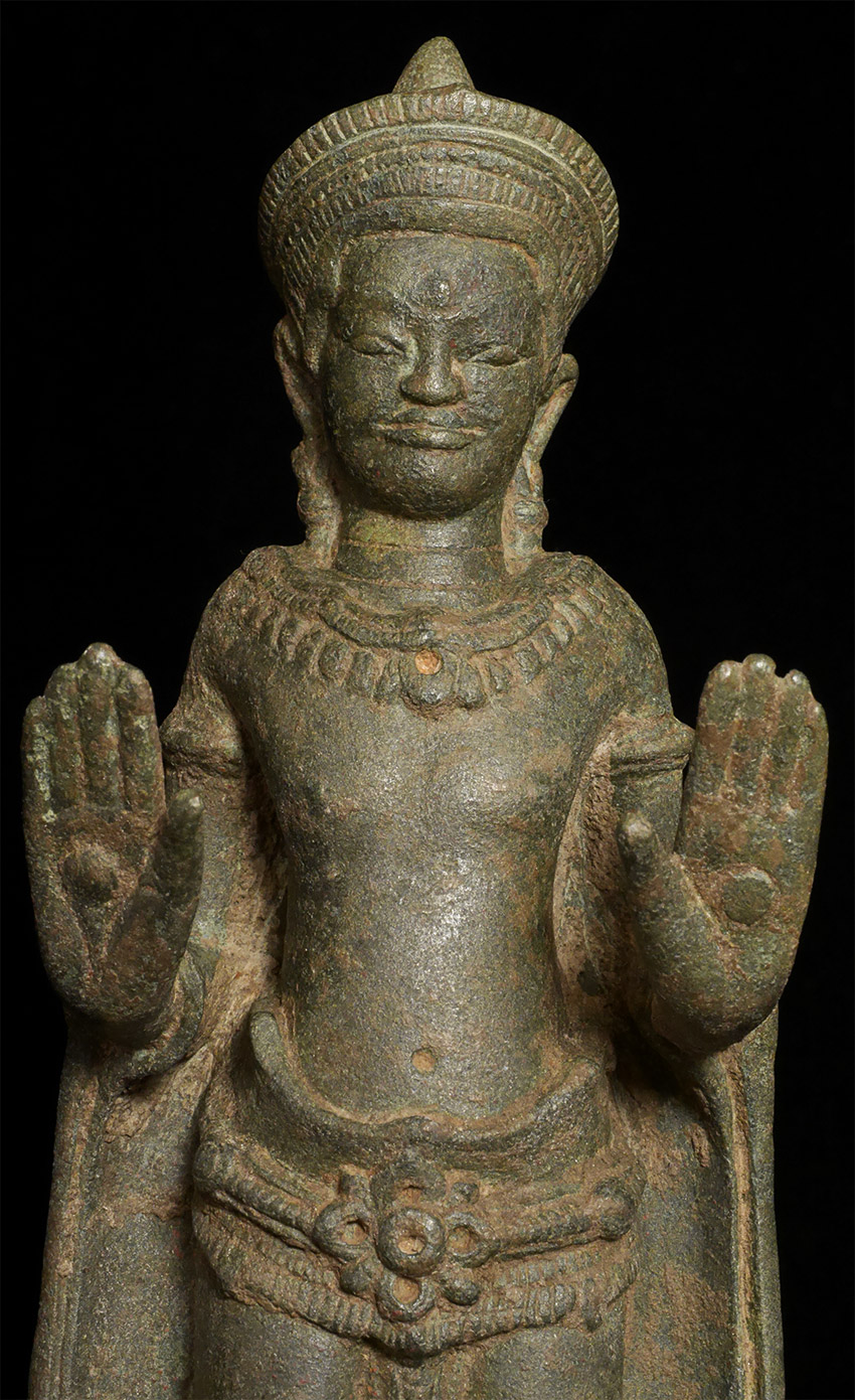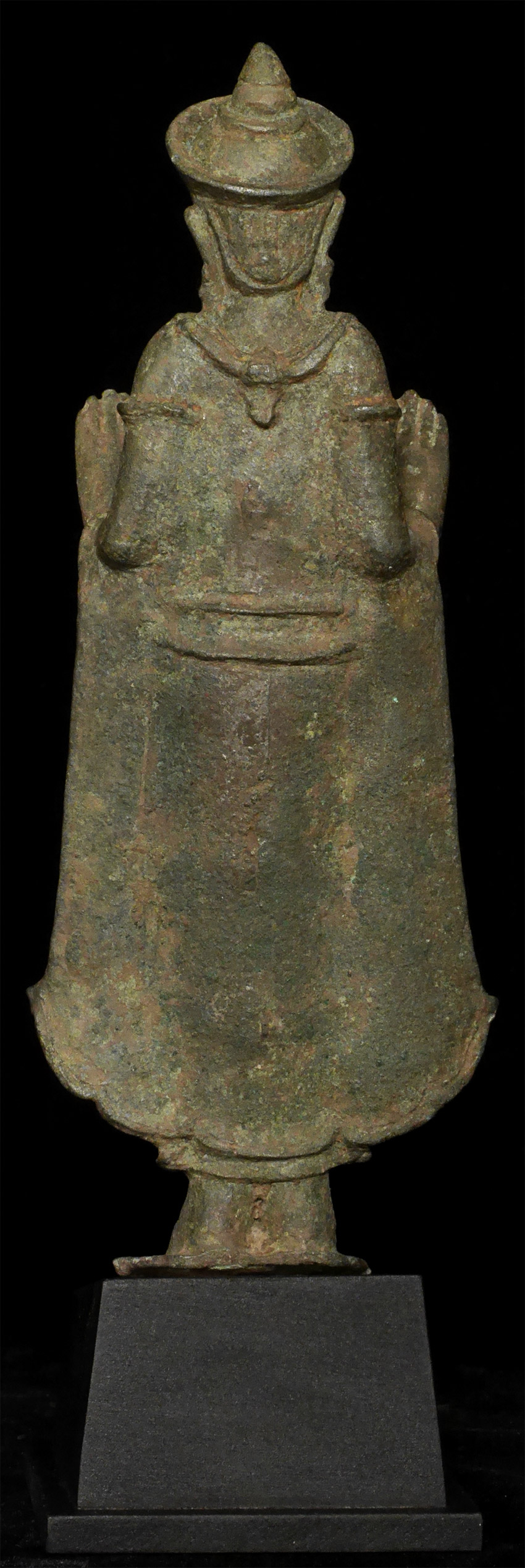 Solid-cast 12/13thC Cambodian bronze Buddha. Expectable wear, but no losses or repairs. Beautiful even untouched patina. Good size at over 8.5 inches tall, 10.25 inches on the custom base. Solid cast and quite heavy for its size. There are a lot of fakes on the market. This is one that is easy to see is authentic. purchased from Bonhams and Butterfield auction house in the late 1980sfrom an estate sale that was filled with early Cambodian bronzes from a Palo Alto California estate that was Put together in the 1950s and 60s.