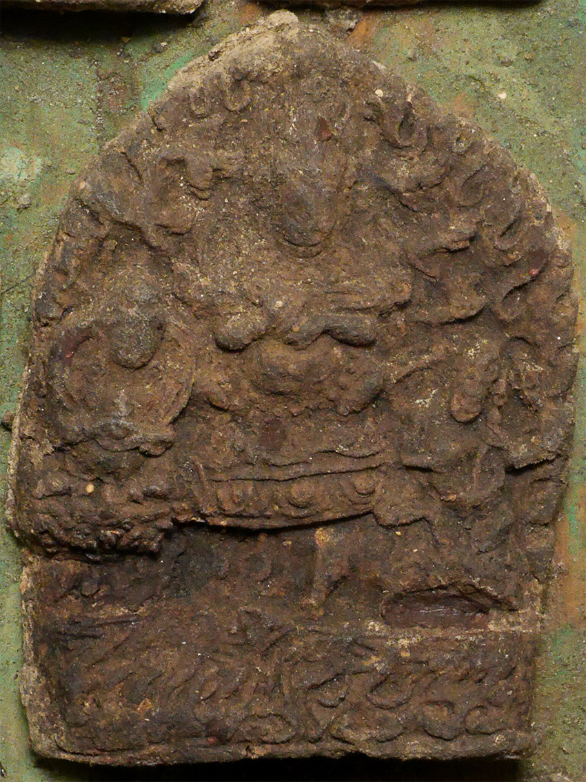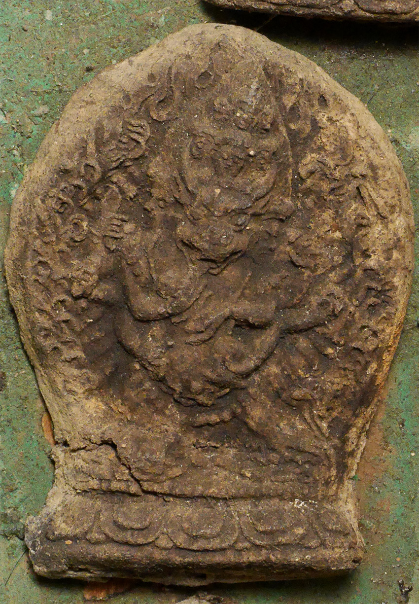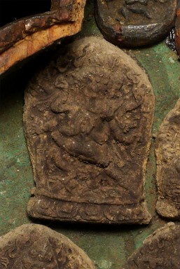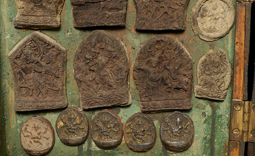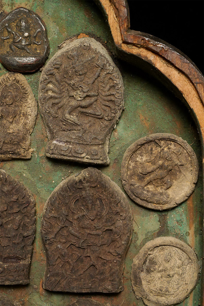 Antique Tibetan Shrine containing 19 Bhutanese clay tsa tsas. The shine box was built early/mid 20thC to house the tablets, which had been brought to Tibet from Bhutan as a group. Most are extremely rare, all look to be quite old. Entire box stands 11 inches tall.
