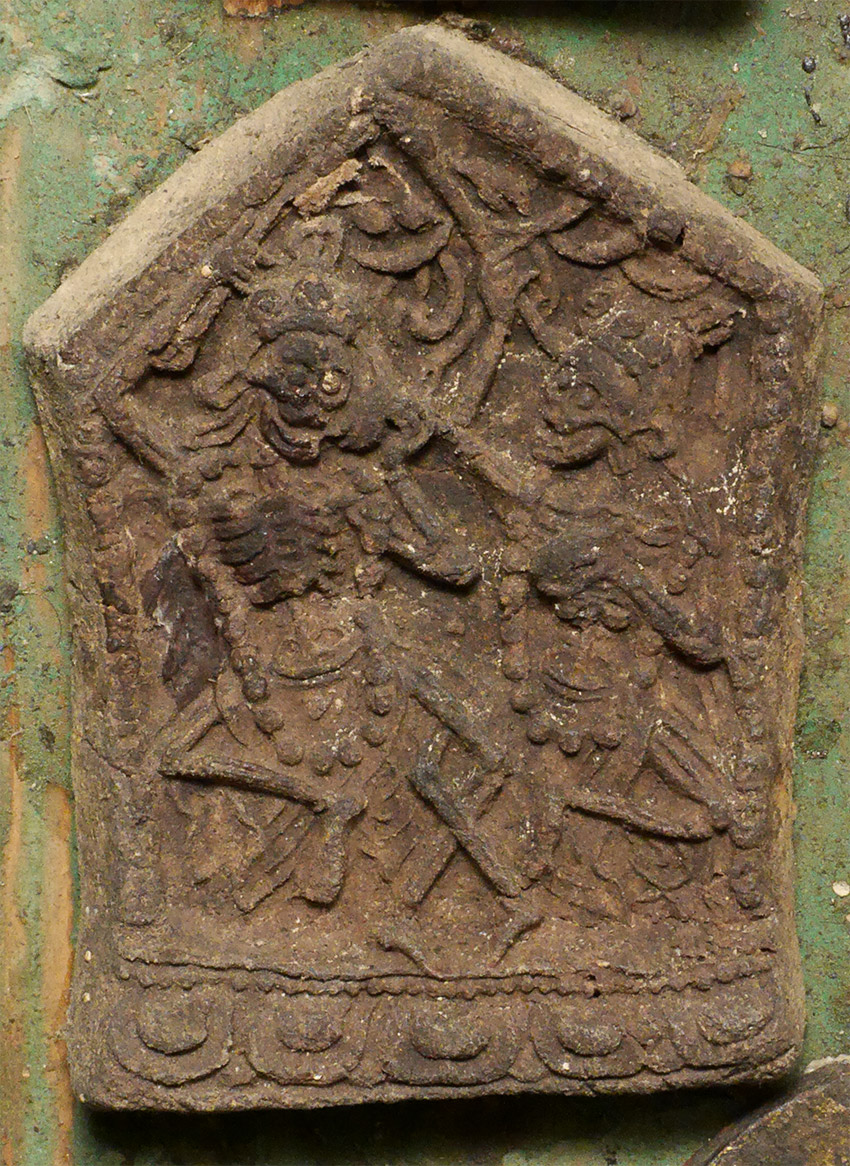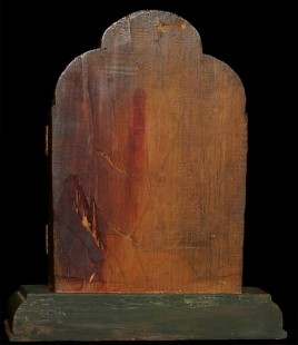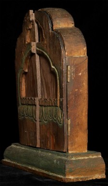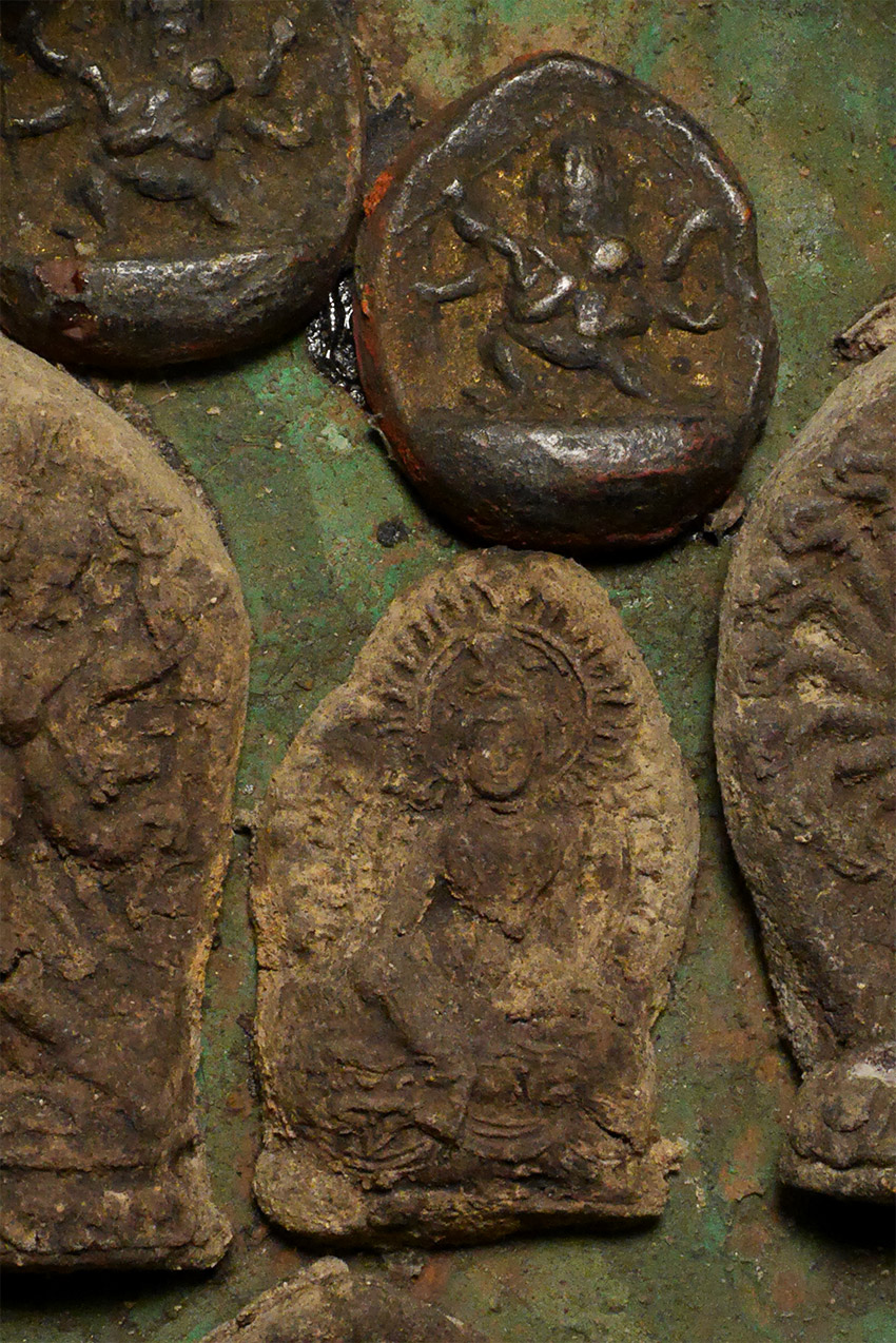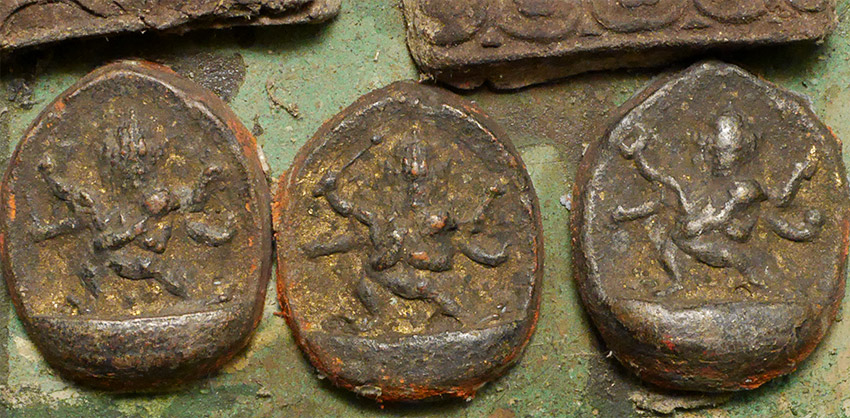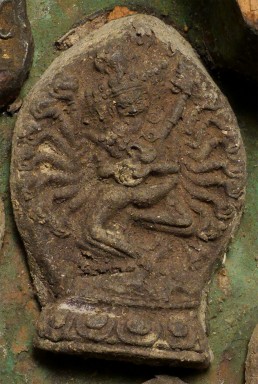 Antique Tibetan Shrine containing 19 Bhutanese clay tsa tsas. The shine box was built early/mid 20thC to house the tablets, which had been brought to Tibet from Bhutan as a group. Most are extremely rare, all look to be quite old. Entire box stands 11 inches tall.