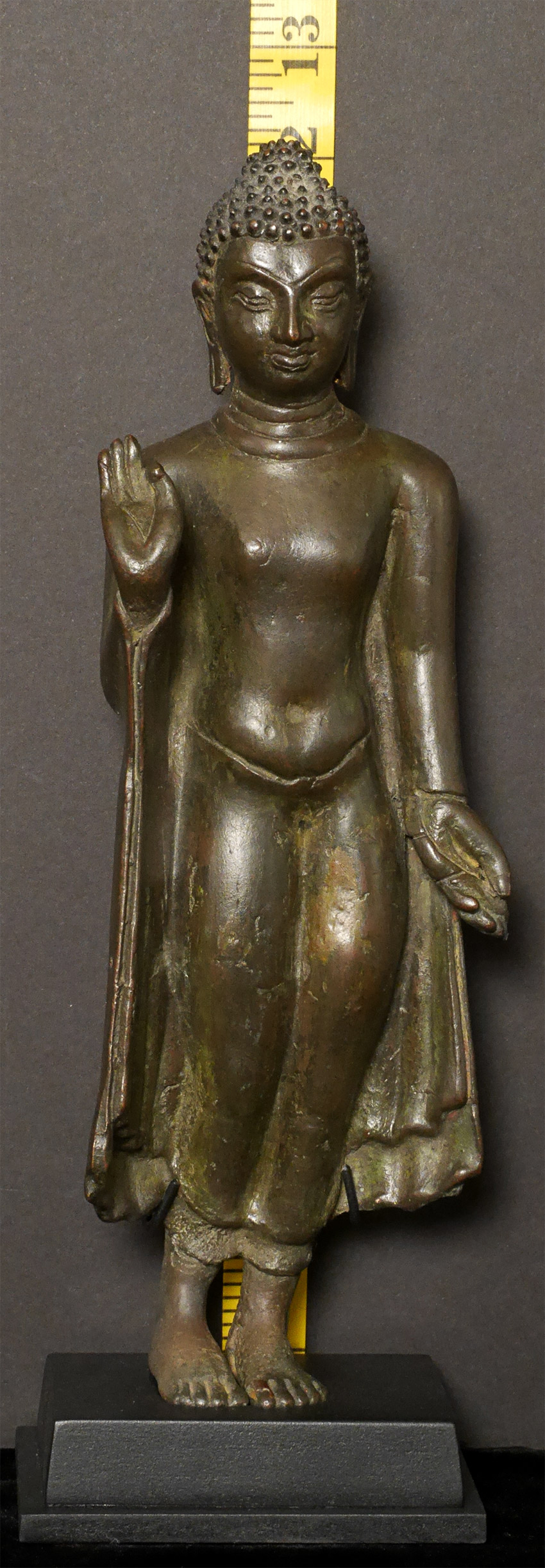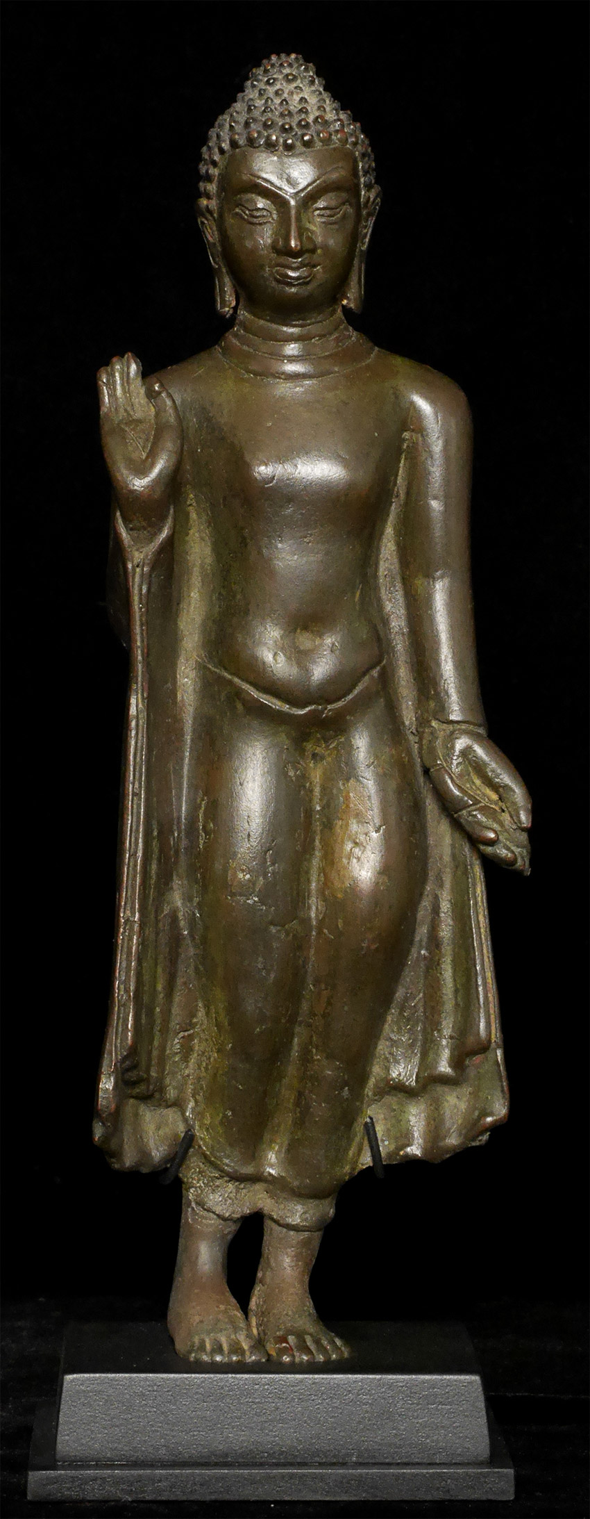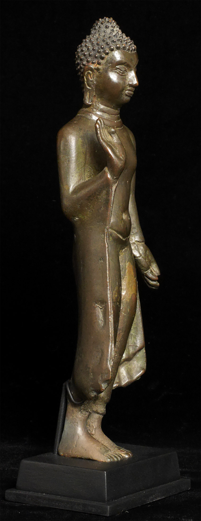 A rare and fine Amravati style bronze Buddha, post-Gupta period, dating to the 8th-10th century, or earlier, Remains of lacquer on the top of the toes and gilding on the underside of feet.Left hand has a bit of flattening-otherwise near perfect. Measures 11 inches tall and 12 1/8 inches on custom stand. Purchased 20+ years ago from an old German collection. I had thought this was a very early Thai walking Buddha, until I saw a few Indian prototypes. Through my research, I realized this piece was from hundreds of years earlier, and originated in India (and far rarer). See the (last) photo in listing of related post-Gupta piece dated to the 9/10thC. My piece has more finesse, with far more complex robes and a better face and is larger in size. As with all Indian bronzes of this period, it is solid cast. I had thought mine was a flattened walking Buddha with little movement in it's feet, but it is actually an Indian pre-walking Buddha with a great sway in its hips. The feet are likely not out of place(as I had originally thought, though they might have some repair), but are probably as intended when created. It took 20 years to figure this piece out as I had been looking at it as being Southeast Asian, and being a crossover from Davarati to early Sukhothai rather than it being earlier, and from India. The Gupta style was actually a precursor to the Davarati style, and was one of the templates for most of the SE Asian Buddhist sculpture to follow for the next 1000+ years.