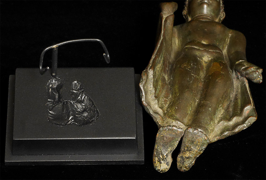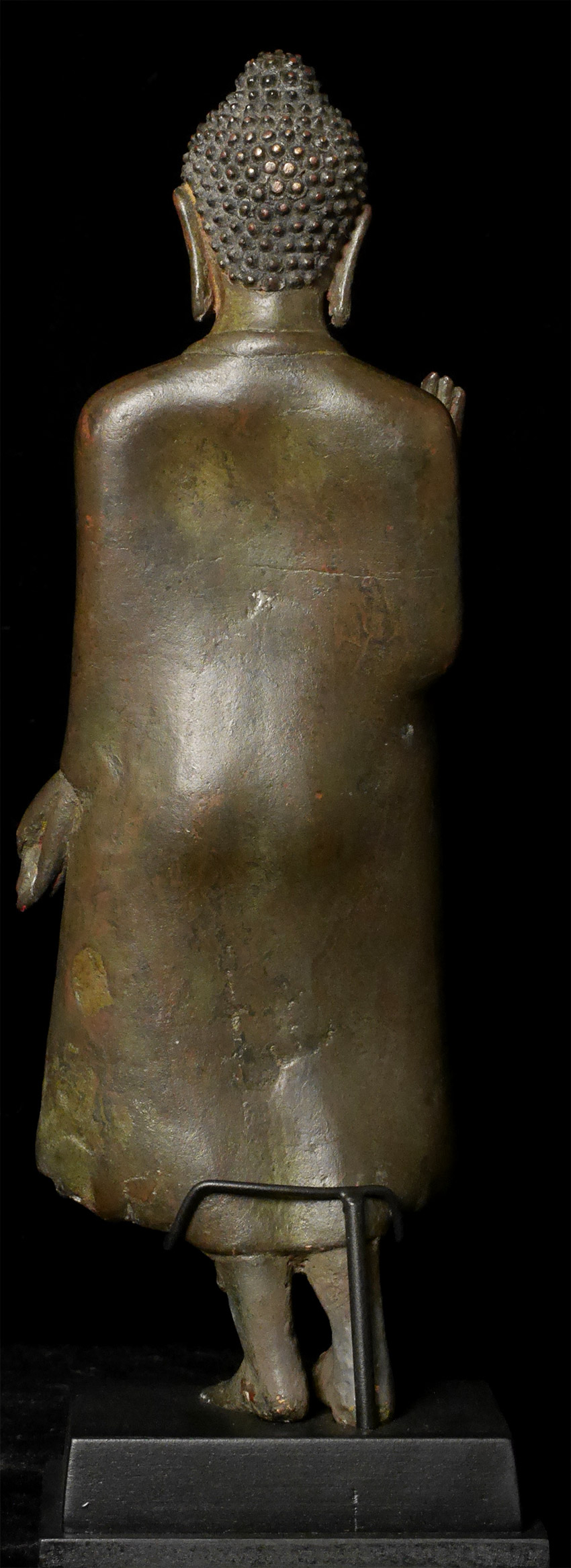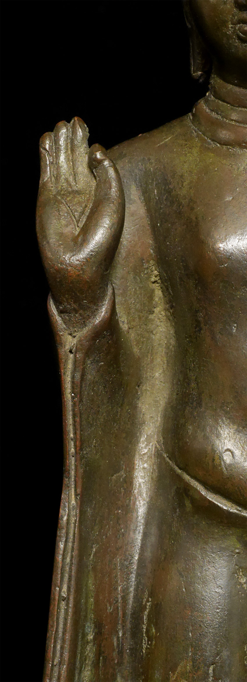 A rare and fine Amravati style bronze Buddha, post-Gupta period, dating to the 8th-10th century, or earlier, Remains of lacquer on the top of the toes and gilding on the underside of feet.Left hand has a bit of flattening-otherwise near perfect. Measures 11 inches tall and 12 1/8 inches on custom stand. Purchased 20+ years ago from an old German collection. I had thought this was a very early Thai walking Buddha, until I saw a few Indian prototypes. Through my research, I realized this piece was from hundreds of years earlier, and originated in India (and far rarer). See the (last) photo in listing of related post-Gupta piece dated to the 9/10thC. My piece has more finesse, with far more complex robes and a better face and is larger in size. As with all Indian bronzes of this period, it is solid cast. I had thought mine was a flattened walking Buddha with little movement in it's feet, but it is actually an Indian pre-walking Buddha with a great sway in its hips. The feet are likely not out of place(as I had originally thought, though they might have some repair), but are probably as intended when created. It took 20 years to figure this piece out as I had been looking at it as being Southeast Asian, and being a crossover from Davarati to early Sukhothai rather than it being earlier, and from India. The Gupta style was actually a precursor to the Davarati style, and was one of the templates for most of the SE Asian Buddhist sculpture to follow for the next 1000+ years.