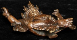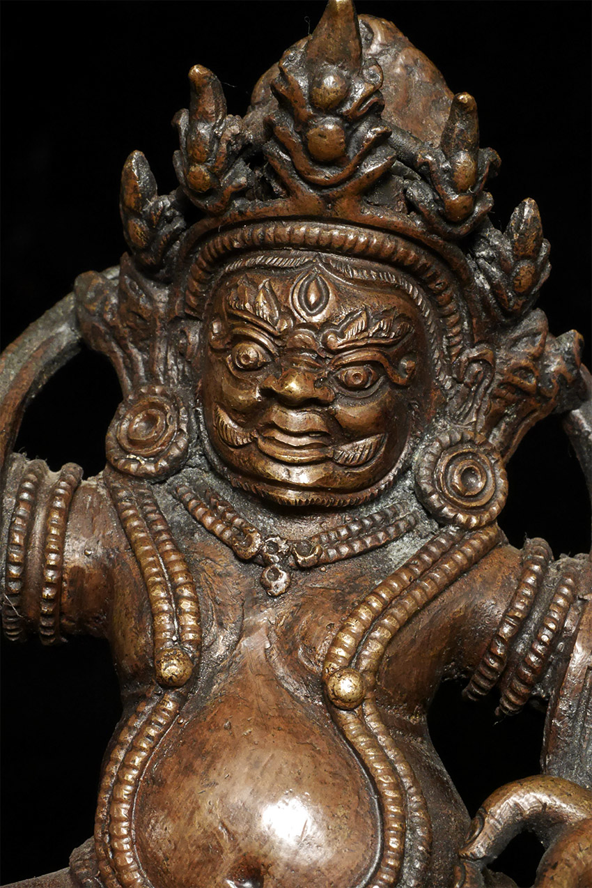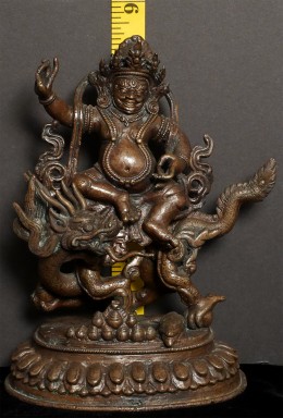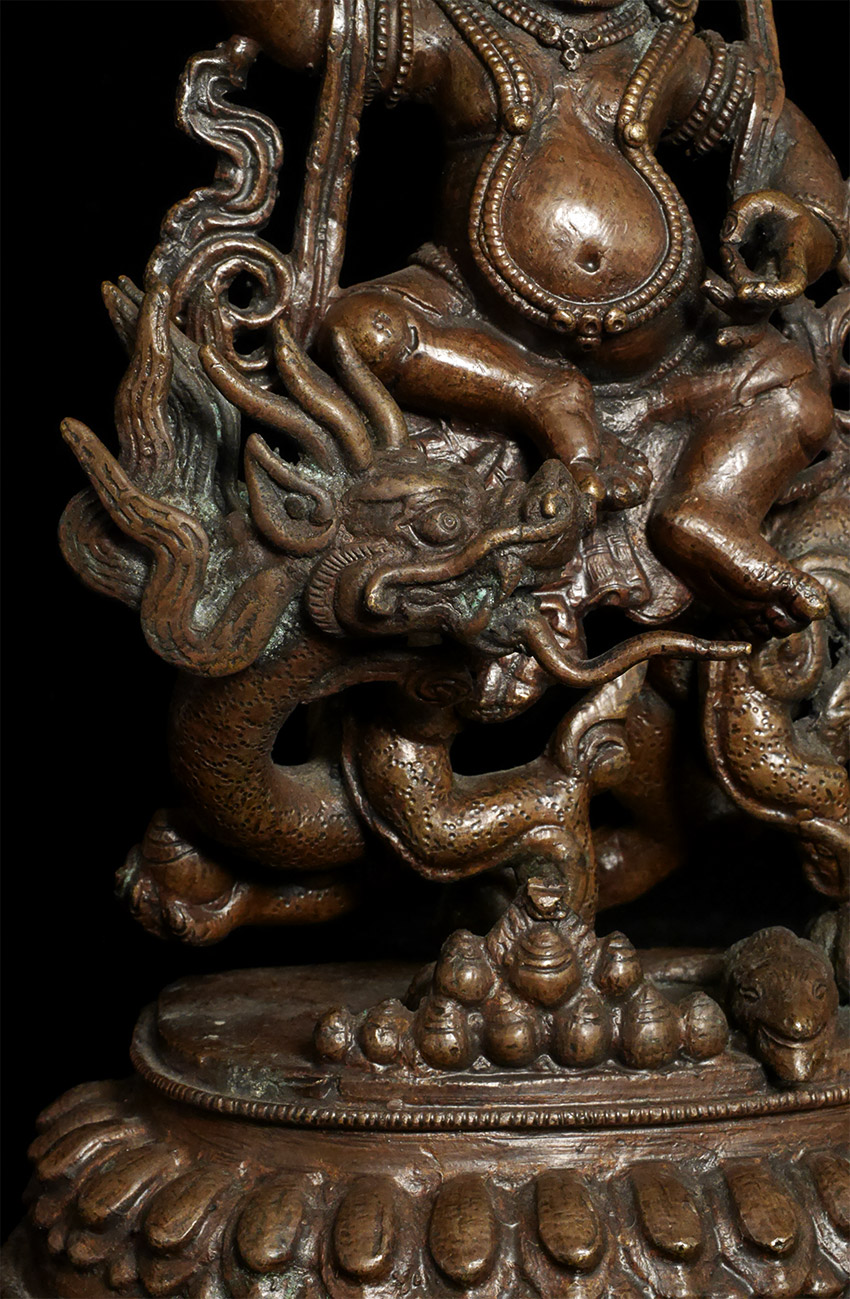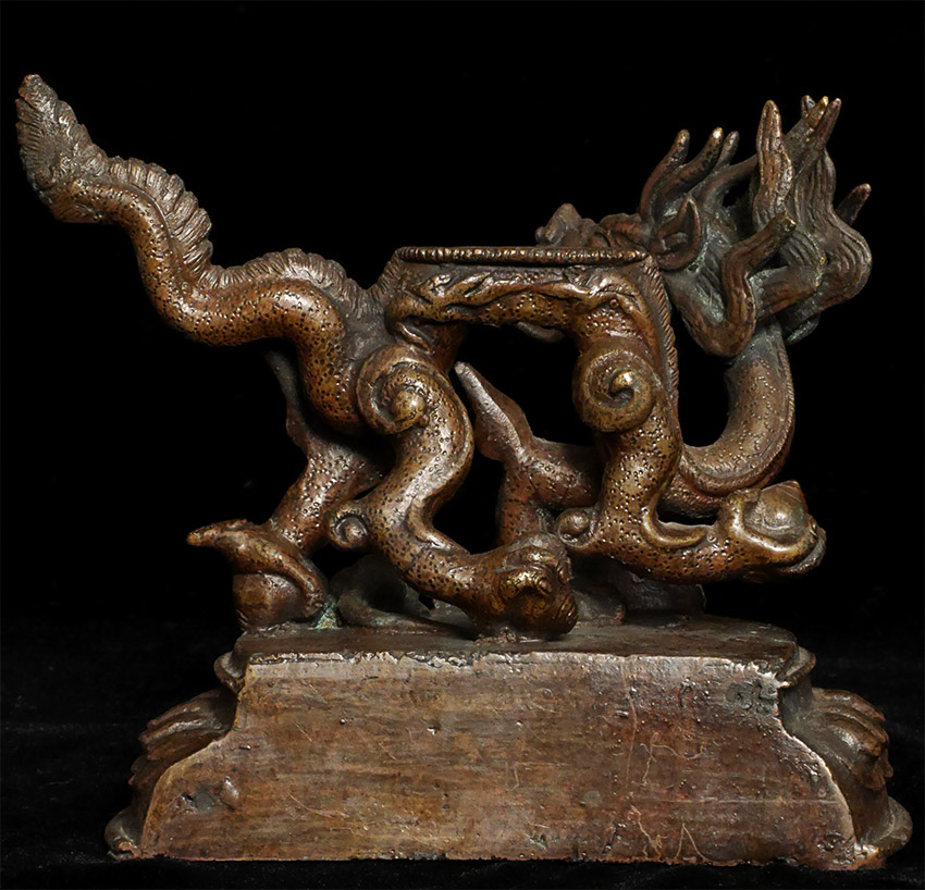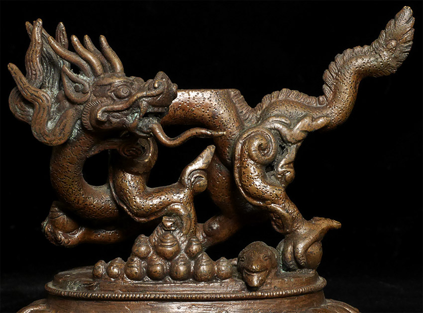 From a 3 generation USA family collection- fiece protective figure atop incredible dragon. Some verdigris. Very well cast with a beautiful patina. Probably late 19th century. Large and heavy at 8.25 inches tall and solid-cast