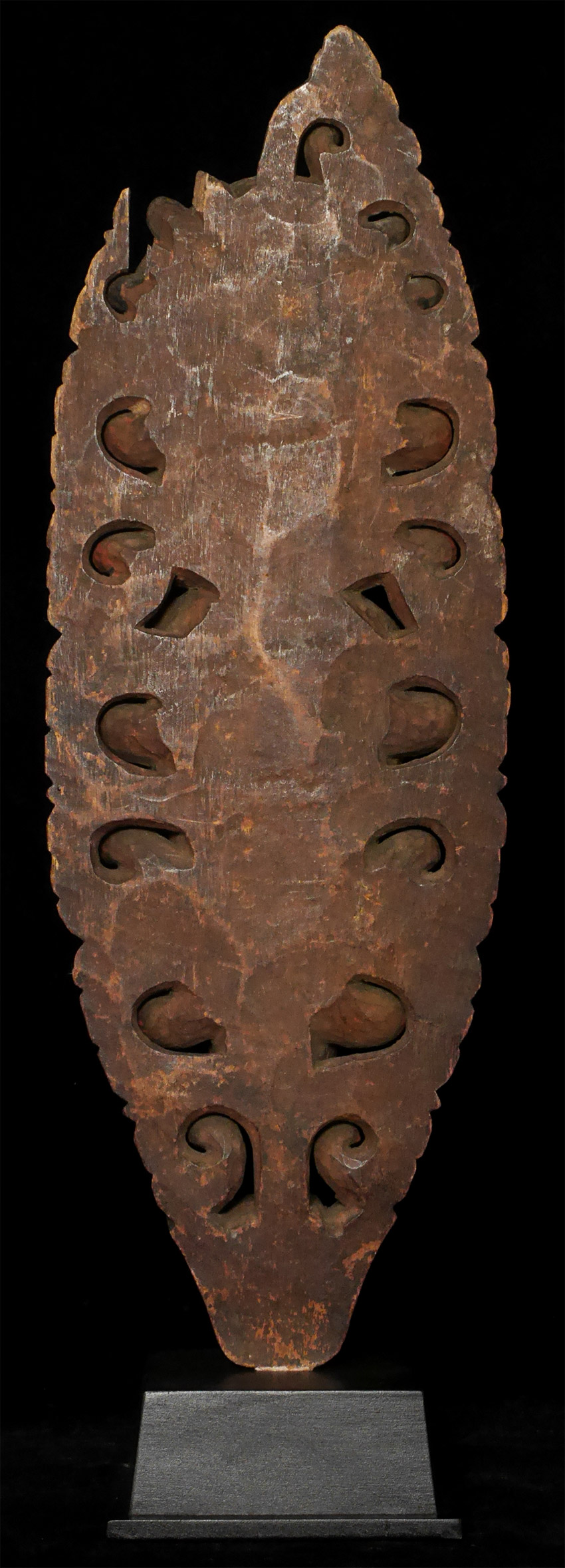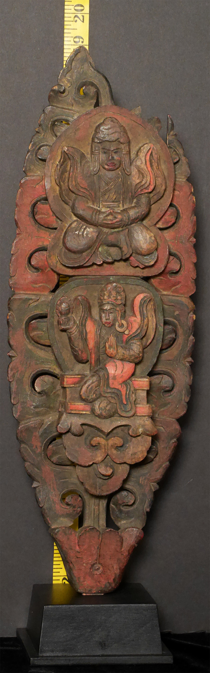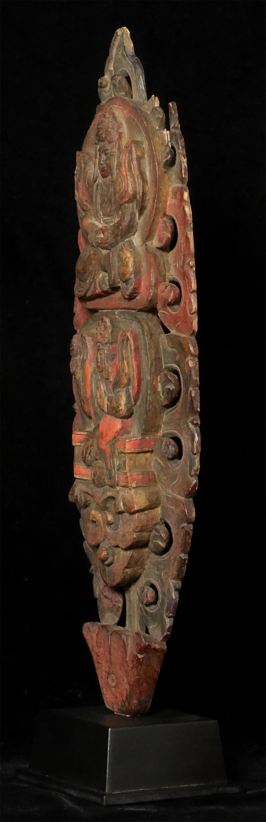Nepalese antique "Torma" altar piece. Outside my area of collecting, but I was able to buy 4 particularly good authentic ones. All have some loss at the top, as they were used ritually and are made of delicate wood. Colors in photos are accurate and not enhanced. Size: 17 1/8 inches tall, 19 inches on custom stand
