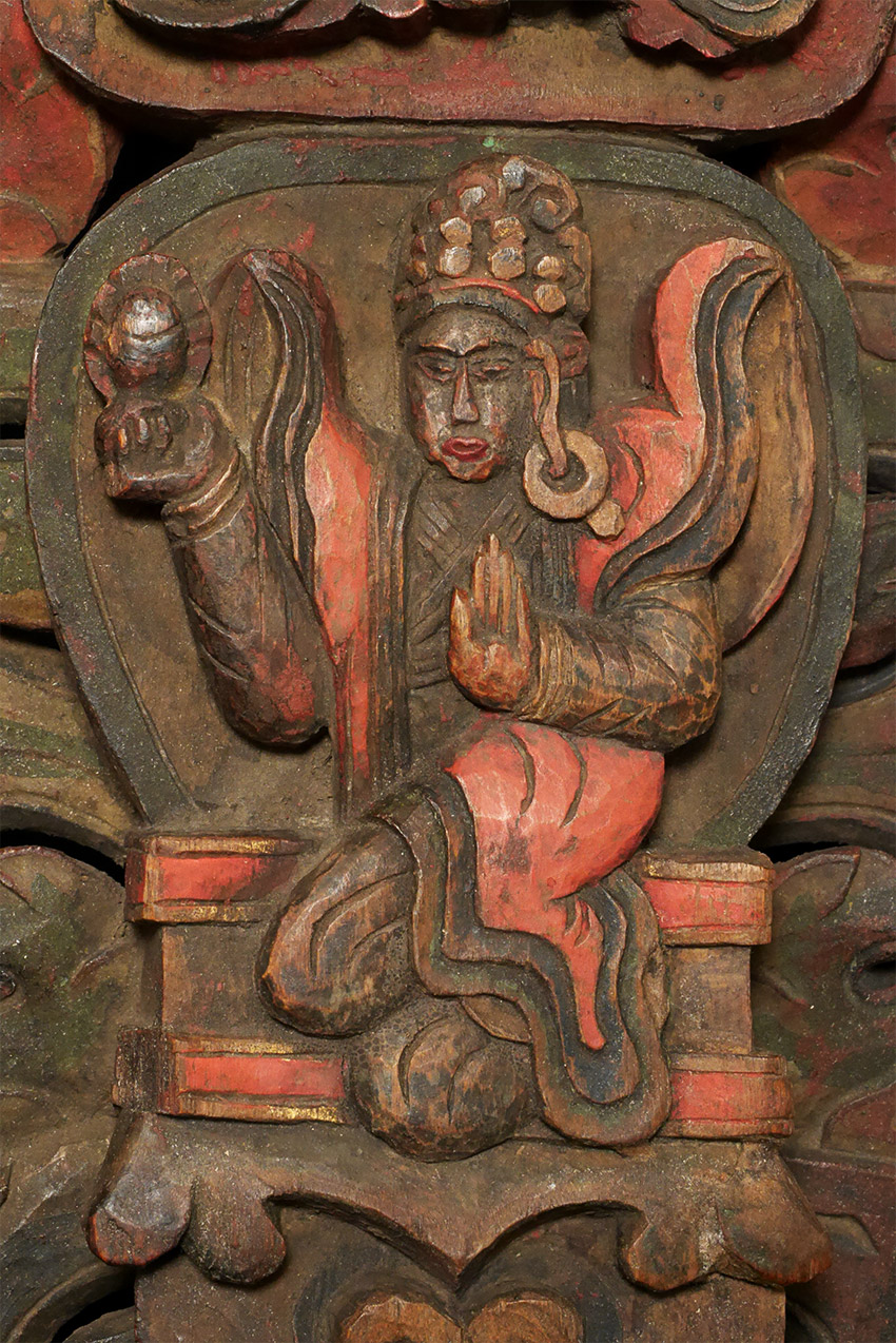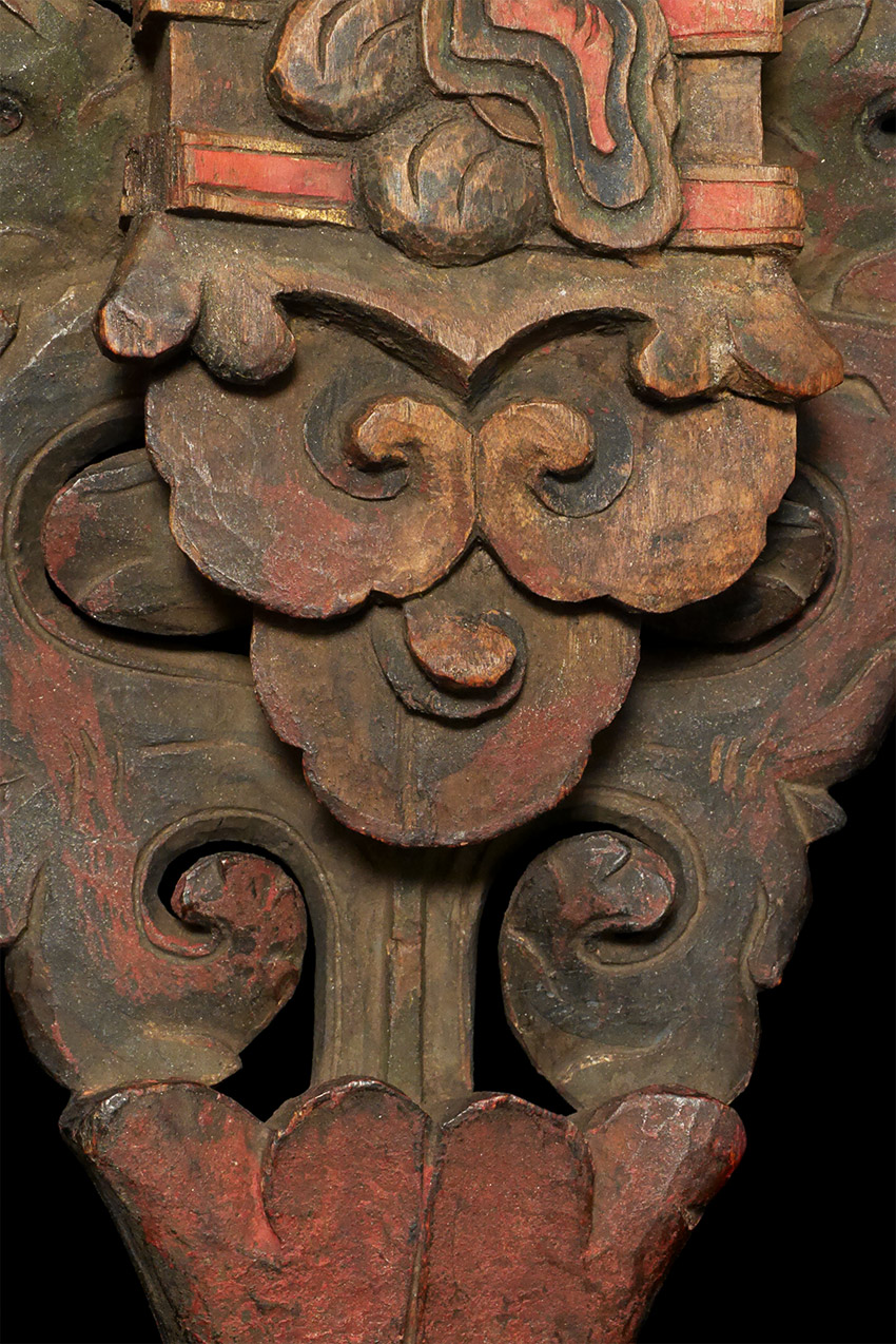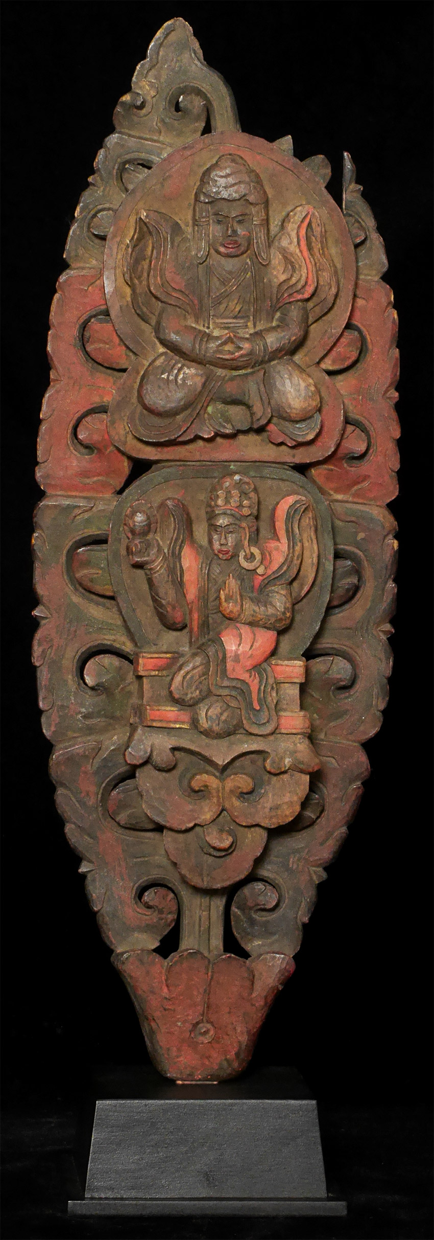 Nepalese antique "Torma" altar piece. Outside my area of collecting, but I was able to buy 4 particularly good authentic ones. All have some loss at the top, as they were used ritually and are made of delicate wood. Colors in photos are accurate and not enhanced. Size: 17 1/8 inches tall, 19 inches on custom stand