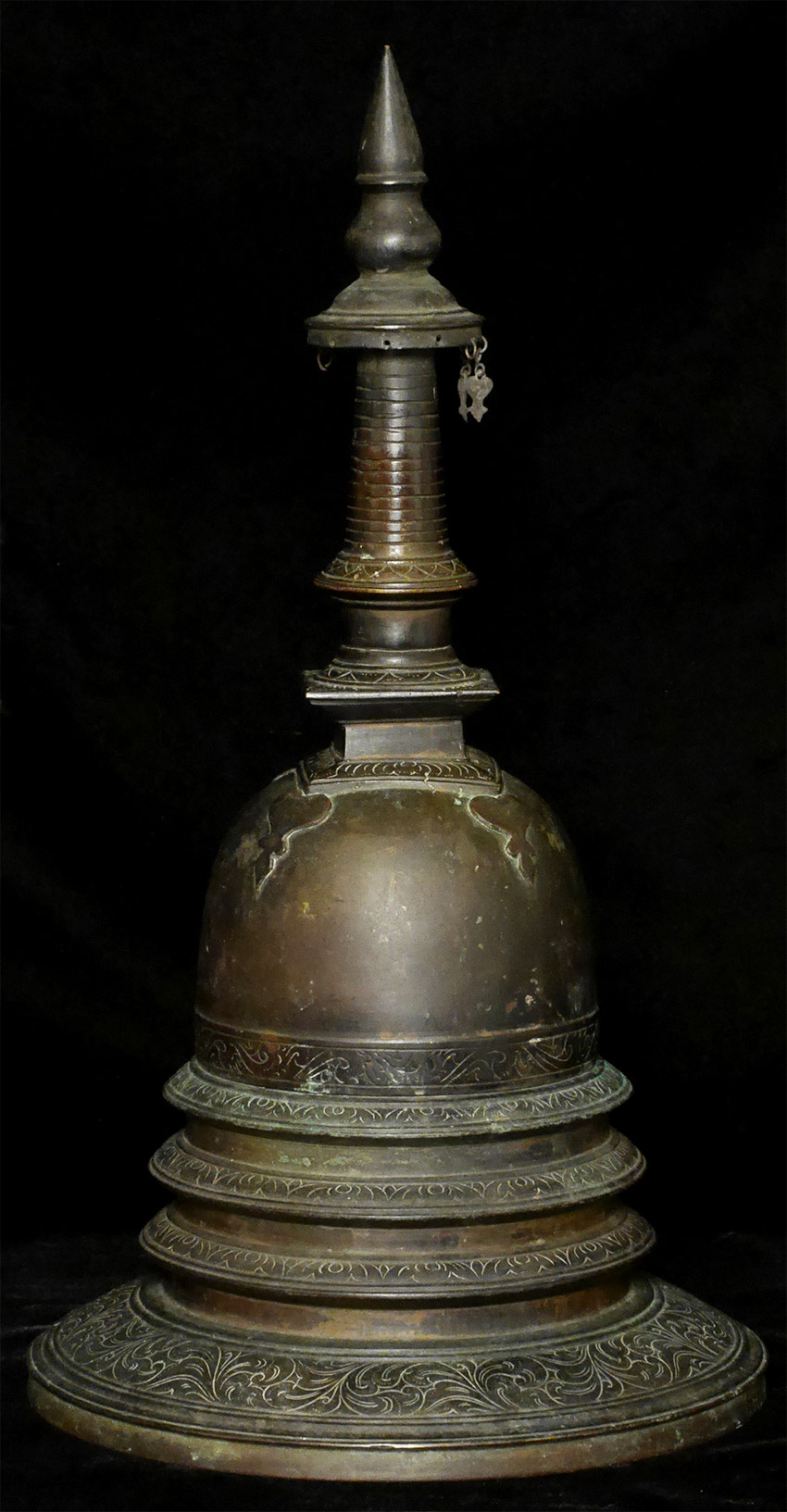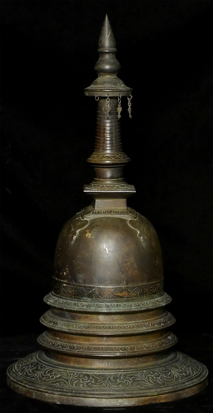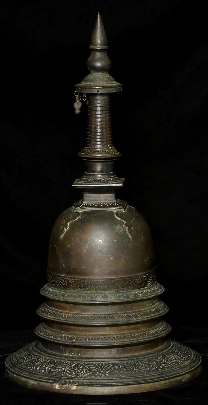Temple size 18/19thC or earlier Sri Lankan Stupa with intact consecration. Still retains a few of its dangly bits hanging from near the top. Stupas, the nature of their shape, grow dramatically in mass as they increase in height. To illustrate this I put a 7 inch and a 9.5 inch Sri Lankan Stupa in one of the photos for comparison). The one in this listing is an astounding 16.75 inches tall.