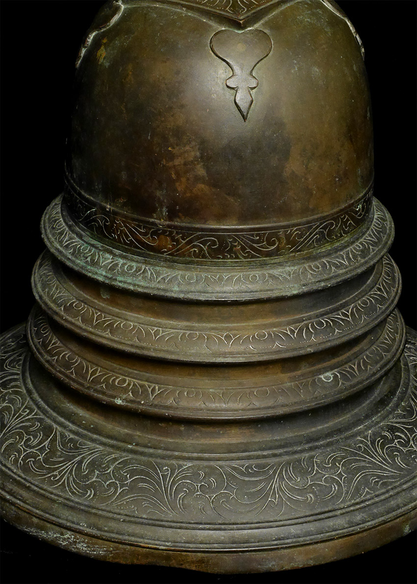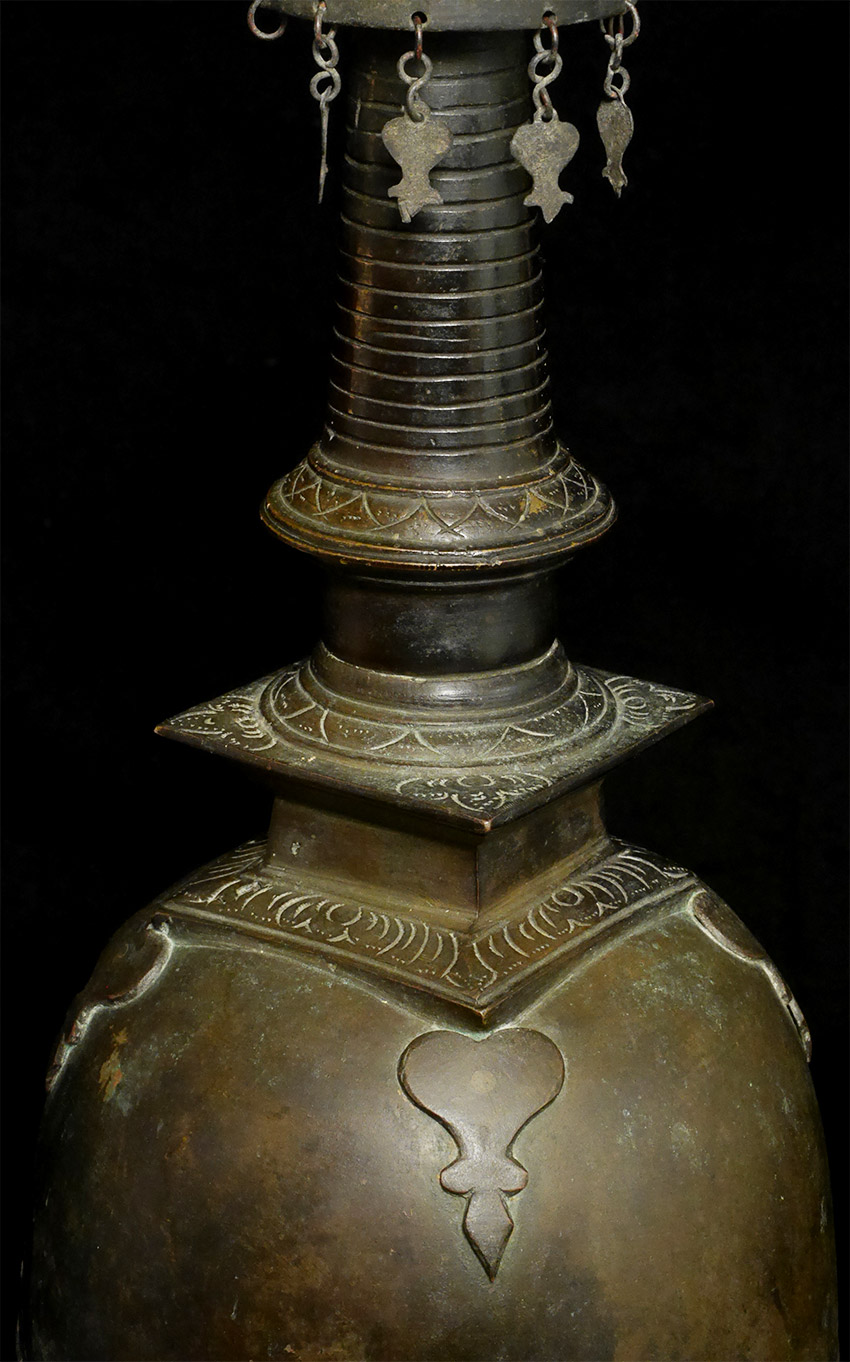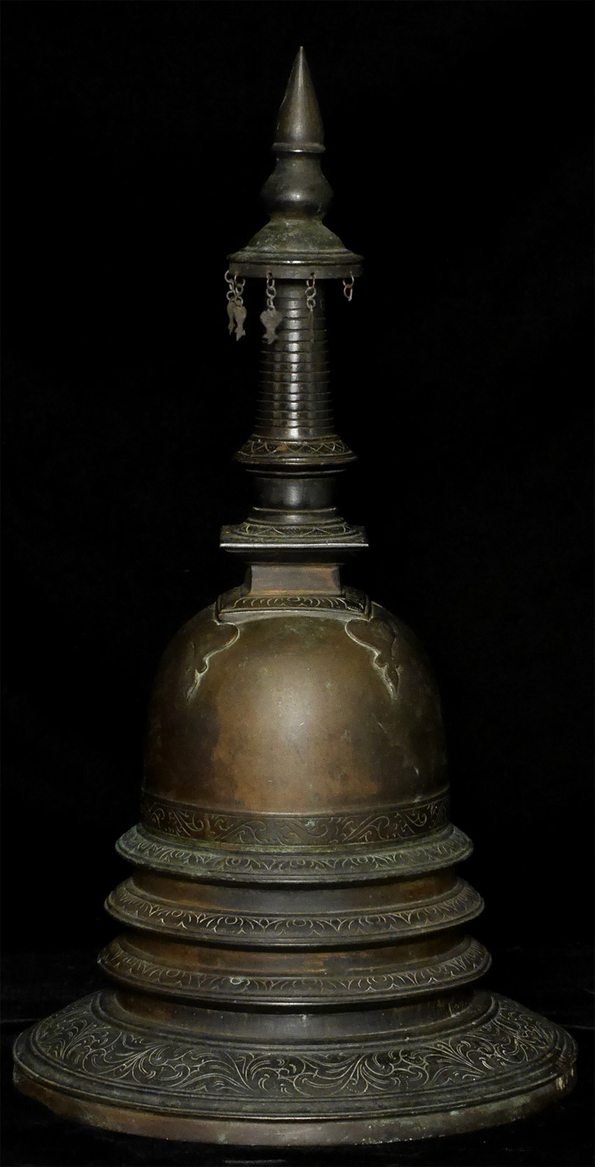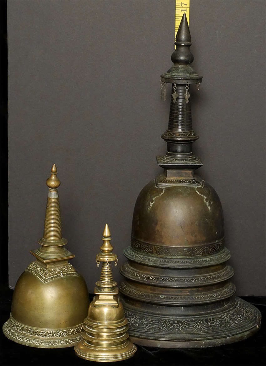 Temple size 18/19thC or earlier Sri Lankan Stupa with intact consecration. Still retains a few of its dangly bits hanging from near the top. Stupas, the nature of their shape, grow dramatically in mass as they increase in height. To illustrate this I put a 7 inch and a 9.5 inch Sri Lankan Stupa in one of the photos for comparison). The one in this listing is an astounding 16.75 inches tall.