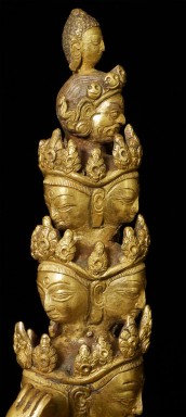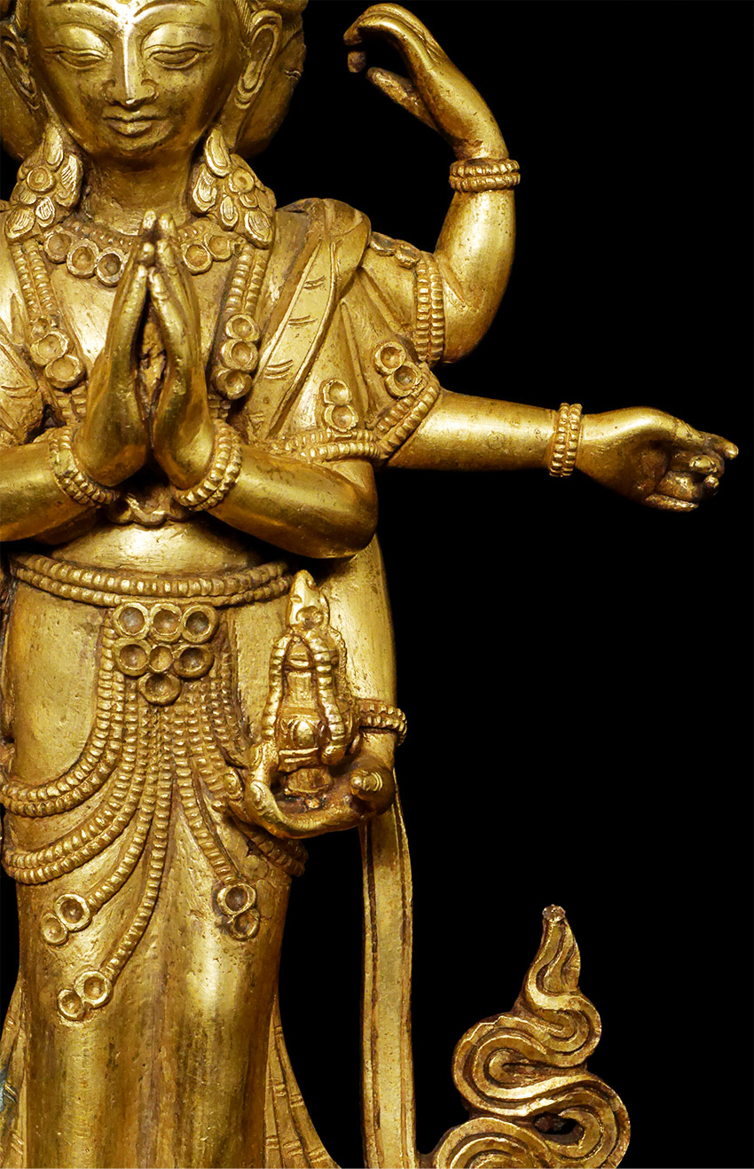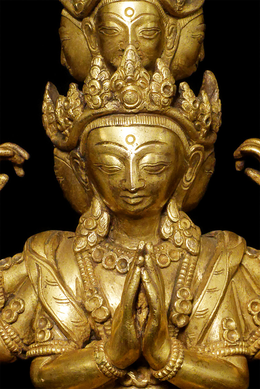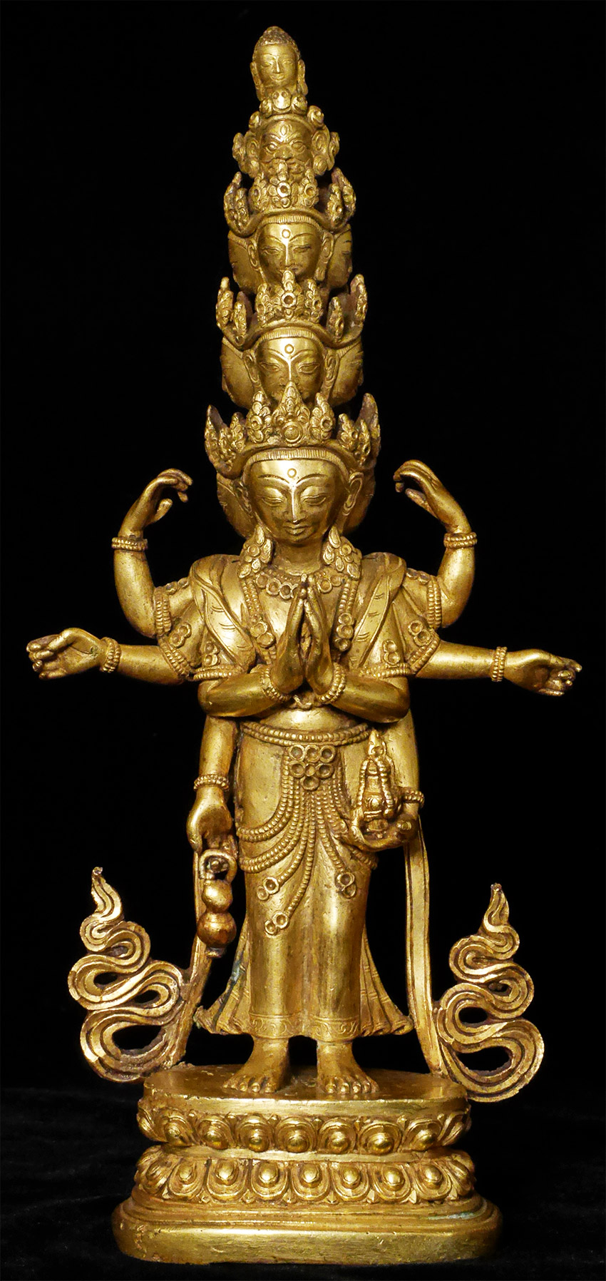 19/20thC Tibetan or Nepalese Bodhisattva of Compassion. Beautiful detail. One ribbon detached from base, otherwise perfect. Stands 11 inches tall and quite heavy for its size. 8 arms, 11 faces total.