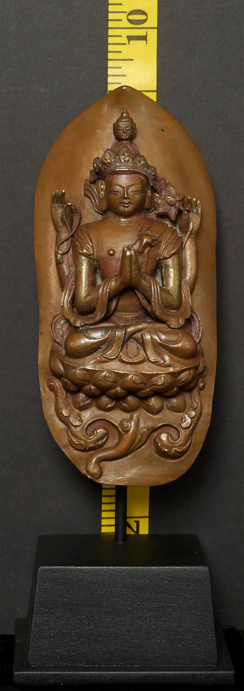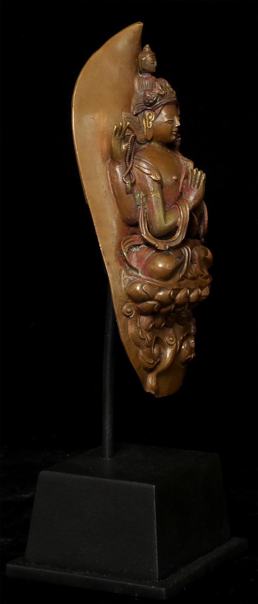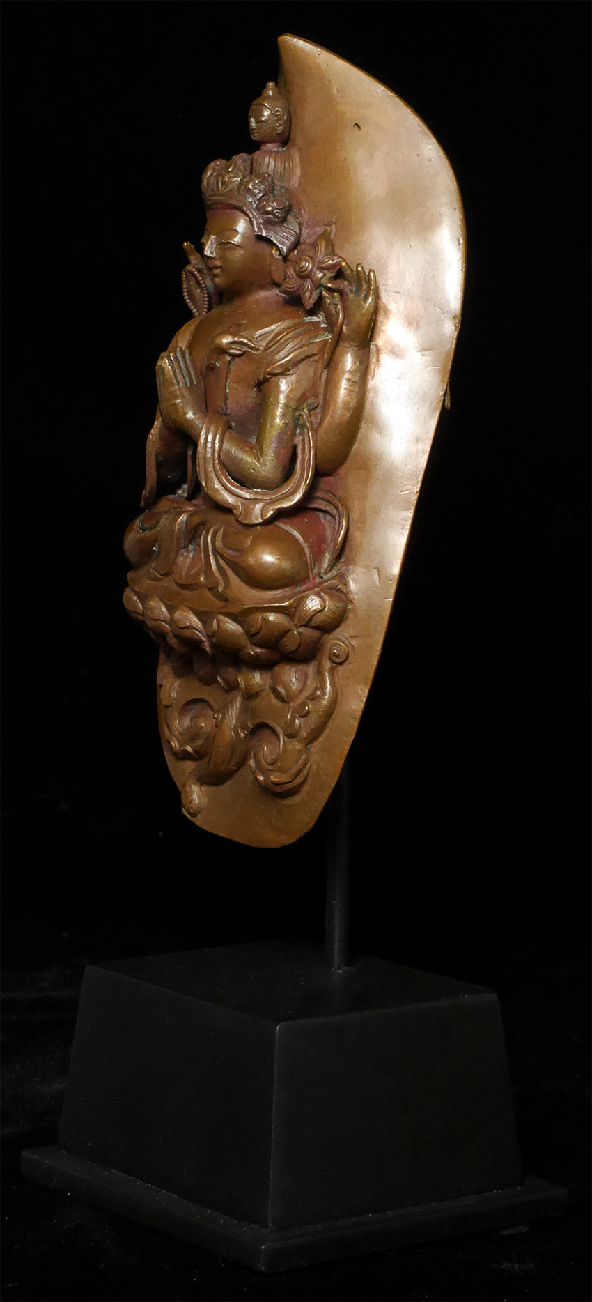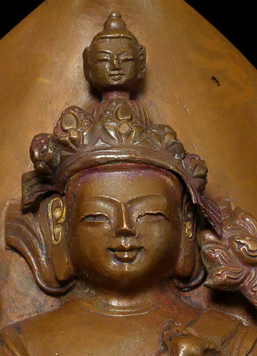 18thC Tibetan copper Repousse Bodhisattva on stylized leaf.- Either from a lotus mandala or a Bodhisattva crown. I've seen several of these over the years. Slight damage to the crown, and would have originally had square nail holes at the bottom corners (now removed). Patina also cleaned. Arms and tiny Buddha head on top are cast separately. Just shy of 6 inches tall, 9 1/8 inches on custom stand.