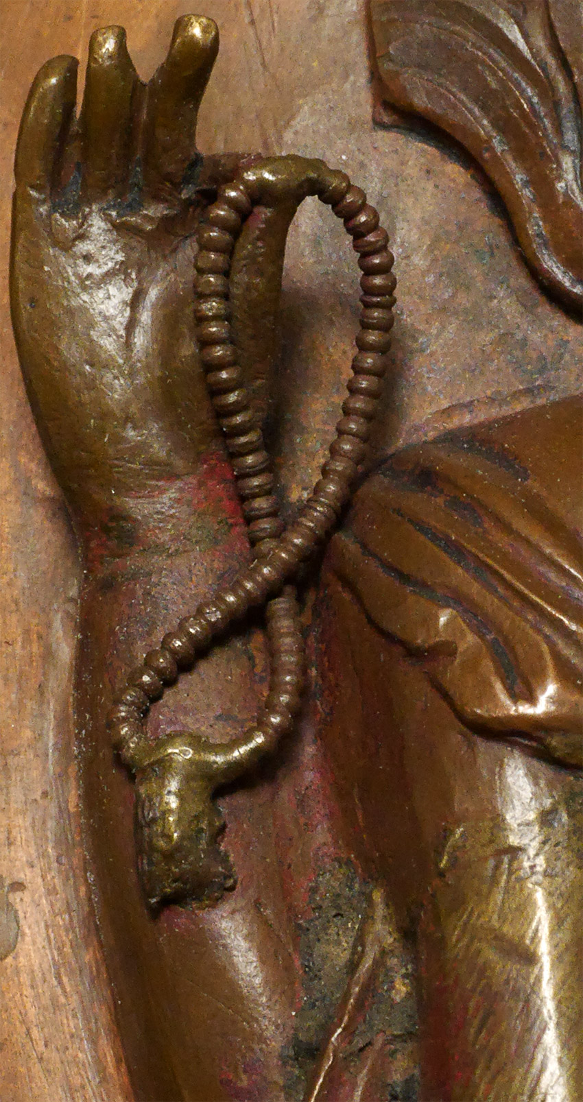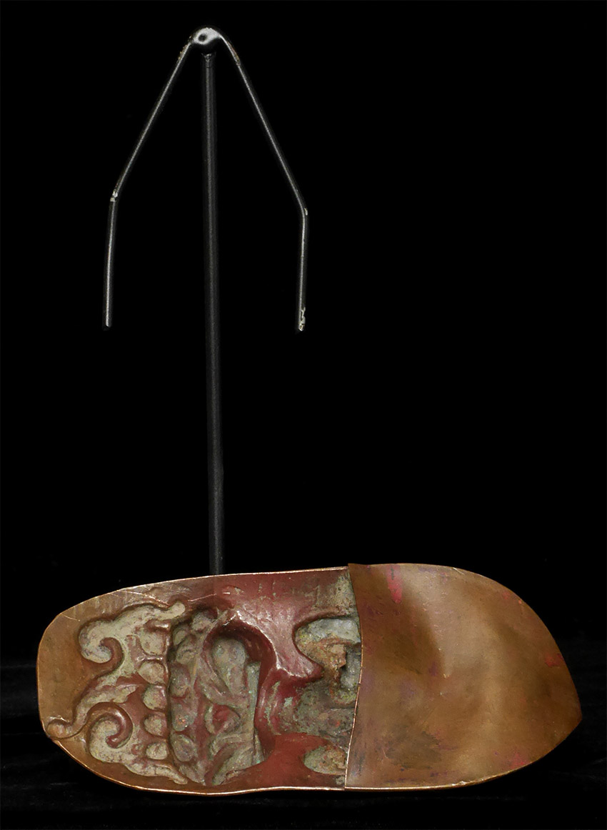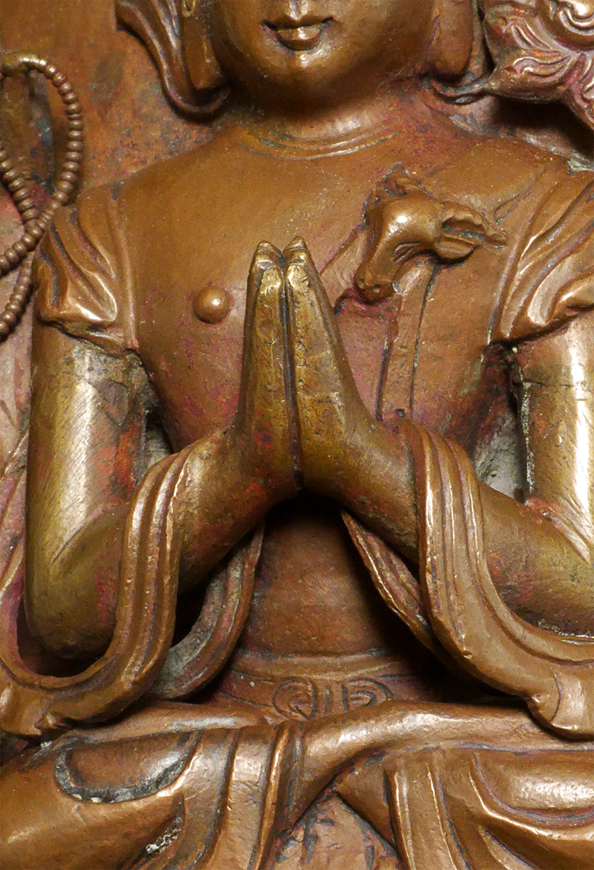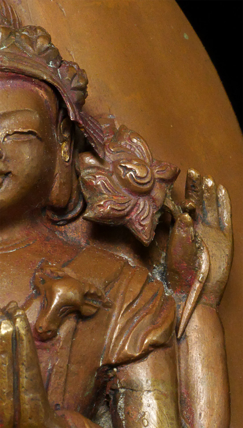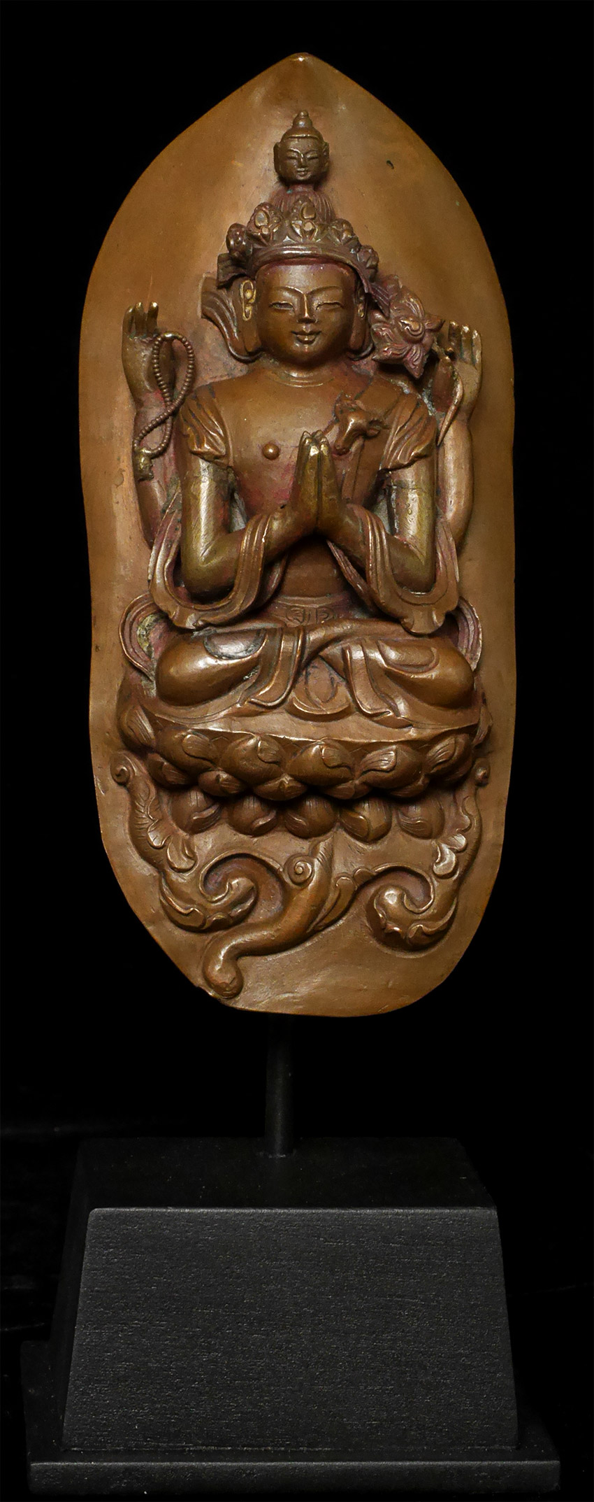 18thC Tibetan copper Repousse Bodhisattva on stylized leaf.- Either from a lotus mandala or a Bodhisattva crown. I've seen several of these over the years. Slight damage to the crown, and would have originally had square nail holes at the bottom corners (now removed). Patina also cleaned. Arms and tiny Buddha head on top are cast separately. Just shy of 6 inches tall, 9 1/8 inches on custom stand.
