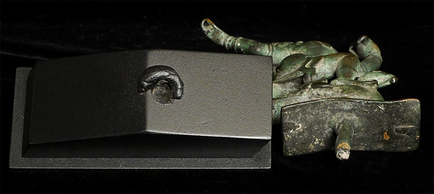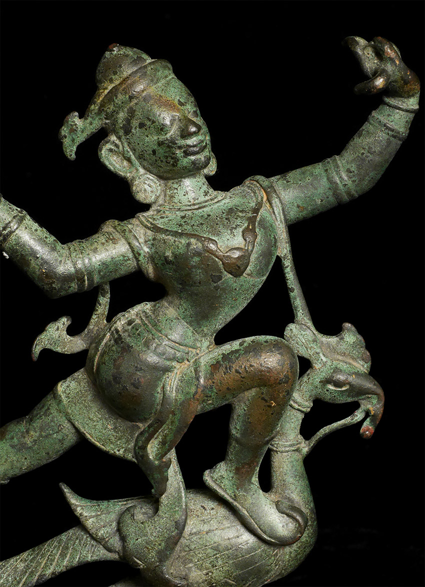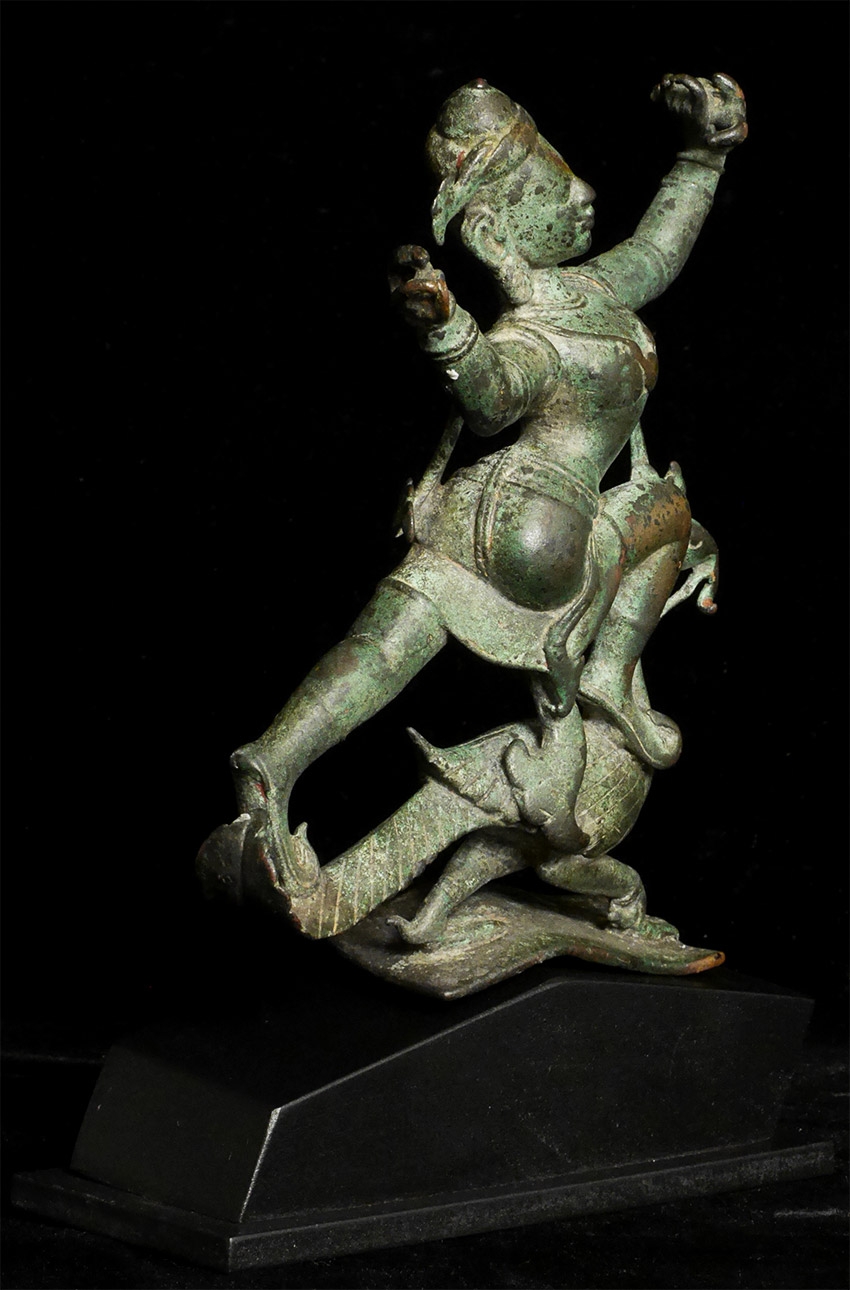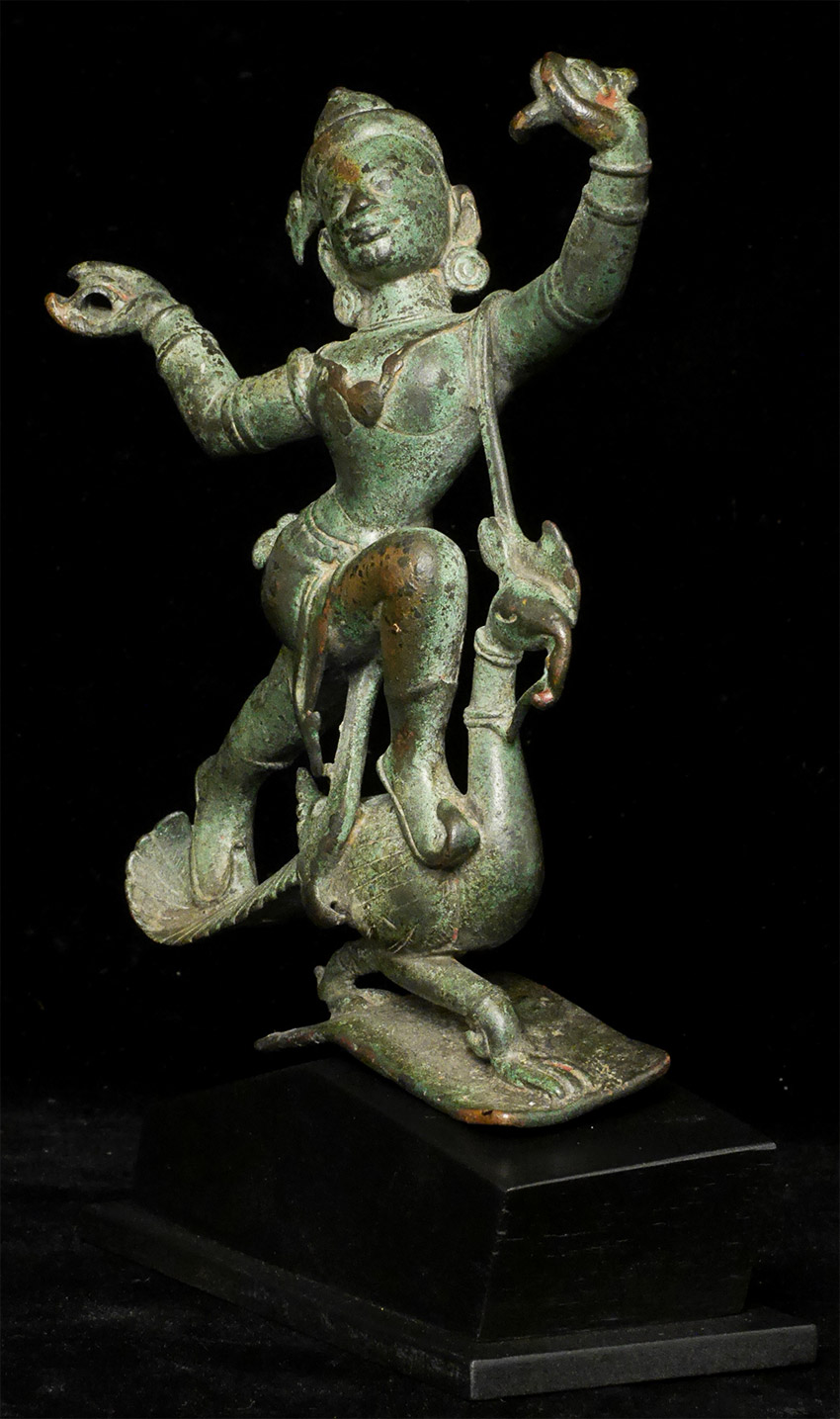6 7/8 inches tall, 8.5 inches on custom stand. Original base has sticker that reads "Skanda or Kartikeya on his peacock charger. Pos Khmer Bayon period 13th century"