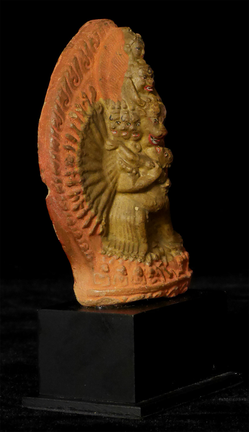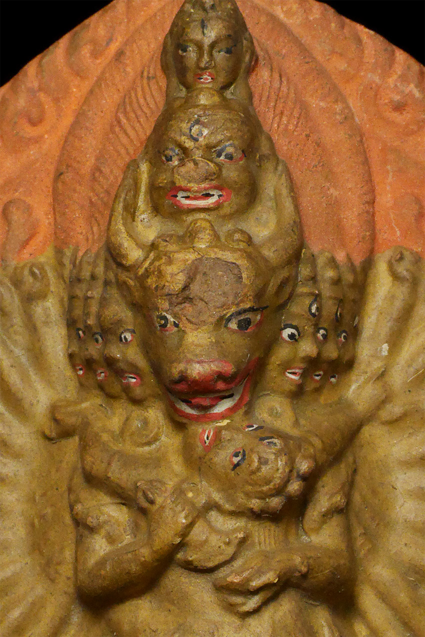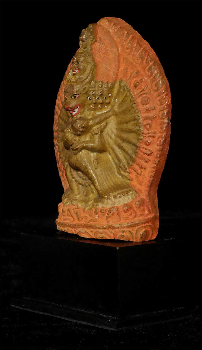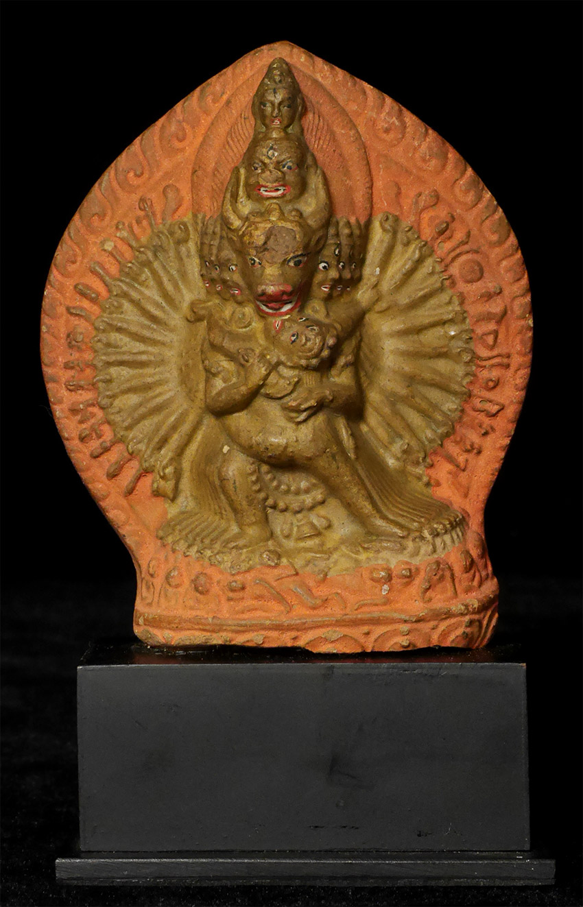 Old Mongolian Clay Tablet of Yamantanka and Consort. 3 3/8 inches tall, 4 5/8 inches on attached base. The condition is as shown in photos. Acquired from a very large Australian collection mostly put together 20+ years ago.