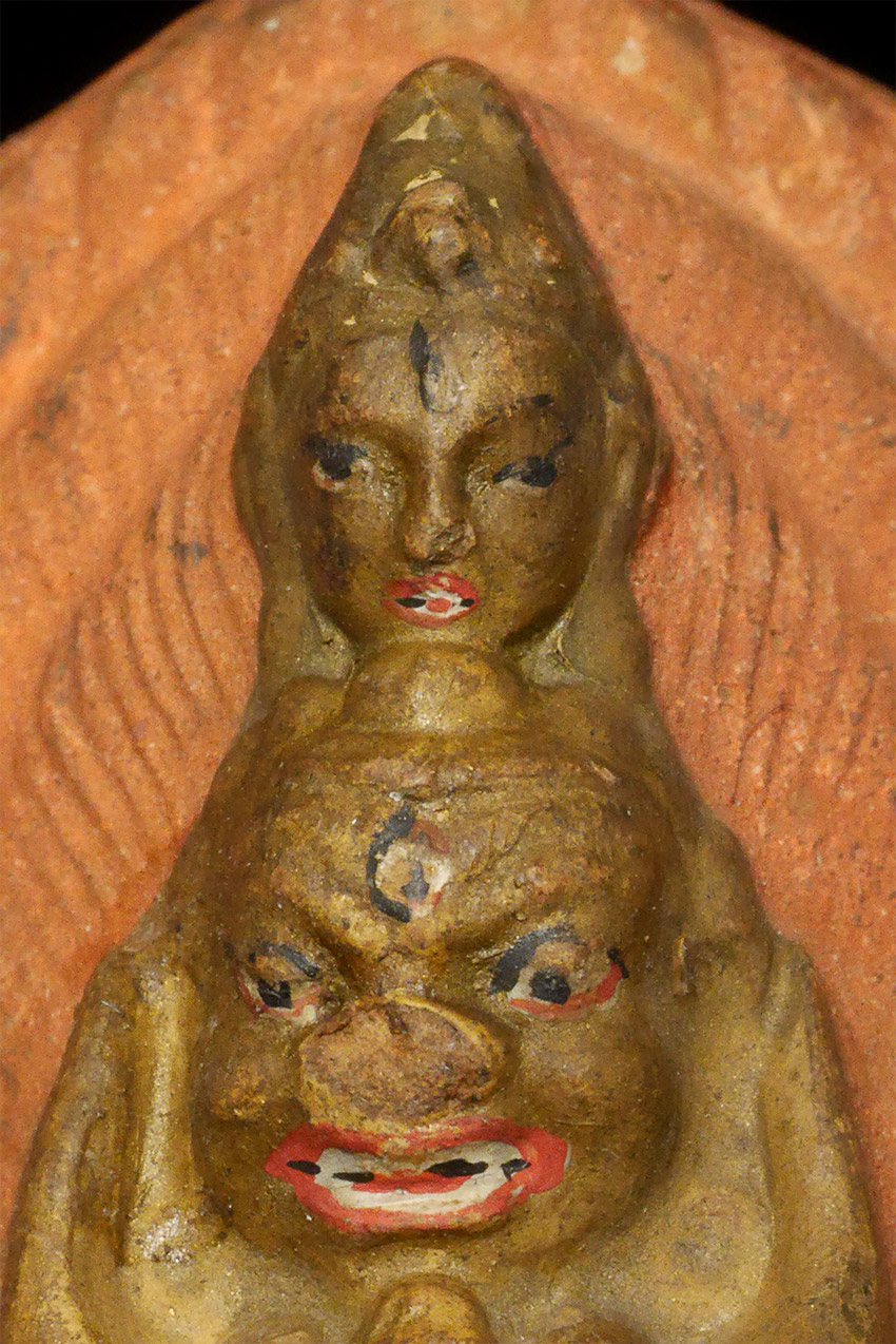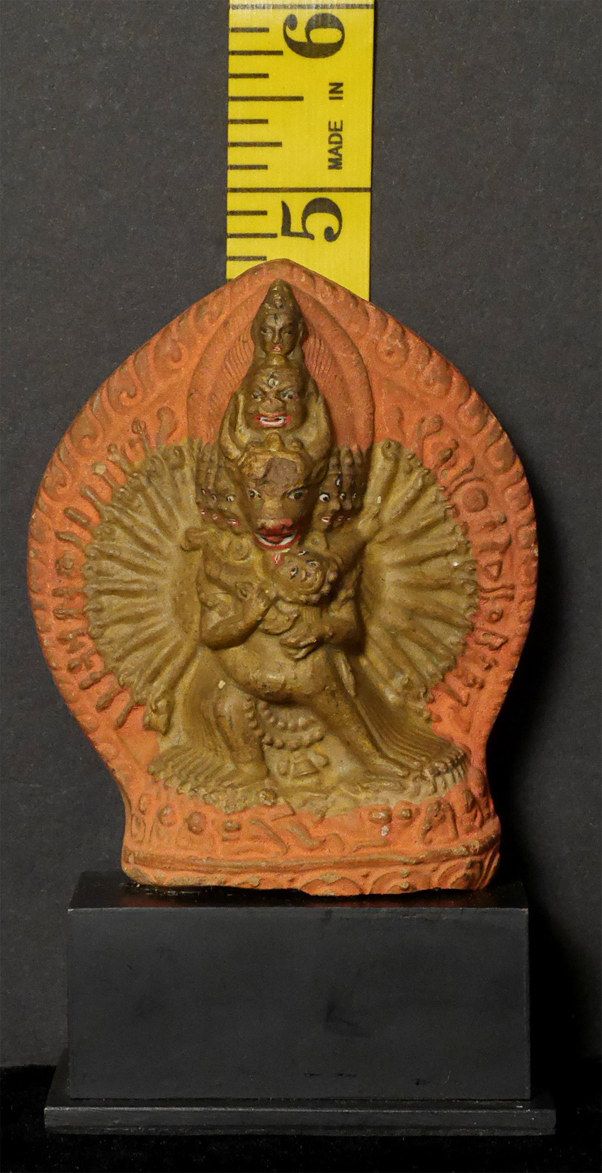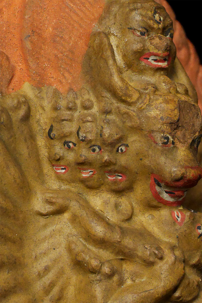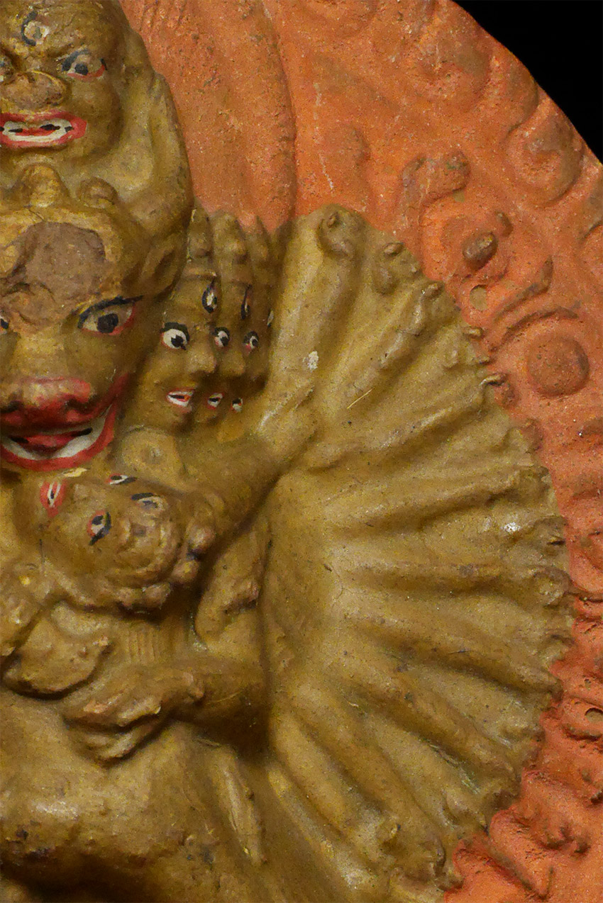 Old Mongolian Clay Tablet of Yamantanka and Consort. 3 3/8 inches tall, 4 5/8 inches on attached base. The condition is as shown in photos. Acquired from a very large Australian collection mostly put together 20+ years ago.