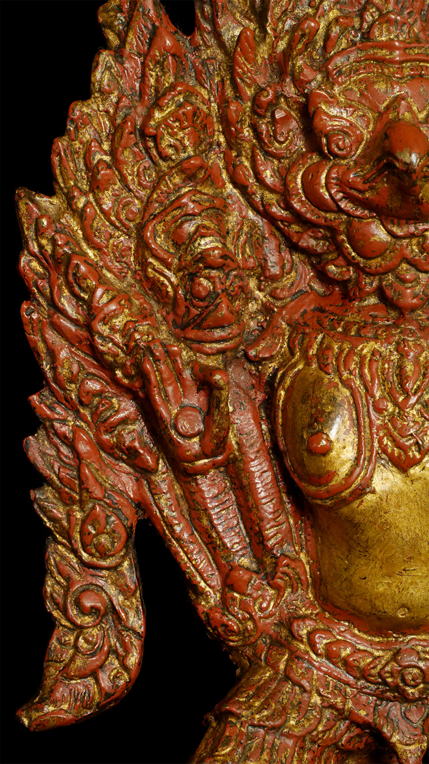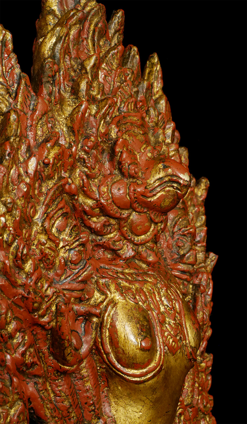 Very heavily cast 11-13thC Cambodian Garuda finial. The remarkablby deep and complx casting is covered with think lacquer and gilding that make it difficult to see the underlying tour de force in casting. There are a number of this quality of this type on the market= almost all have no lacquer or gilding and are green. This is the only one I know of which still has lacquer/gilding. Possible some lacquer/gilding is later, but I if so, underneath are remains of earlier levels. Size is 13 1/8 inches tall on attached stand.