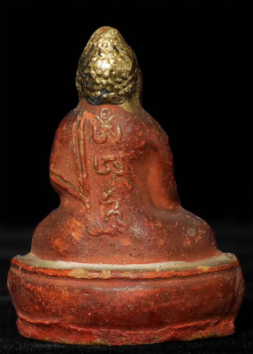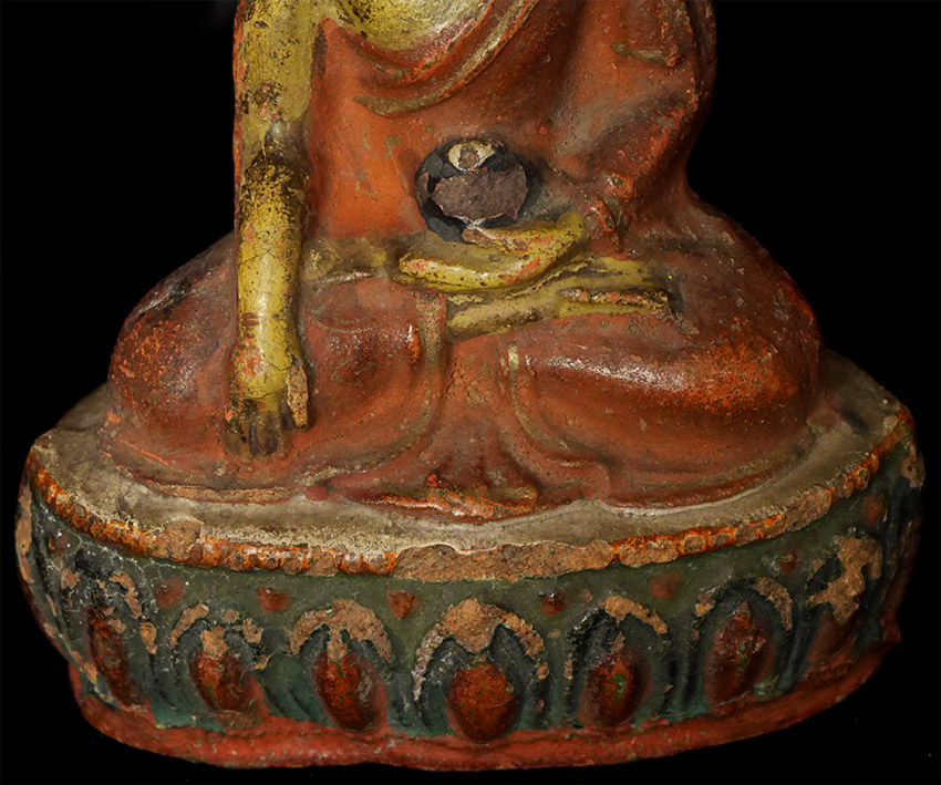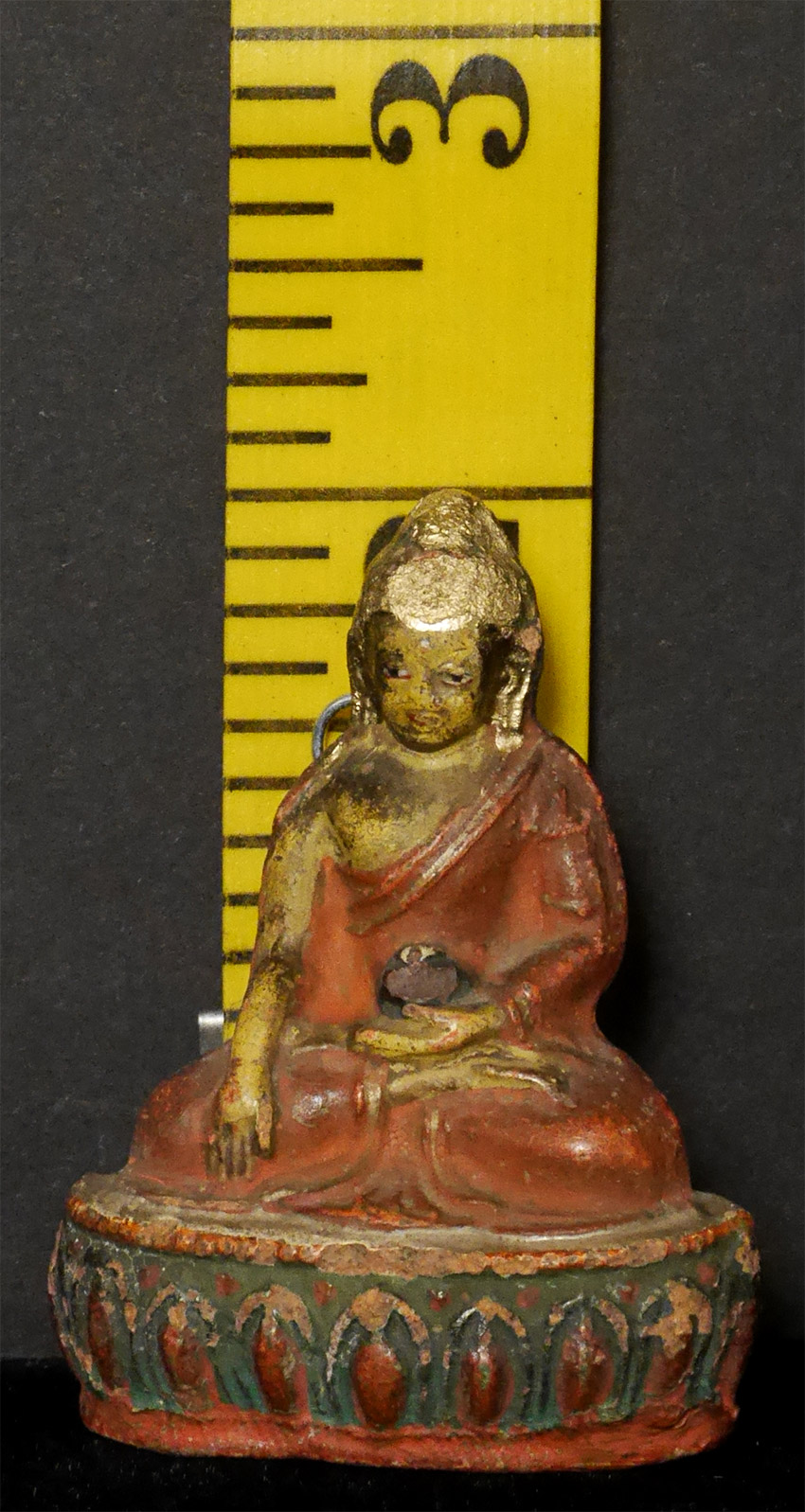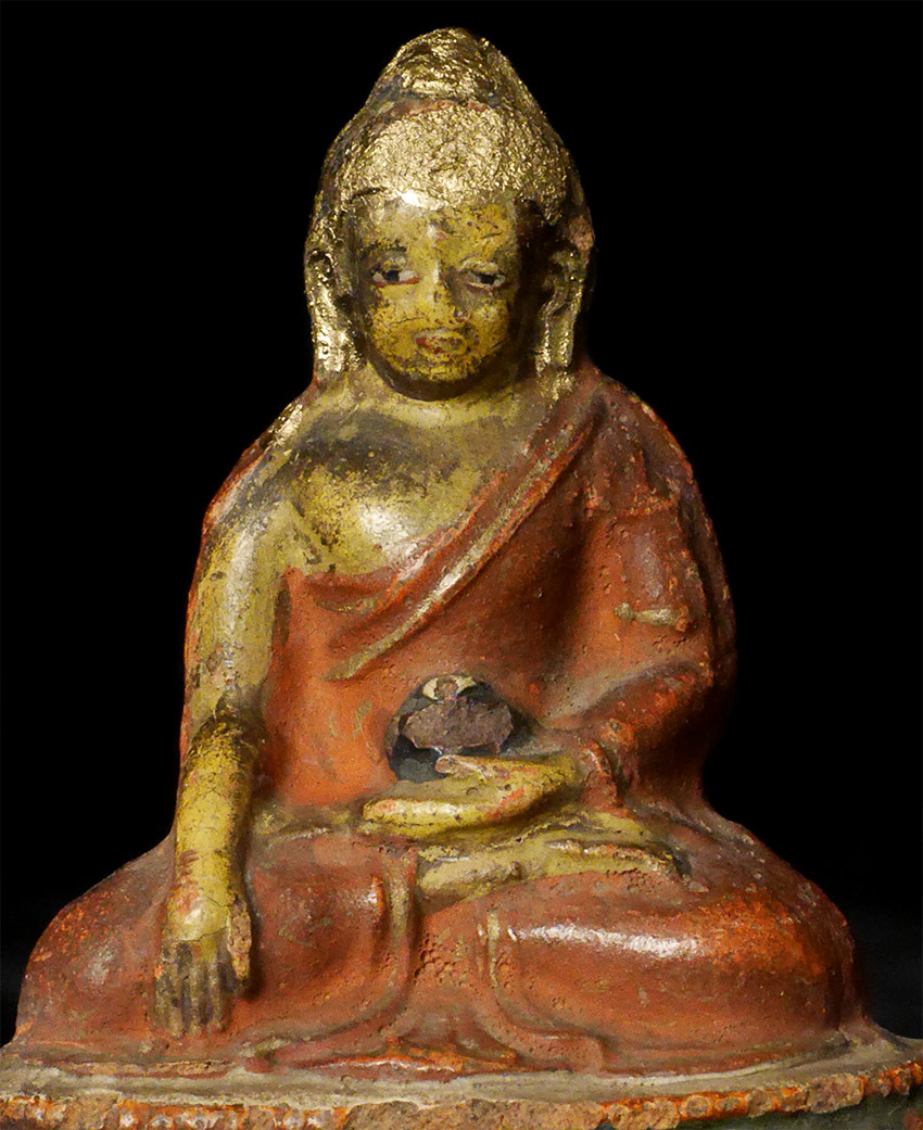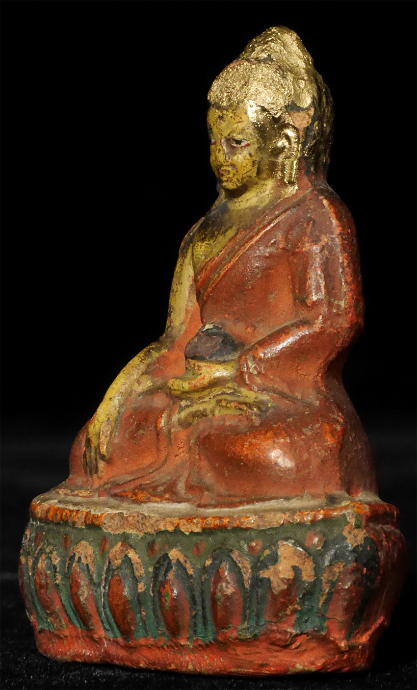 Powerful near miniature Mongilian Medicine Buddha. Looks like top of head and ears were re-gilded. Appears older than 7866. From a very large Australian collection mostly put together 20+ years ago. Measures 2 inches tall.