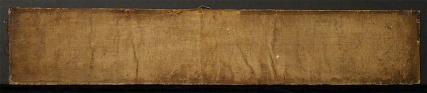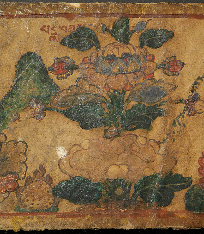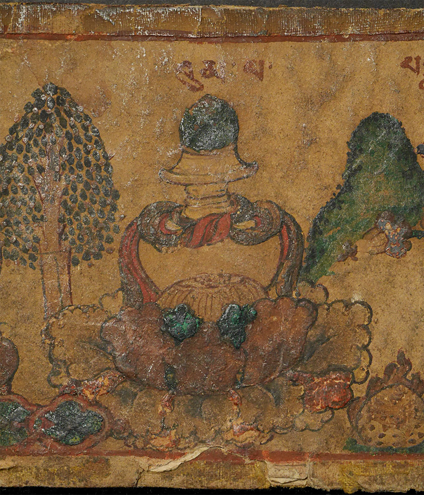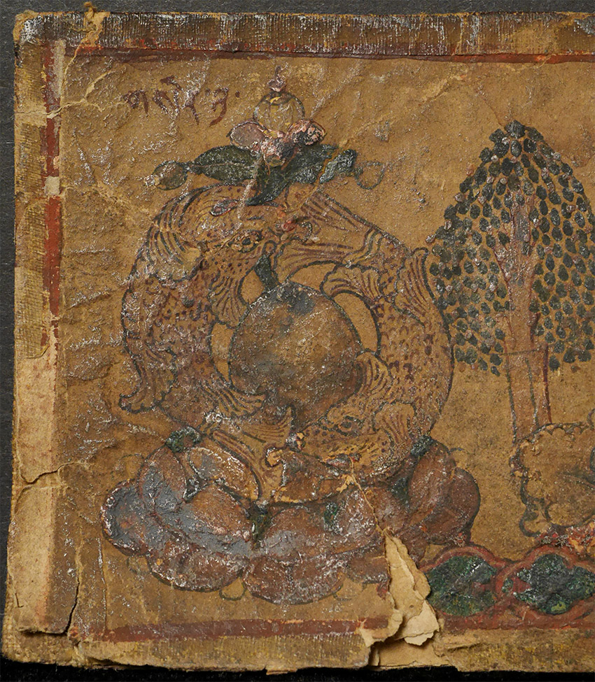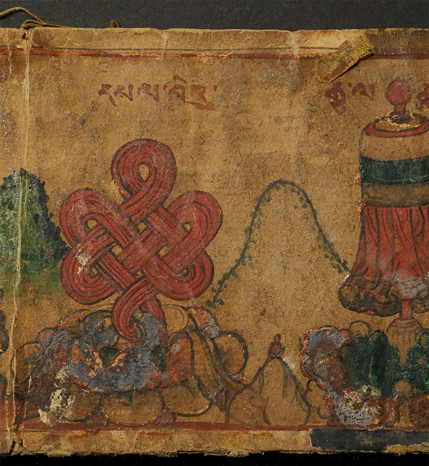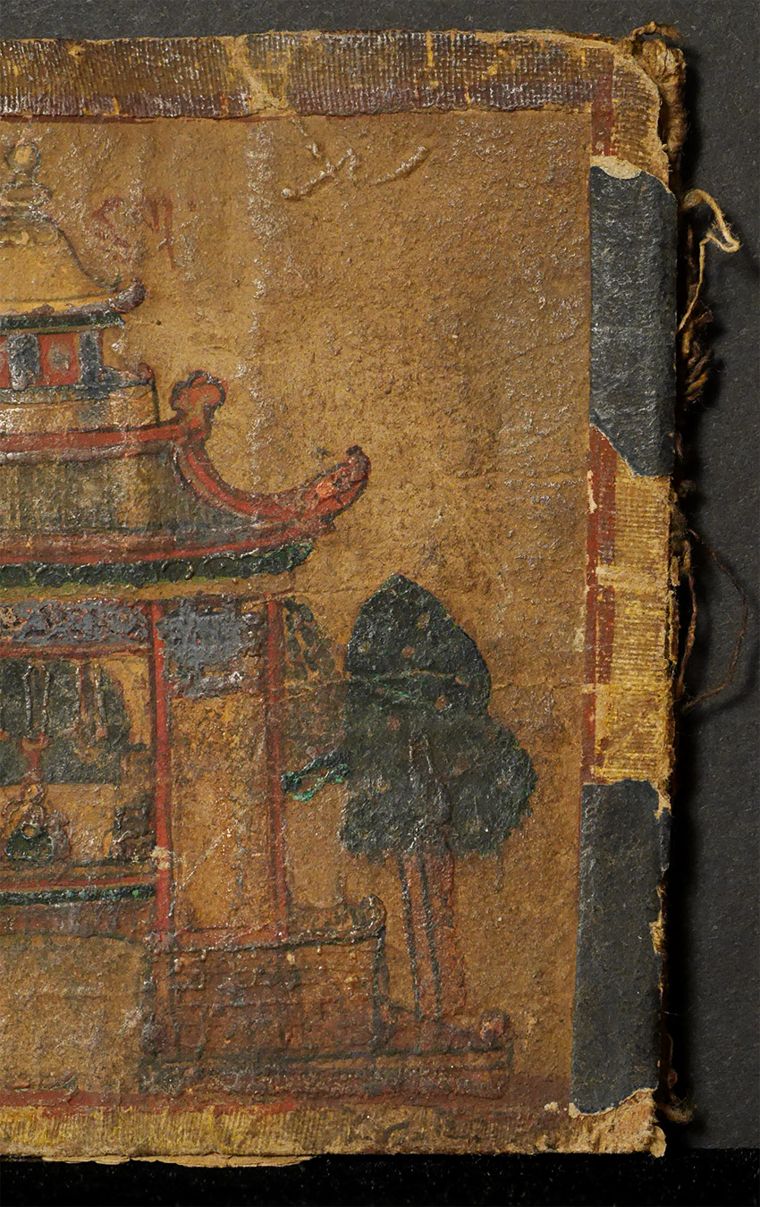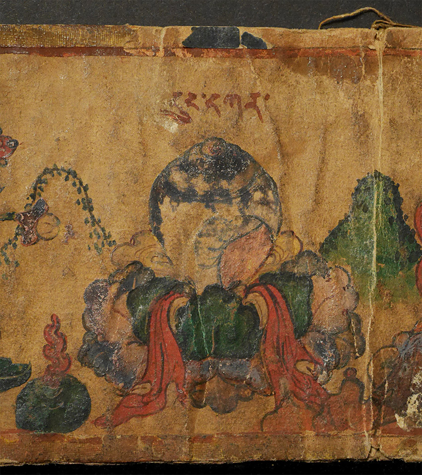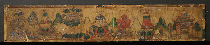 Inside book cover of a Tibetan Sutra. Worn and folds, through the beautiful painting still comes through. Size is 2 .25 inches tall, 17.25 inches wide.