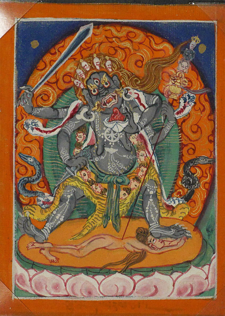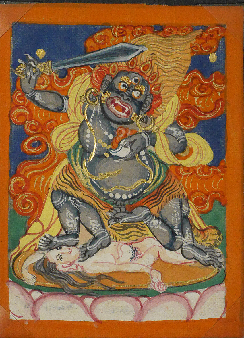 Three painted mini-thangkas. They are teaching cards that were originally part of a large set. They are in the neighborhood of 100 years old. I bought a group of these 25 years ago and these 3 and the other 3 being listed concurrently are the last ones I have available to offer for sale. The blue sky is ground lapis and sparkles in the light. The condition is extraordinary, and the art work is excellent. It is only 2.25 x 2.75 inches in size, which makes it all the more remarkable.