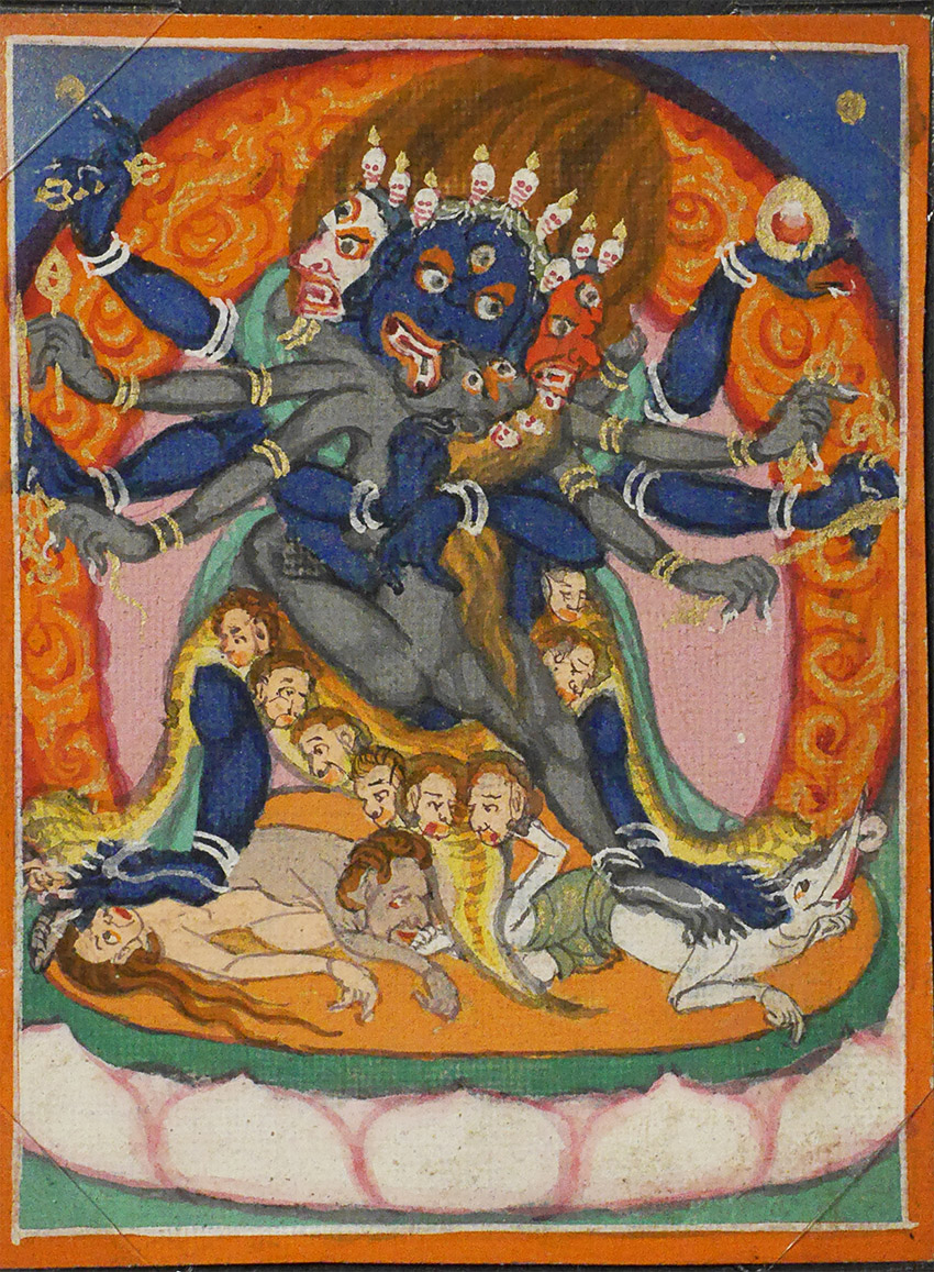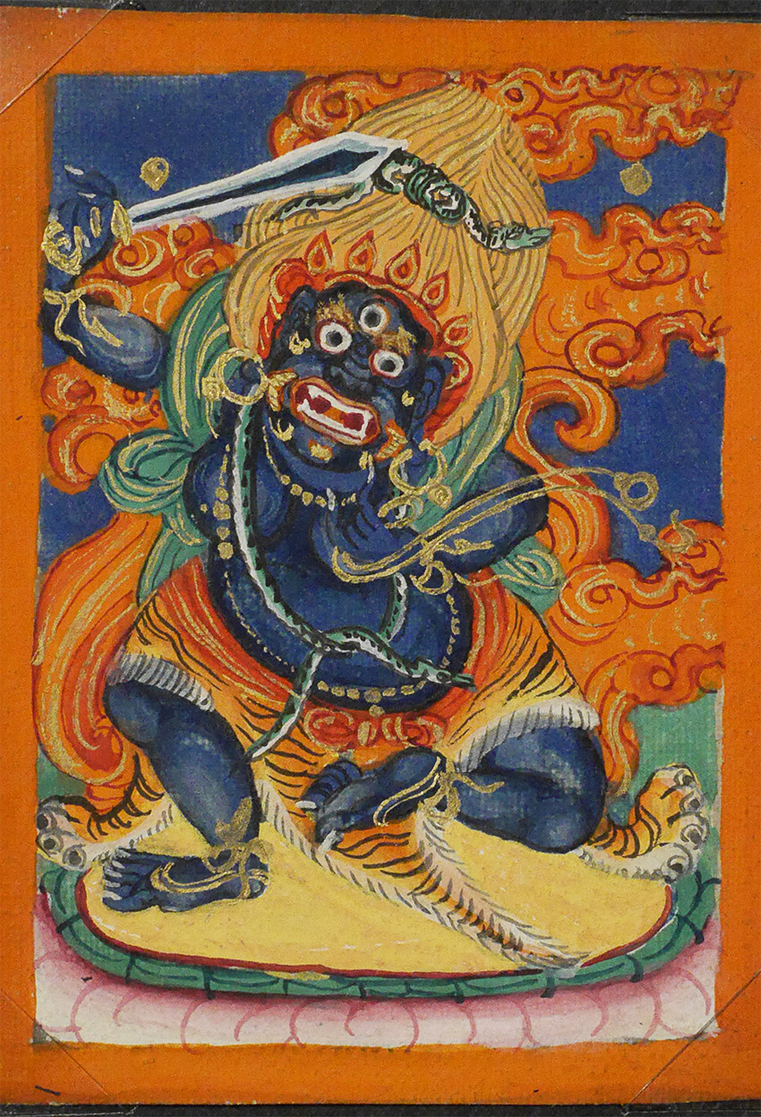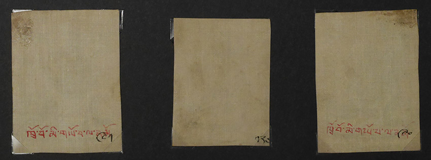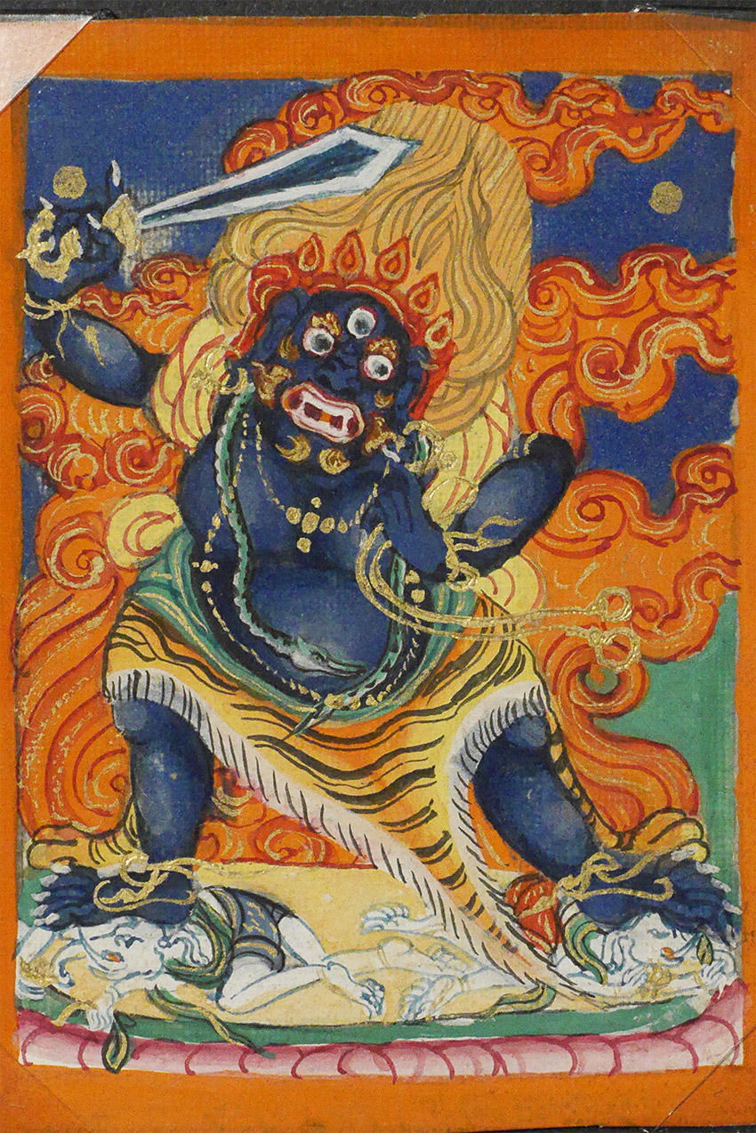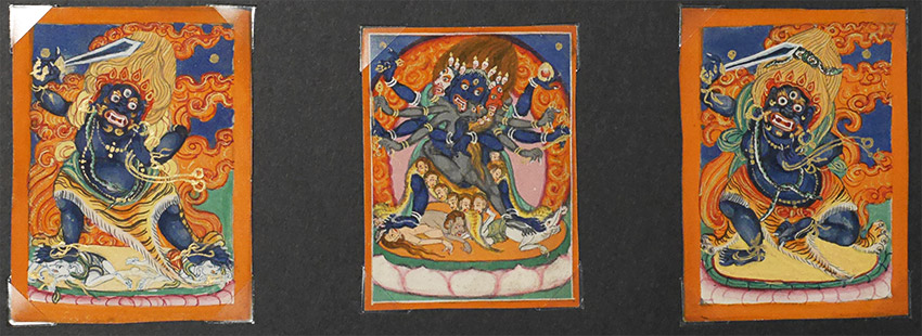 Three painted mini-thangkas. They are teaching cards that were originally part of a large set. They are in the neighborhood of 100 years old. I bought a group of these 25 years ago and these 3 and the other 3 being listed concurrently are the last ones I have available to offer for sale. The blue sky is ground lapis and sparkles in the light. The condition is extraordinary, and the art work is excellent. It is only 2.25 x 2.75 inches in size, which makes it all the more remarkable.