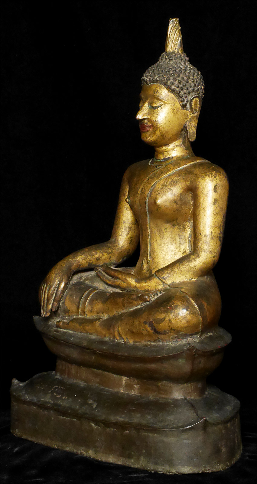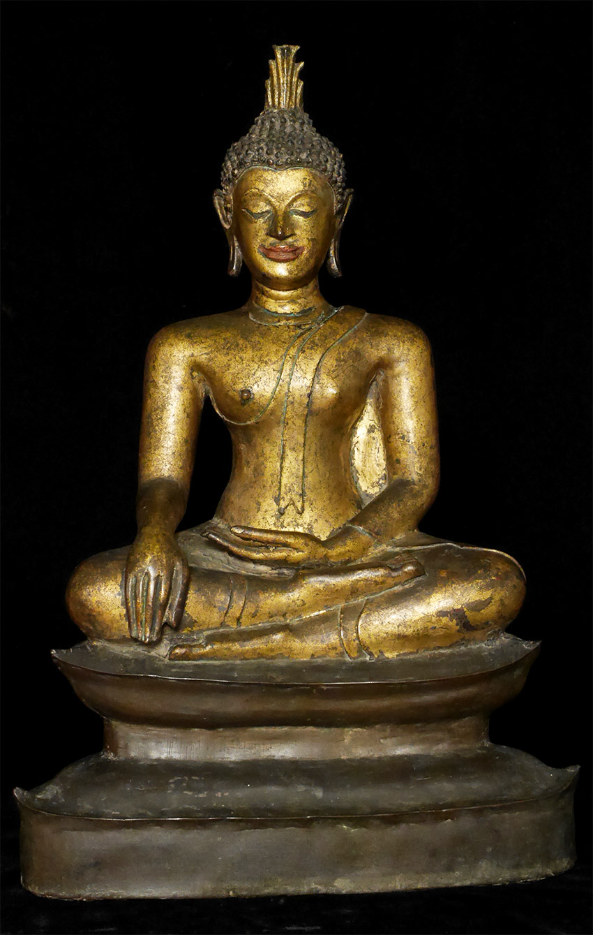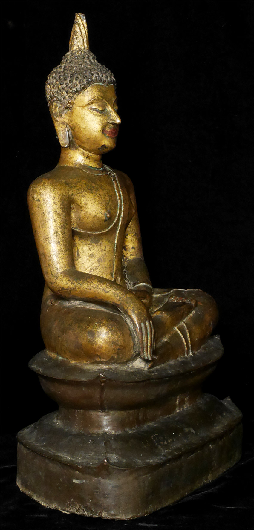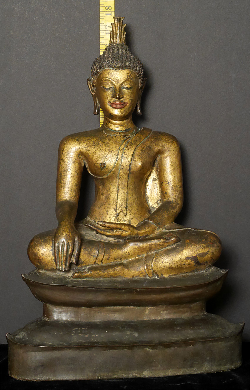 Large Northern Thai or Laos Buddha with very good age- in the range of 16/17thC. Great personality and deep concentration. Maybe a chip to the top of the finial, but this type is made flat on the very top. 17.75 inches tall. Haven't seen one of this type this nice in this size in a long time.