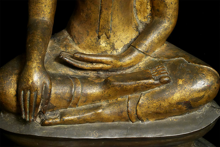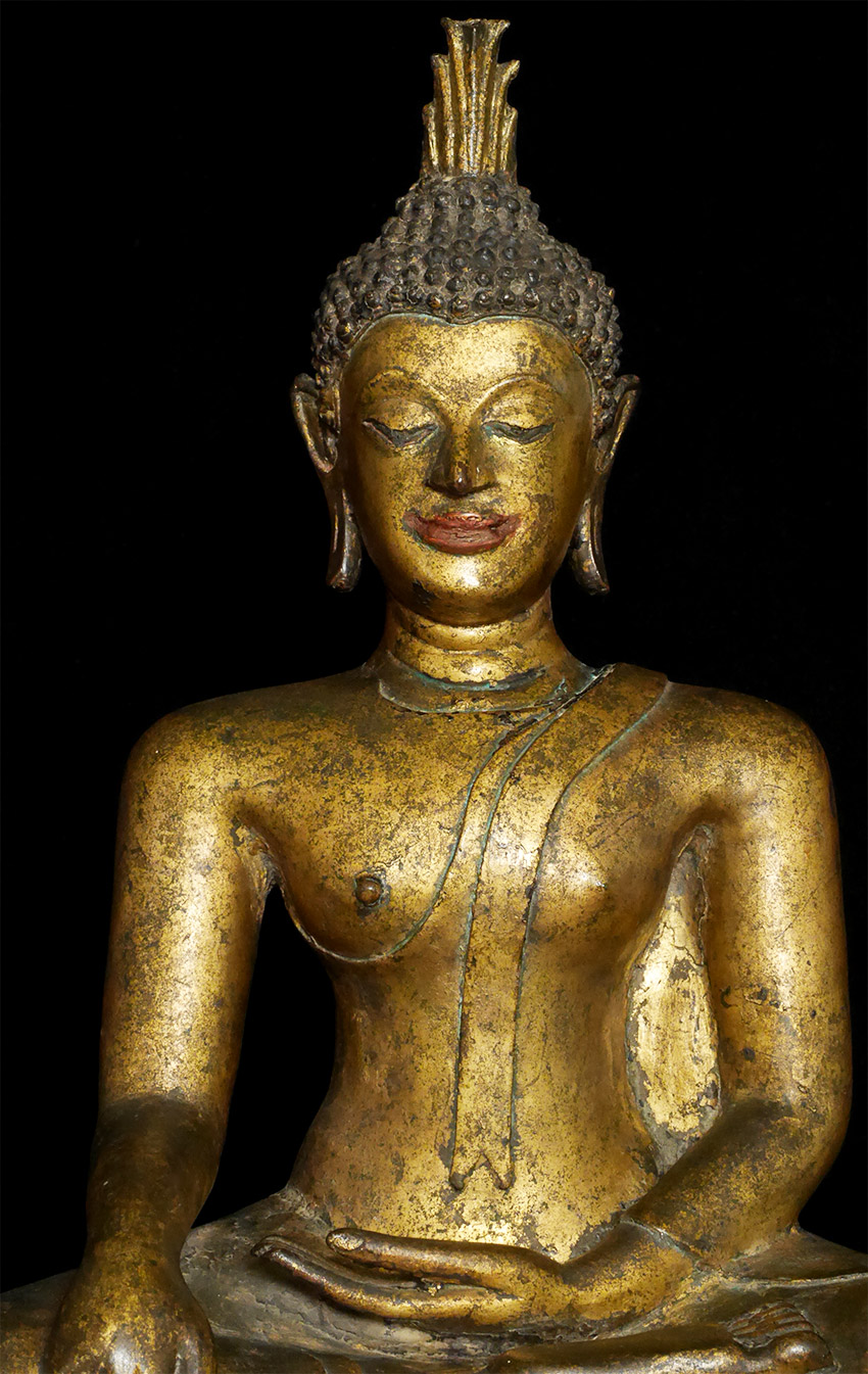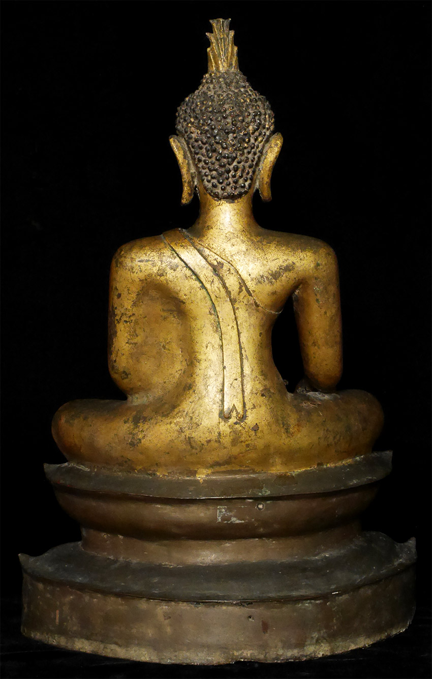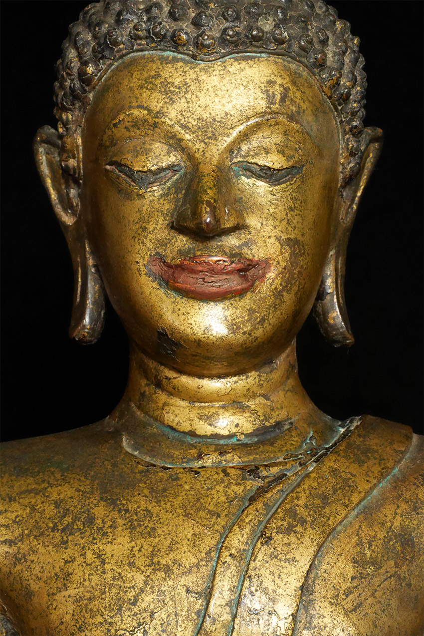 Large Northern Thai or Laos Buddha with very good age- in the range of 16/17thC. Great personality and deep concentration. Maybe a chip to the top of the finial, but this type is made flat on the very top. 17.75 inches tall. Haven't seen one of this type this nice in this size in a long time.