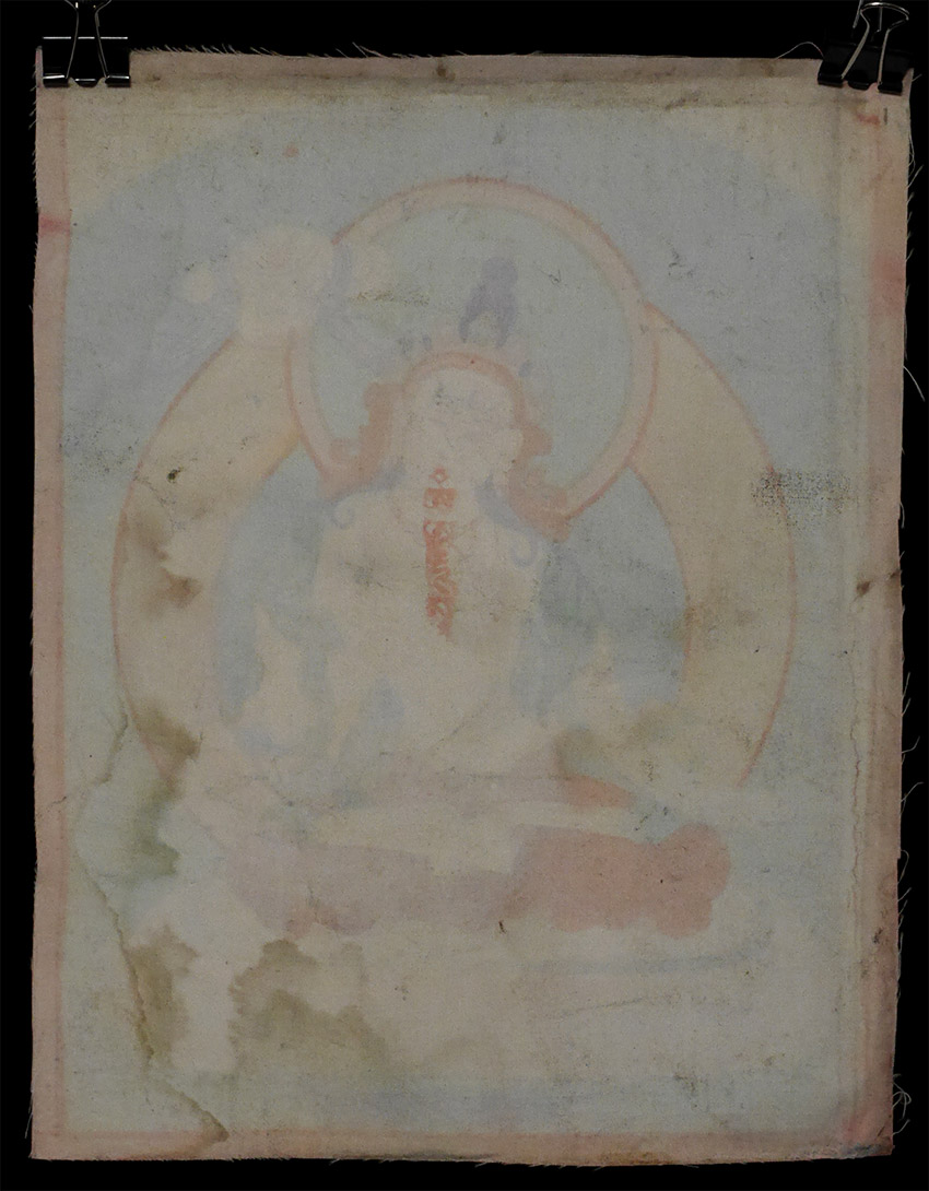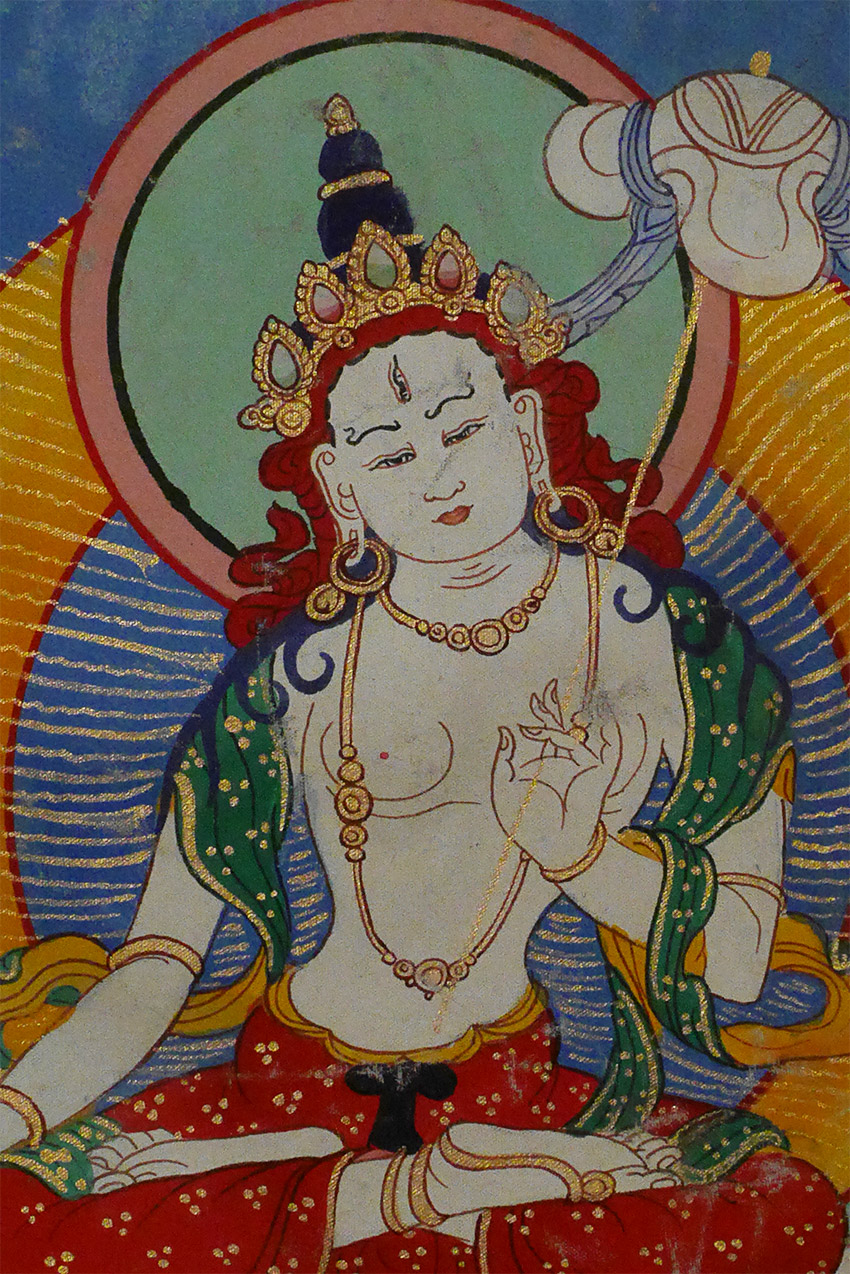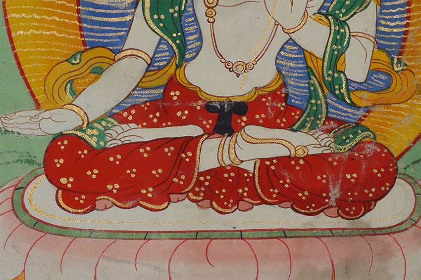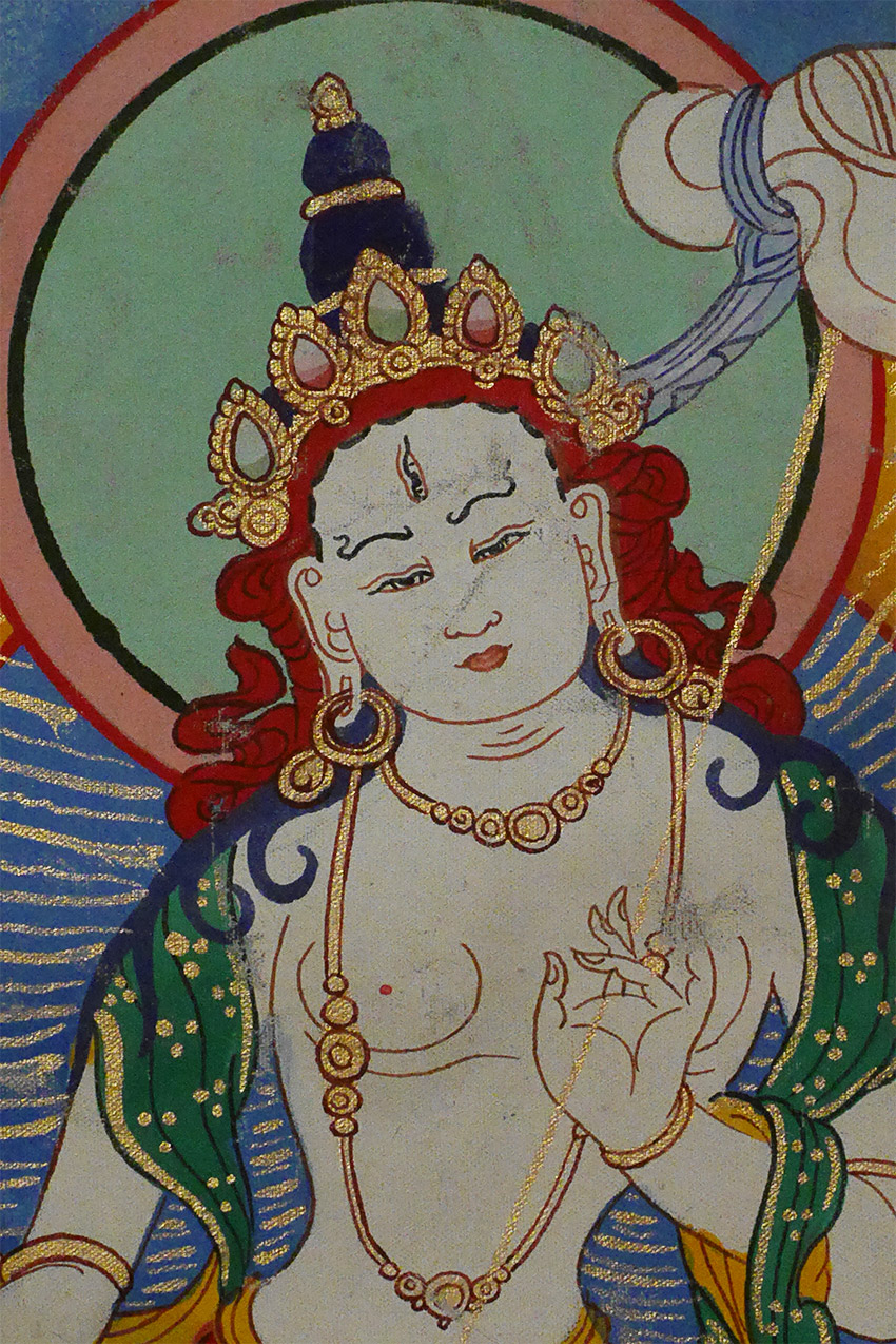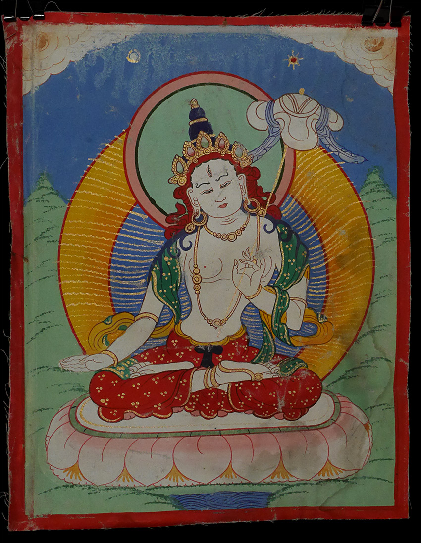 Tibetan or Mongolian antique thangka of White Tara, Measures 7 5/8 x 9 5/8 inches. Beautiful! Some creases- otherwise superb in every way.