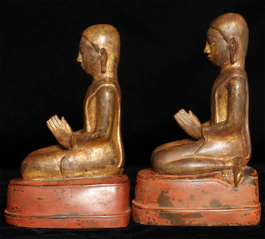 Antique Burmese Shan Style Bronze Monks. The taller of this near pair is 9 inches tall. Black stands included.