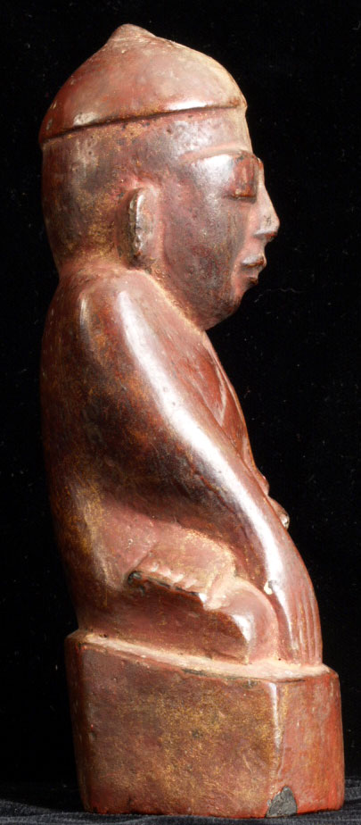 Fabulous "Lotus Buddha" traditionally thought to protect the home and keep it safe, especially from fire. This is one of the very best. I've put ceramic as the material, but I have no idea- I actually think he is probably horn. I know that it is strange that I cant't tell between such disparate materials, but this is a very singular object, and I want to be accurate. Powerful, wonderful face, and strong feel. Note the snail on the bottom. Sits 5.75 inches tall. Very special!