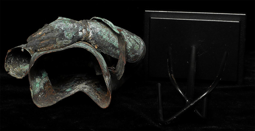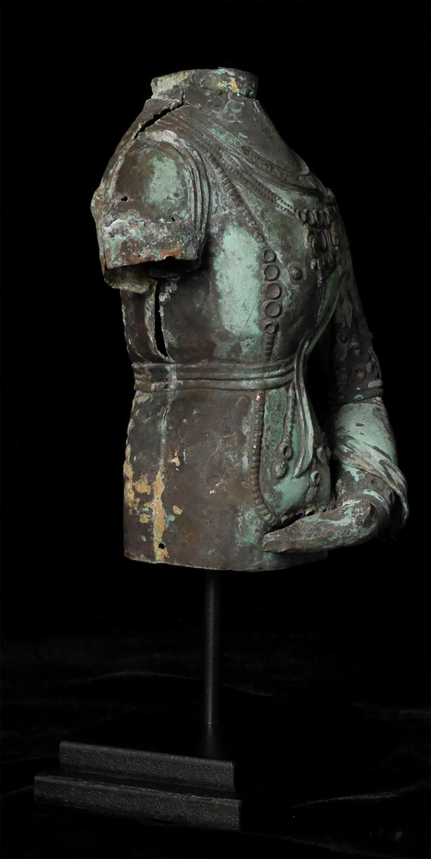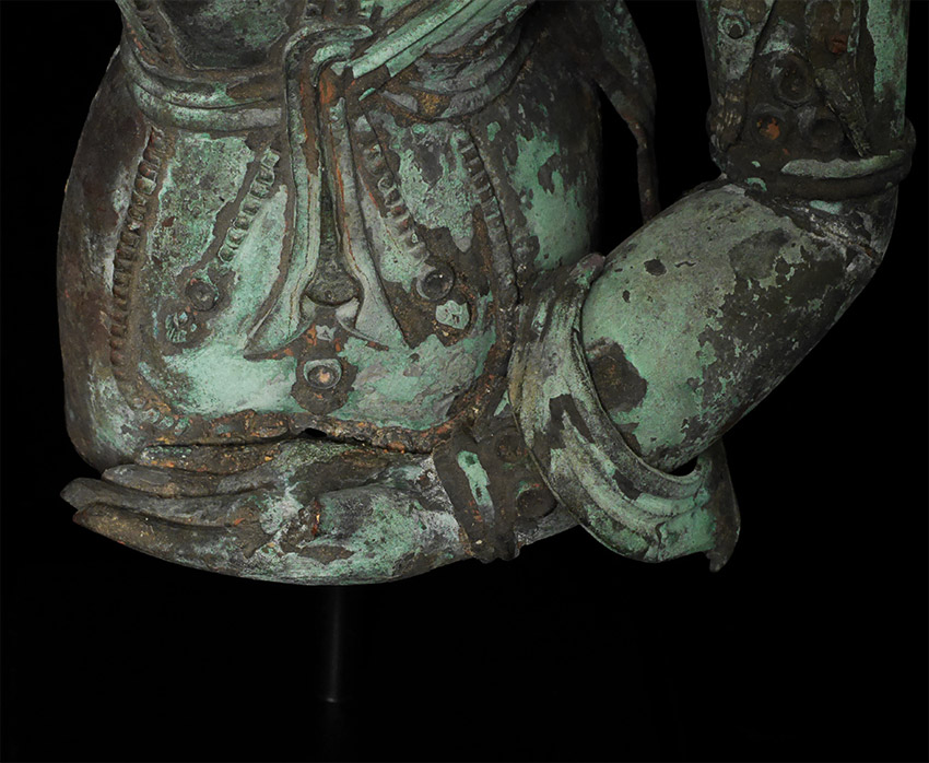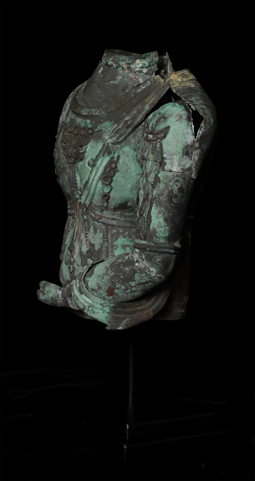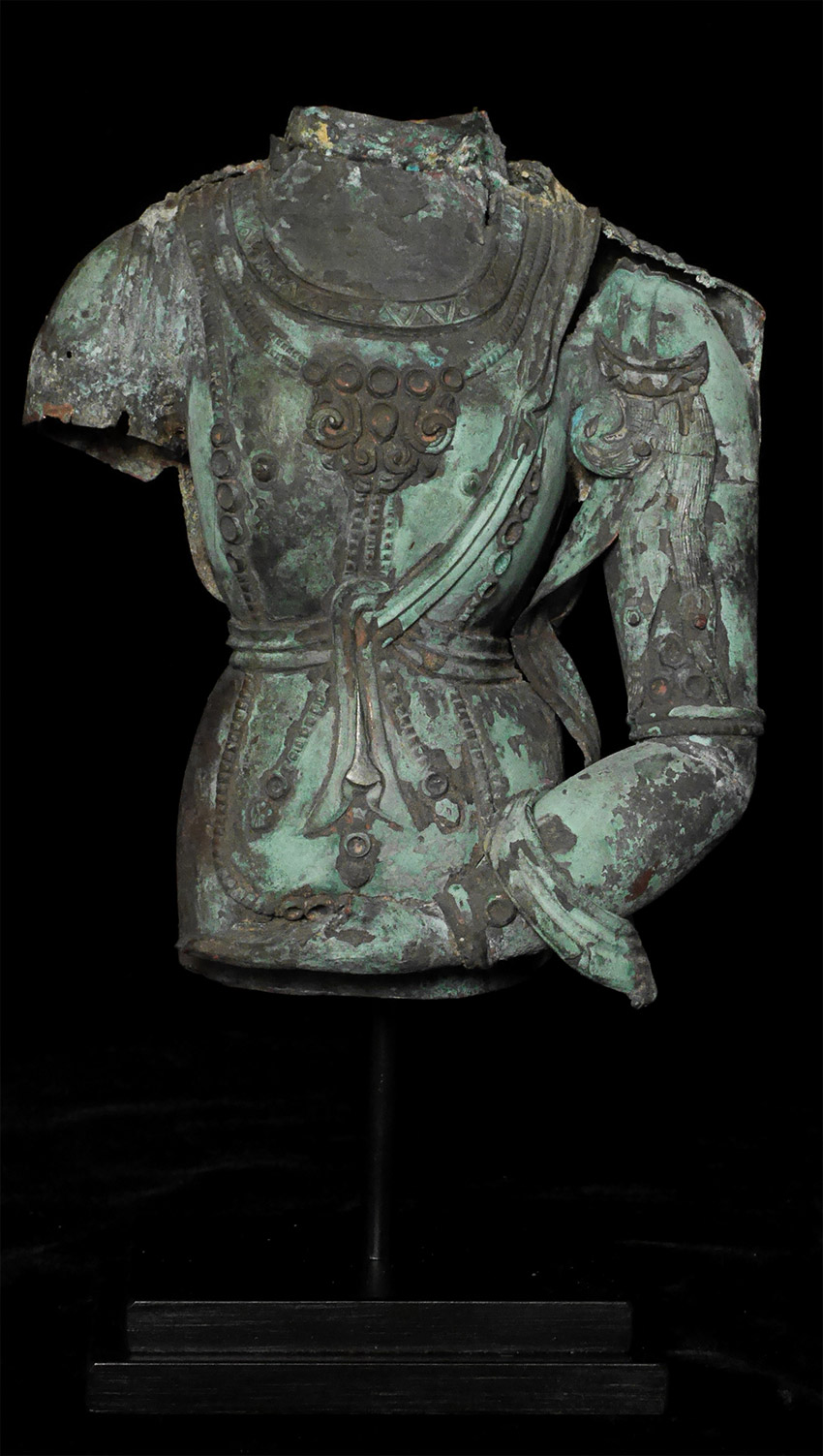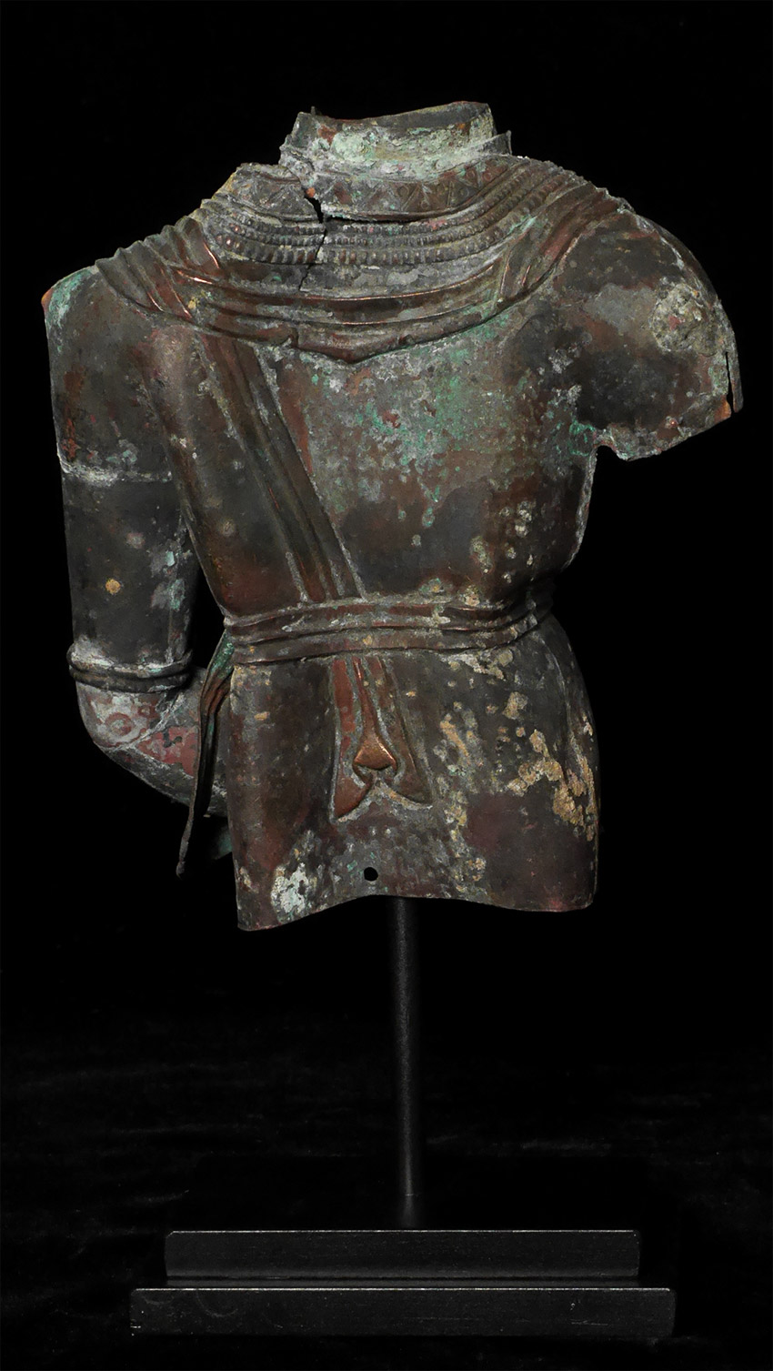 Beautiful 18thC Mongolian copper repousse torso of Buddha or Bodhisattva. Nice size - 5.75" tall, 8.75 inches on custom stand. Superb, complex, and sophisticated- would have been a world class piece. Probably destroyed when the Russians marched through and destroyed over 1000 temples in a day in the 1920's. Found with a metal detector in the 1990's.