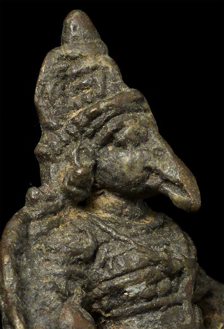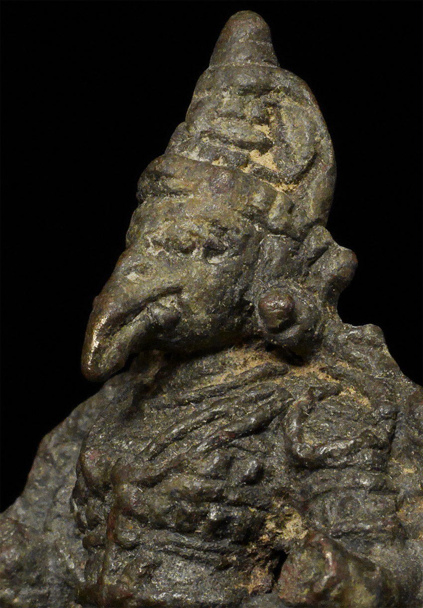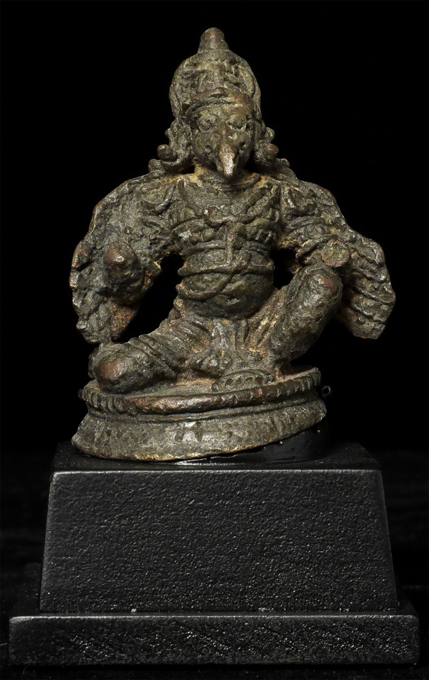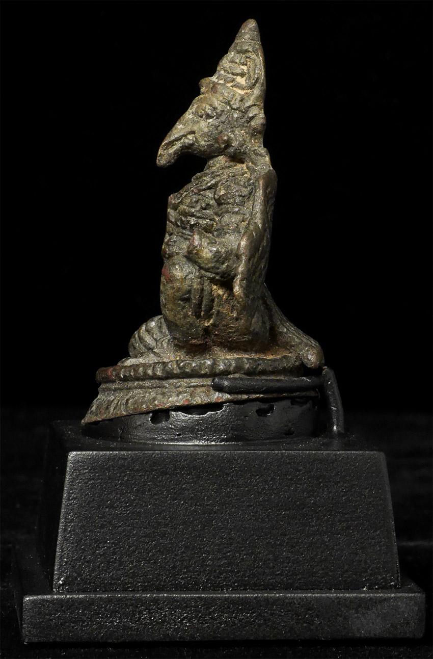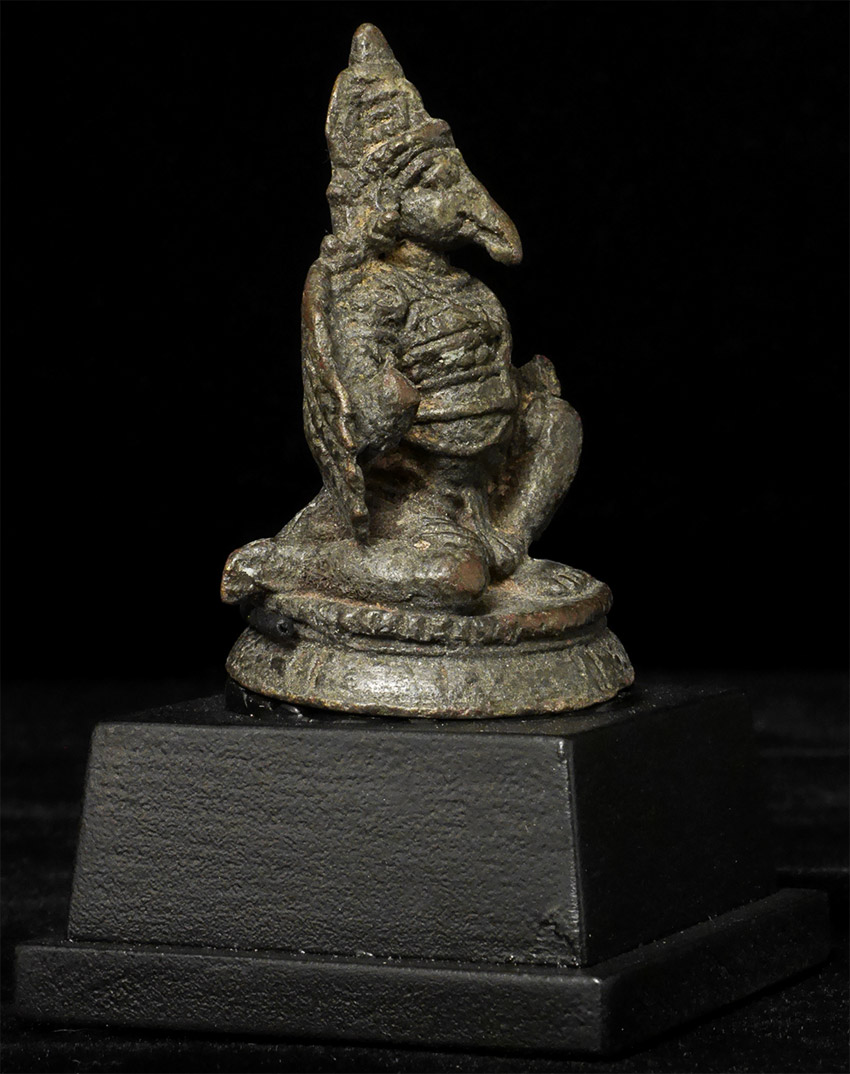 Fabulous Early Garuda is 2.25" tall and full of character. Height on custom stand is 3.5 inches. I do not know where he is from or when he was made, though clearly quite old. Recent study suggests this may be a rare 14thC Indonesian (Majapahit) Garuda from Java.