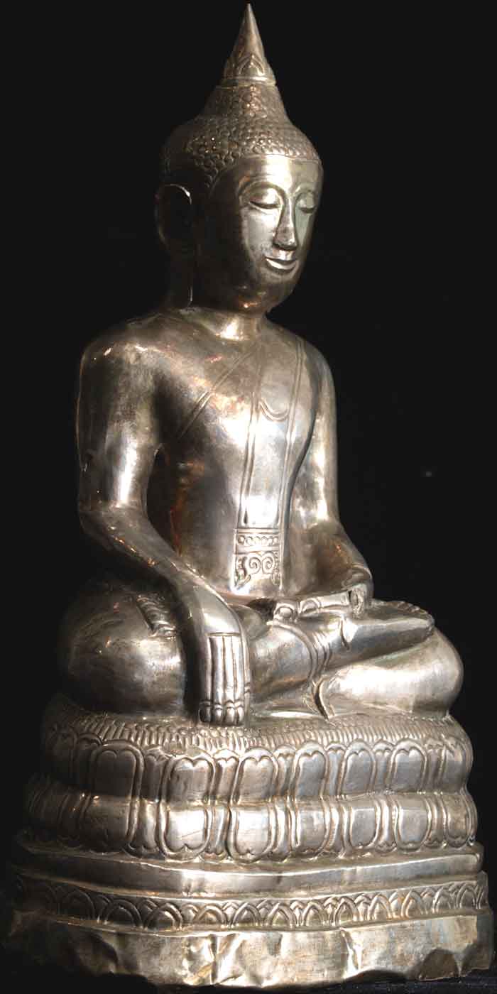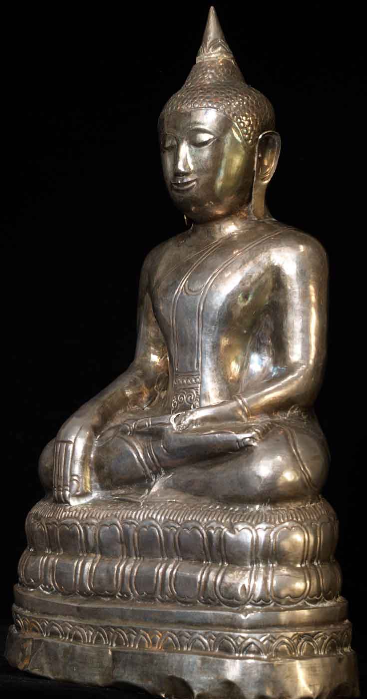 High quality 18thC Thai late Ayutaya Buddha with Burmese influence. This is a lovely thick silver sheet over clay and rock core Buddha- much more substantial then the small wafer thin beat up small old Thai silver Buddhas you sometimes see up for auction. You also sometimes see the new copies- this is not one of them either. . This is a large and lovely (10 full inches tall by over 5.5 inches wide by 3.5 inches deep. Heavy at over 48 ounces. Buddha crafted probably between 1750 and 1800. . In outstanding condition- in part because the silver sheeting is reasonably substantial. Some expectable dents, especially to the lower base at the very bottom. The bottom shows the original clay core and pebbles.