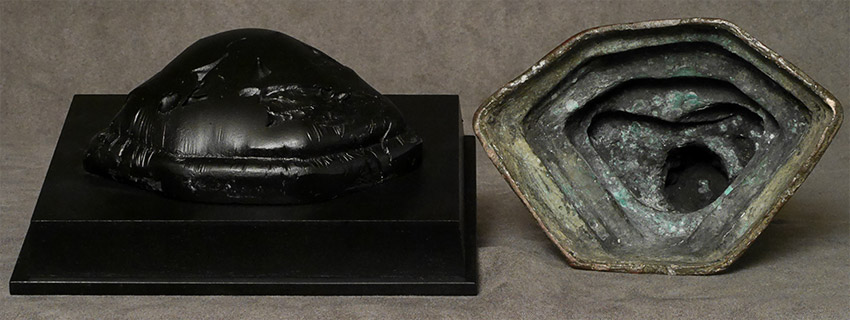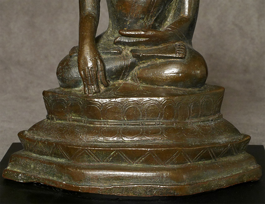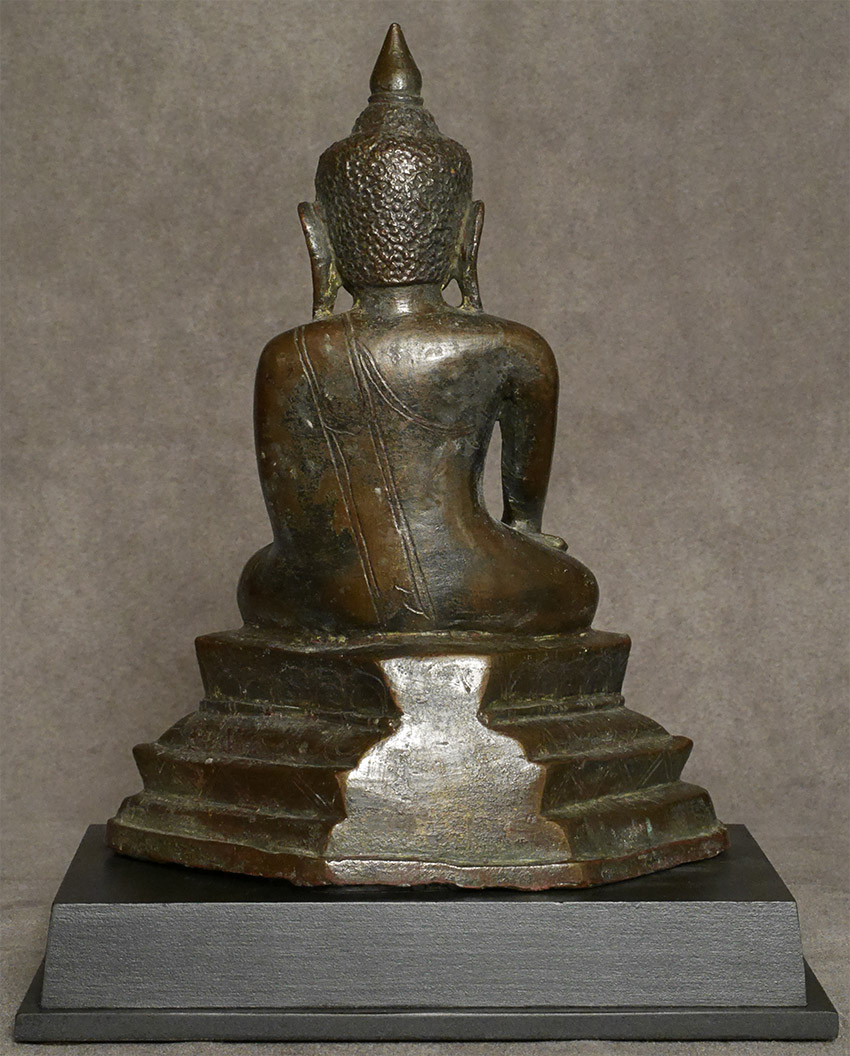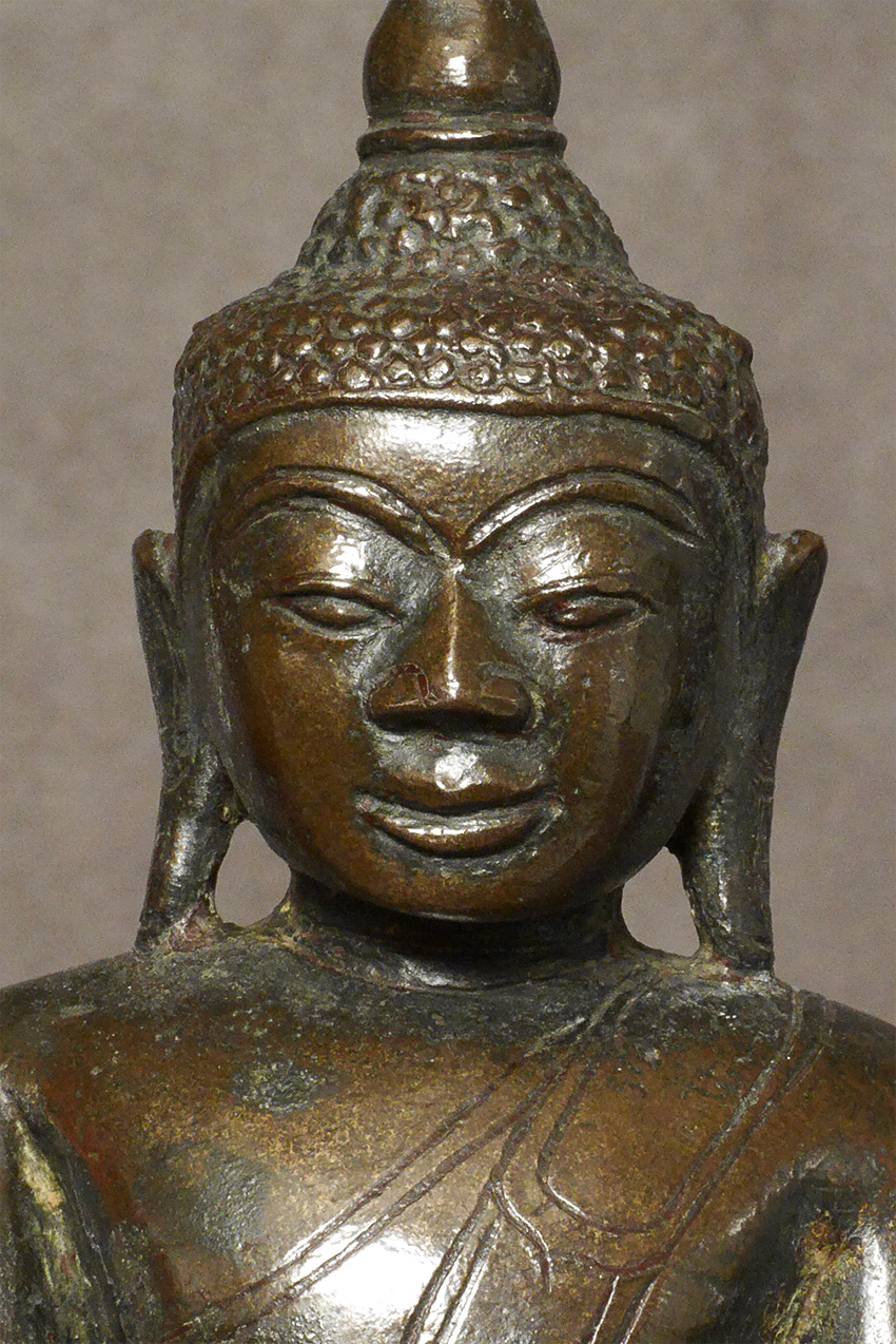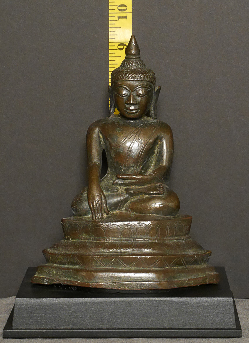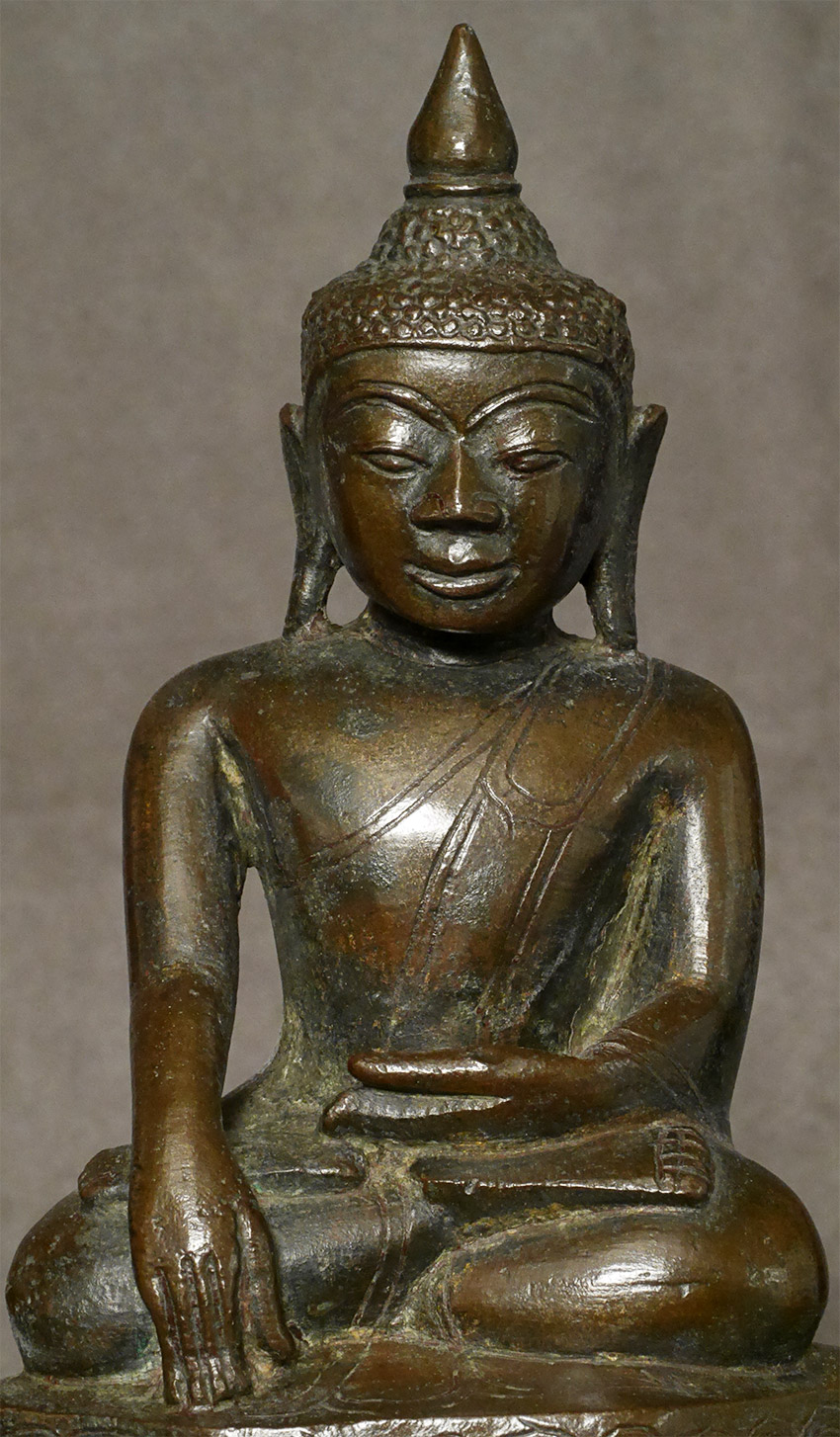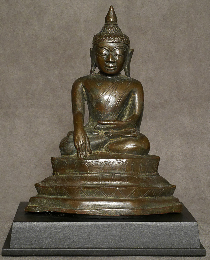 Lovely 16/17thC Burmese Bronze Buddha. Nice chocolate brown patina. 8 inches tall, 9.25 inches on custom stand. Far lass common than the 18/19th/c Burmese Shan bronze Buddhas, which typically have high stepped bases, thinner bodies, and more youthful face