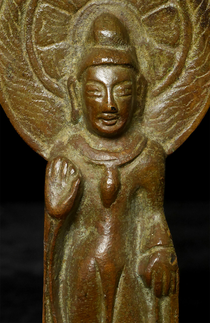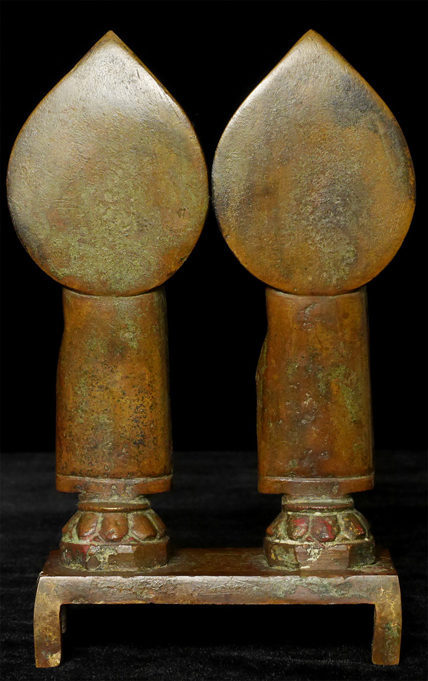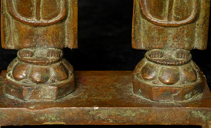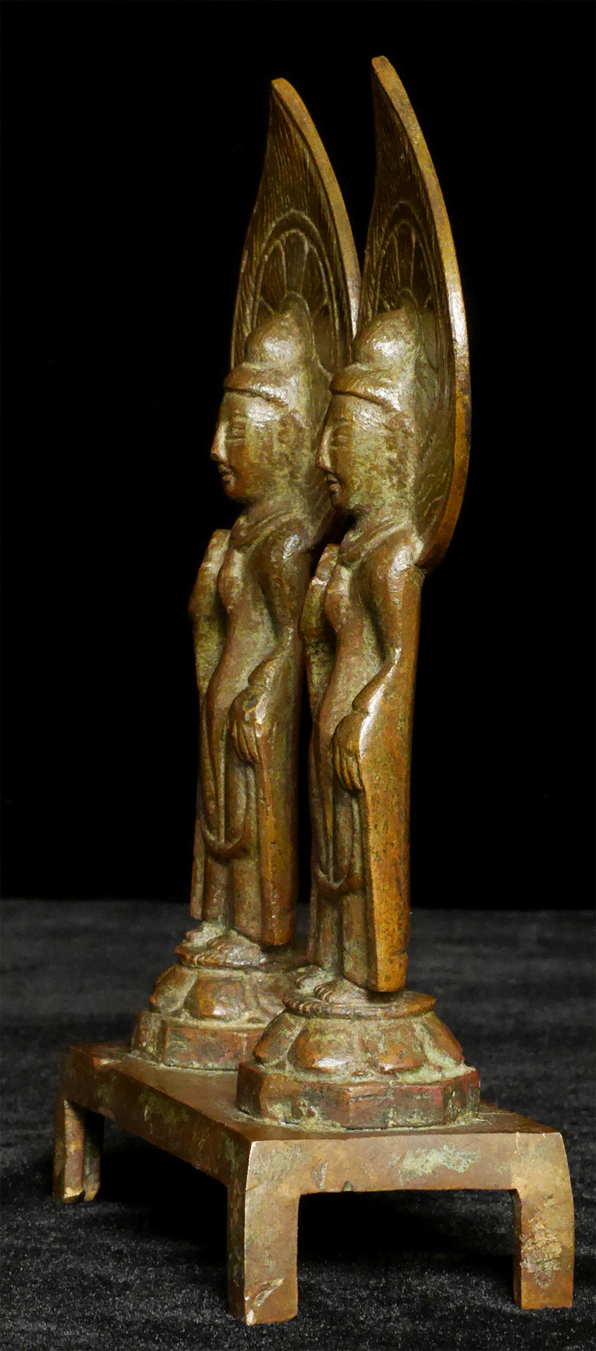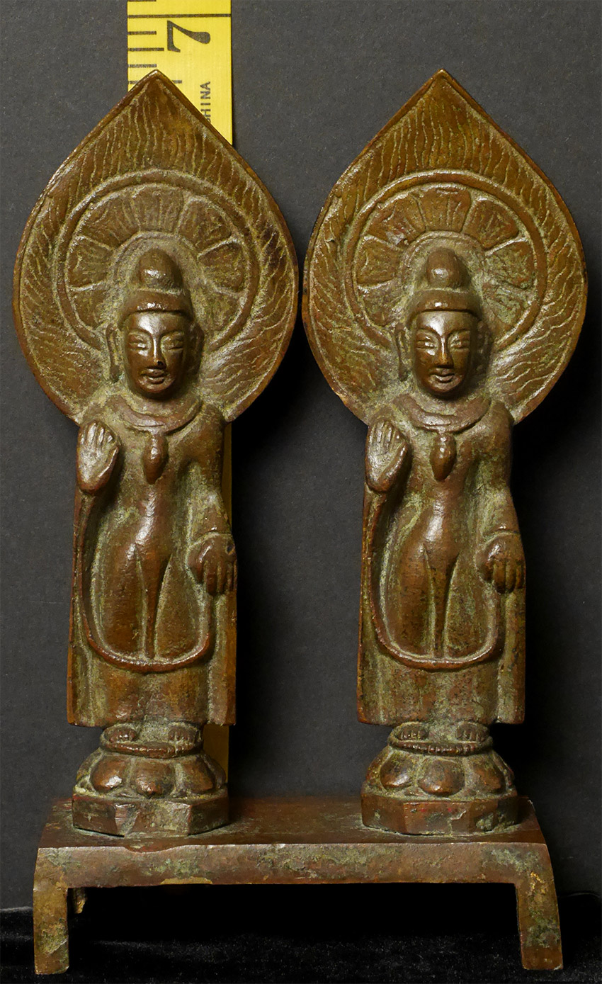 Pair of Japanese or Korean Bronze Buddhas/Bodhisattvas on a shared base. Probably Edo era (17-19th C). Each stands 6-5/8 inches tall.