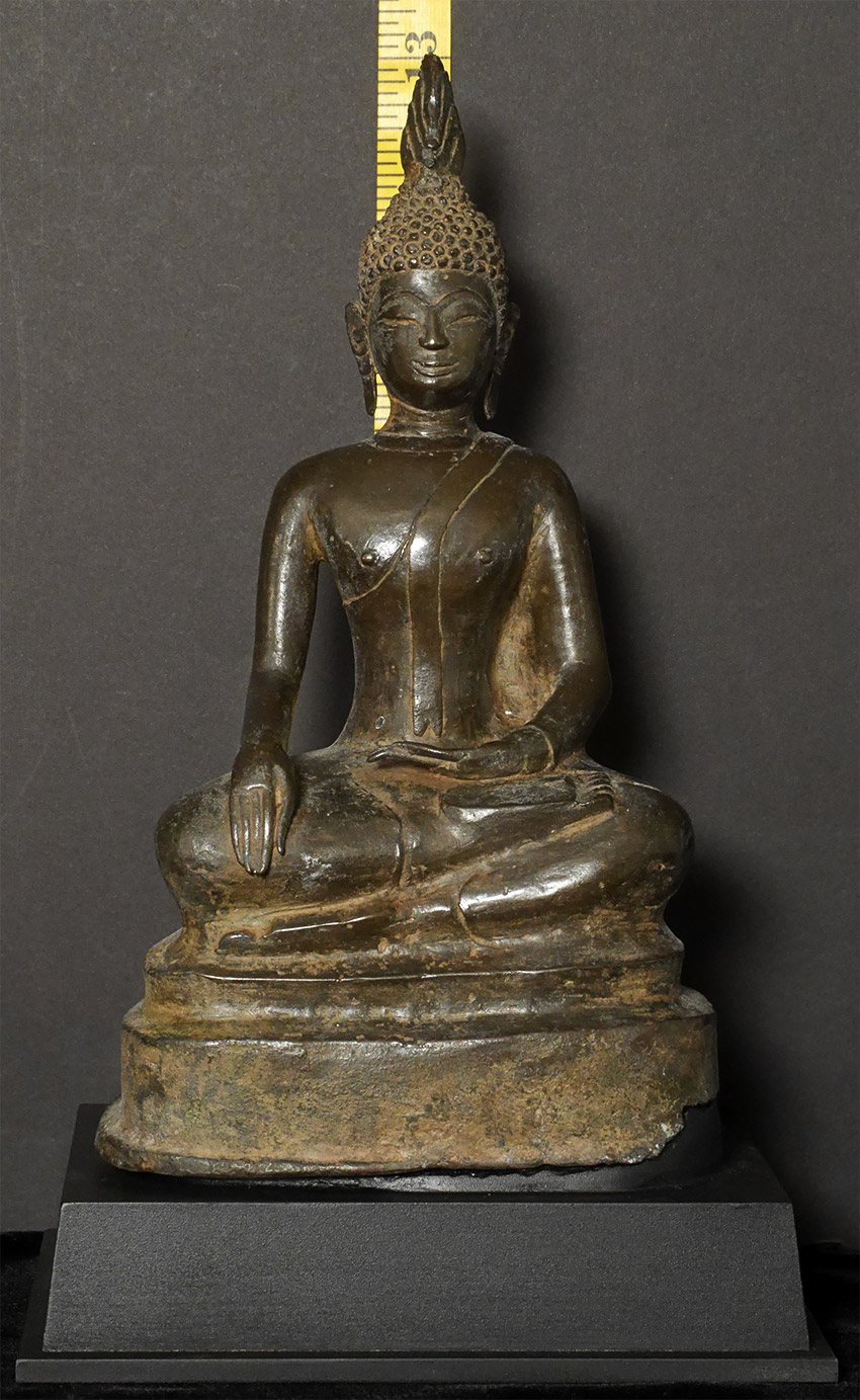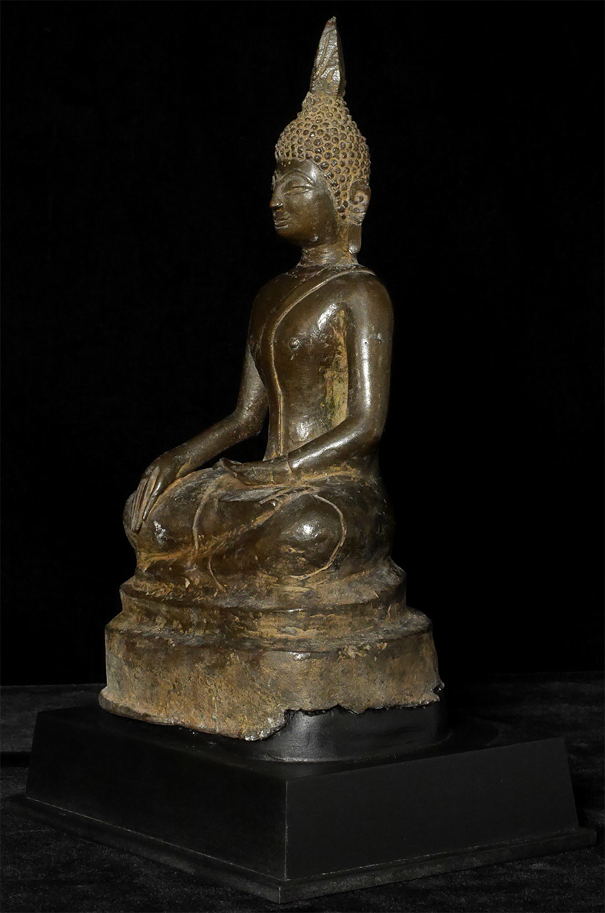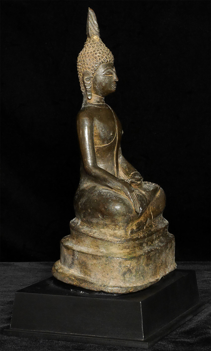16thC Northern Thai Buddha cast out of bronze. Large at 11.25 inches tall, 13 inches on custom stand. Some loss to original bronze base, though corrected perfectly with custom base. Great face!