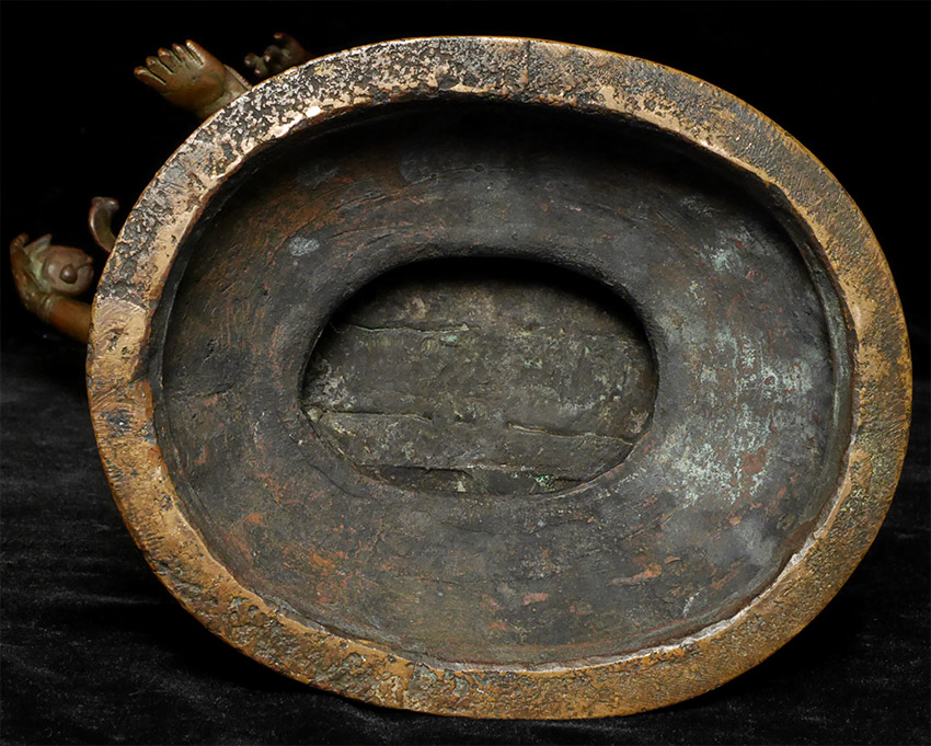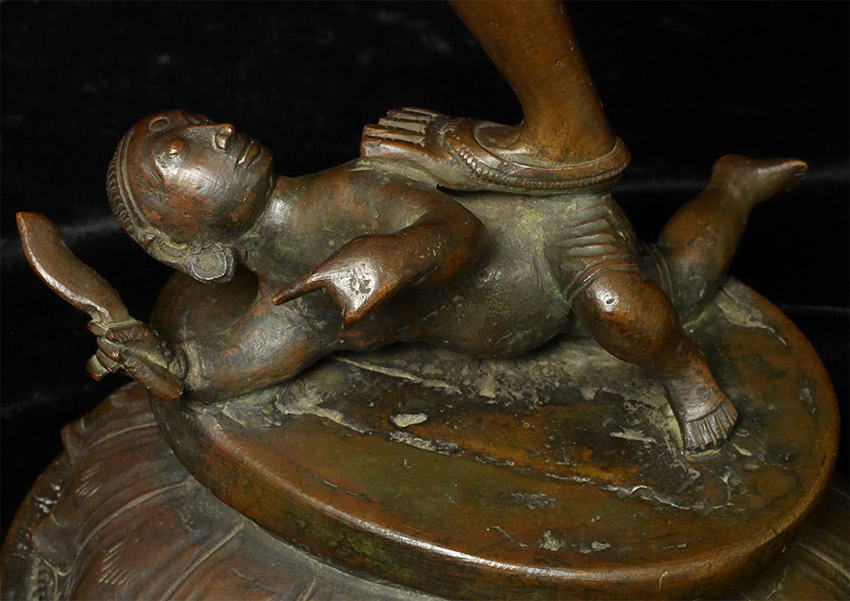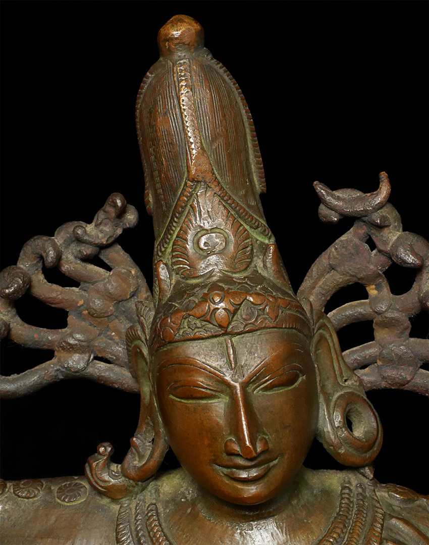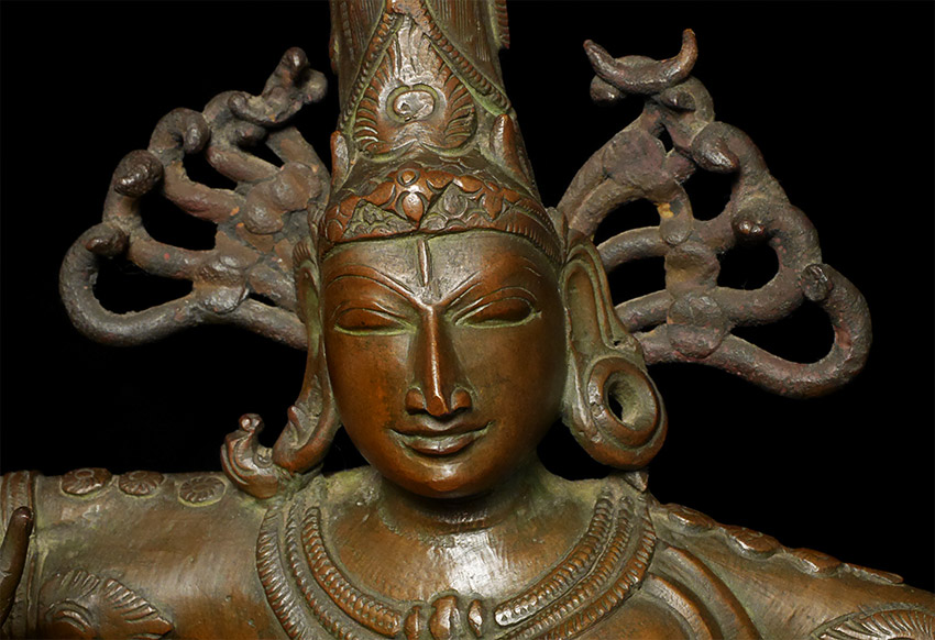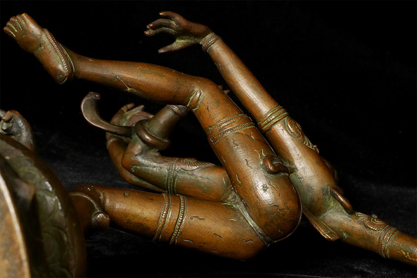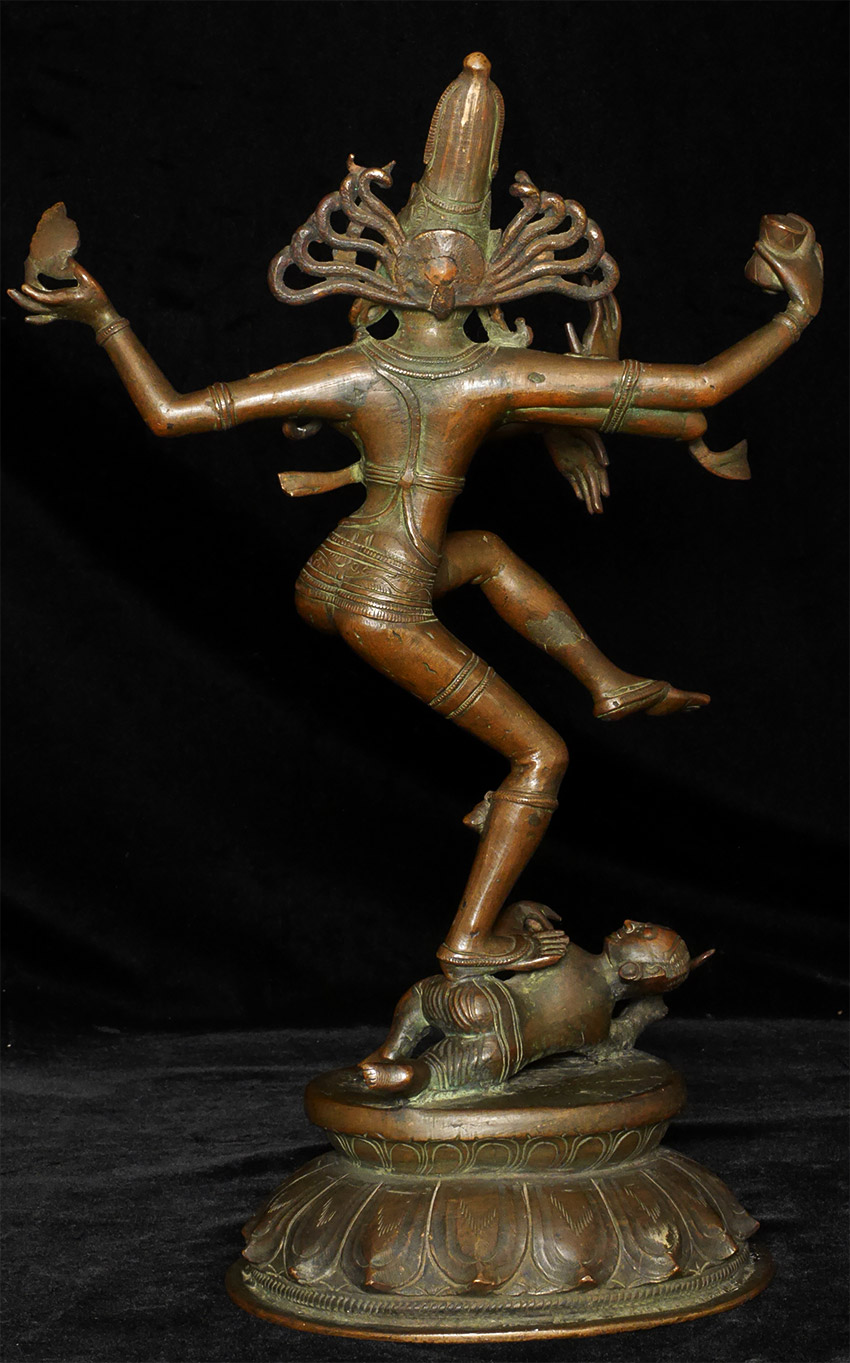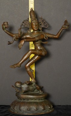 A nice complementary image to have along side the Buddha- Shiva Nataraj- dancing the dance of simultaneous creation and destruction )- while maintaining equanimity and complete calm. Rarely (except on astronomically priced early pieces) are the fingers and toes so well formed and used to express the movement of the figure. Stands 16 inches tall, solid cast and quite heavy.