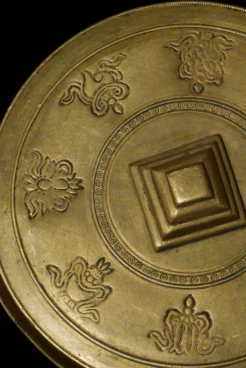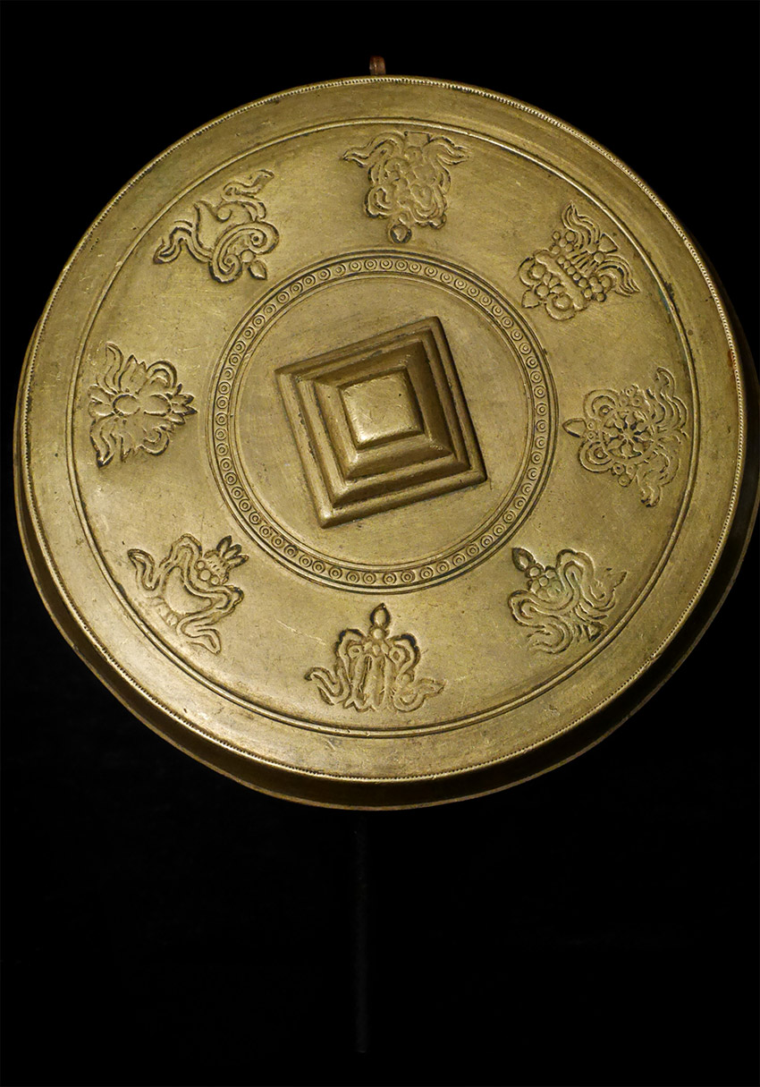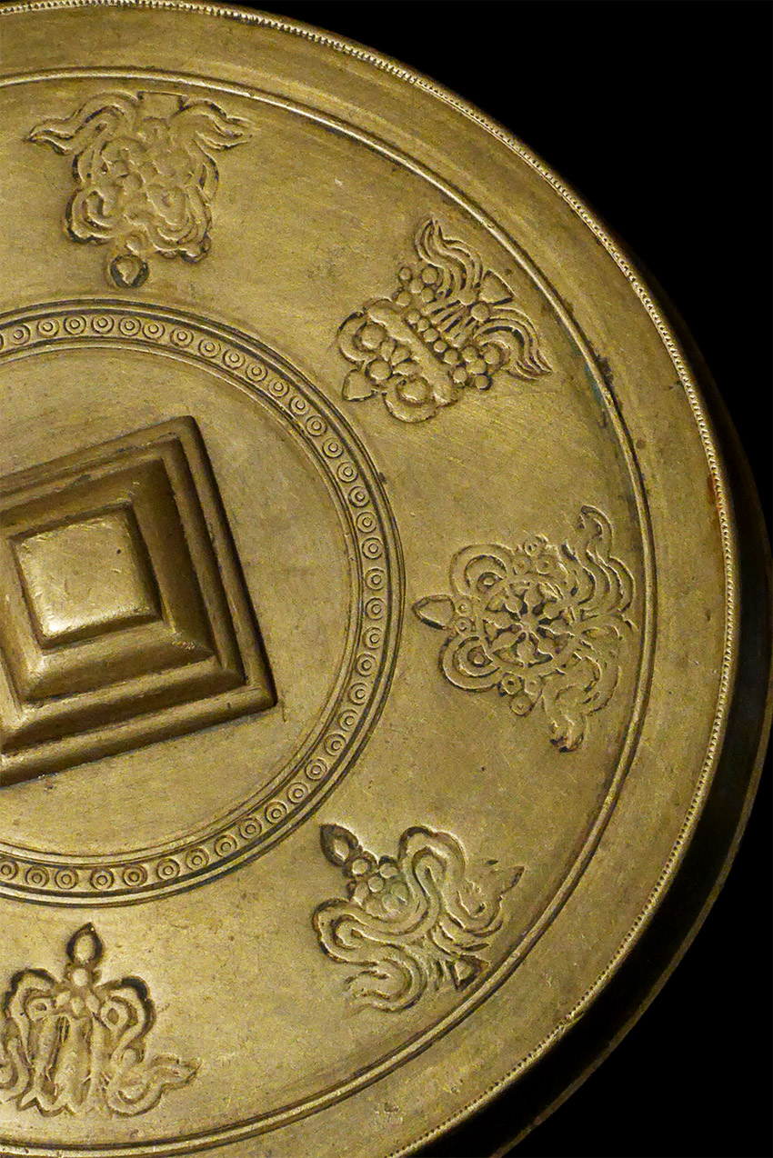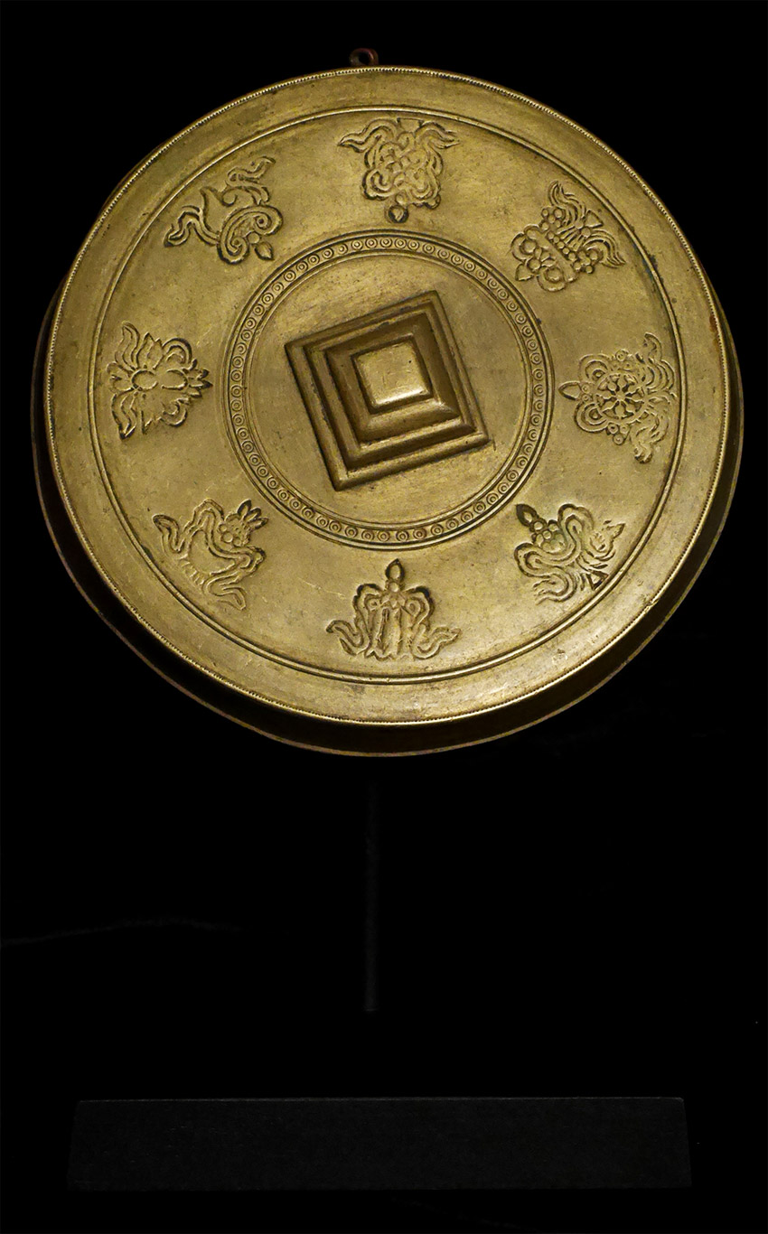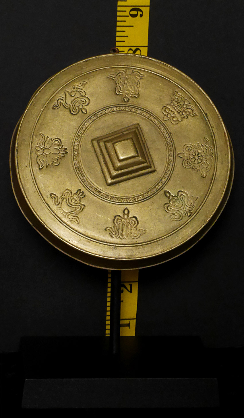 Wonderful Antique Mongolian Mandala- used as a meditation aid in focusing on the liberation from suffering for all sentient beings. Most Mongolian Mandalas are made of fairly thin copper repousse. This one is cast out of bronze. Has 8 auspicious symbols around the top. The center is s stylized representation of Mt. Meru. 5.5 inch diameter, 7 7/8 inches tall on custom stand