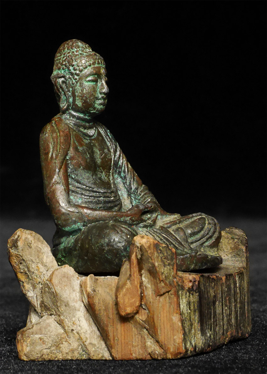 Japanese Buddha with very early base. Sits 1.5 inches tall, 2 inches on optional stand. Hole on bottom of robe suggests it may have originally been attached to a different base. Hard to tell how much age this piece has so I am selling/pricing it as "vintage".
