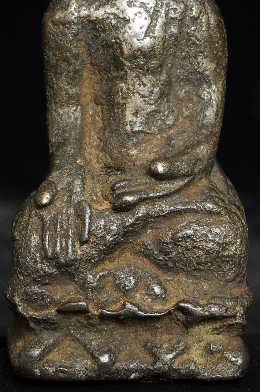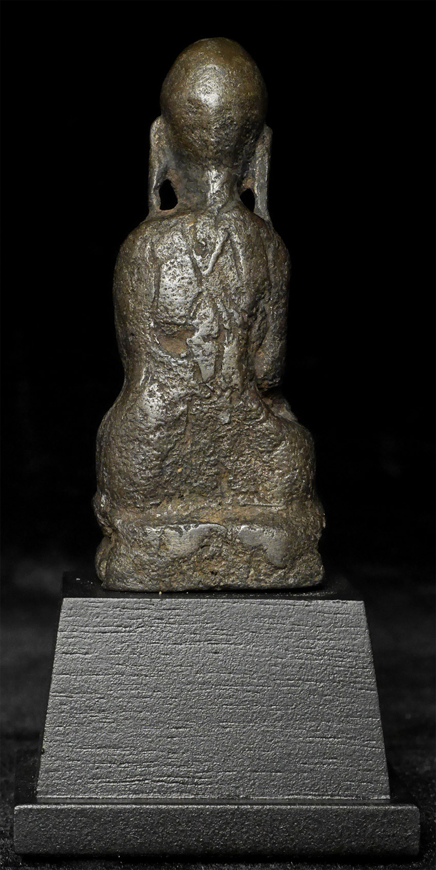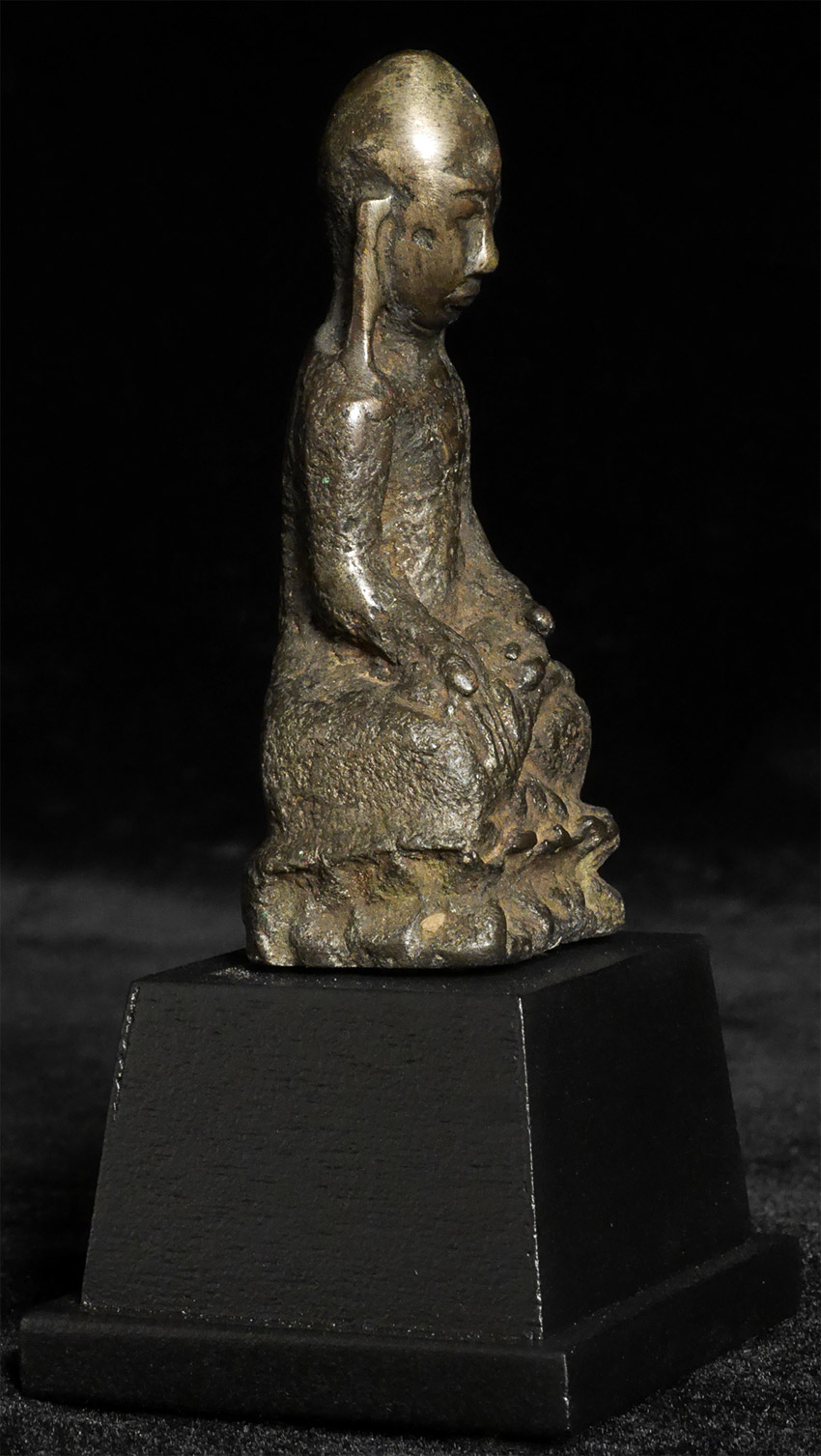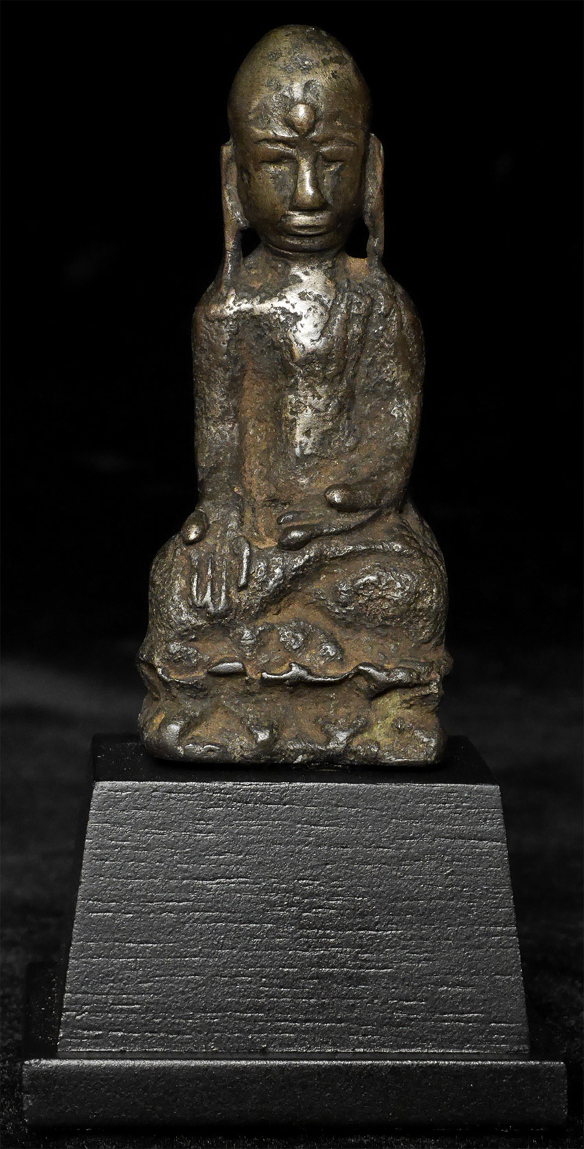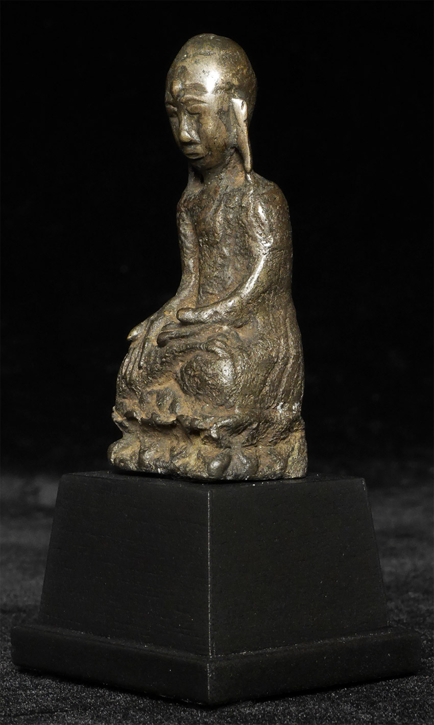 A Buddhist monk- looks to be several hundred years old but unsure how to date. It has been suggested by one knowledgeable collector that it may be a very early provincial piece from Yunnan (Southern China). Thickly cast from an alloy which may include silver. Sits 2.75" tall, 3 7/8" tall on its custom stand. Rare type. Domestic shipping is included. International shipping $50