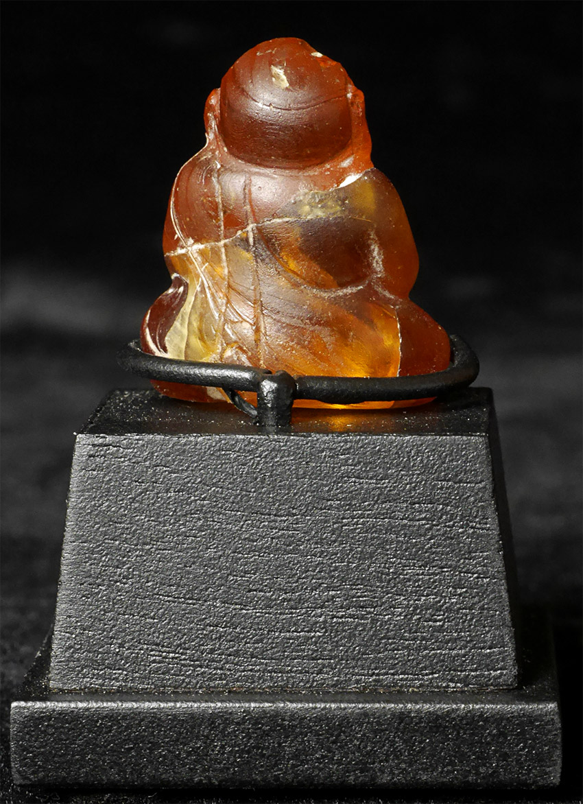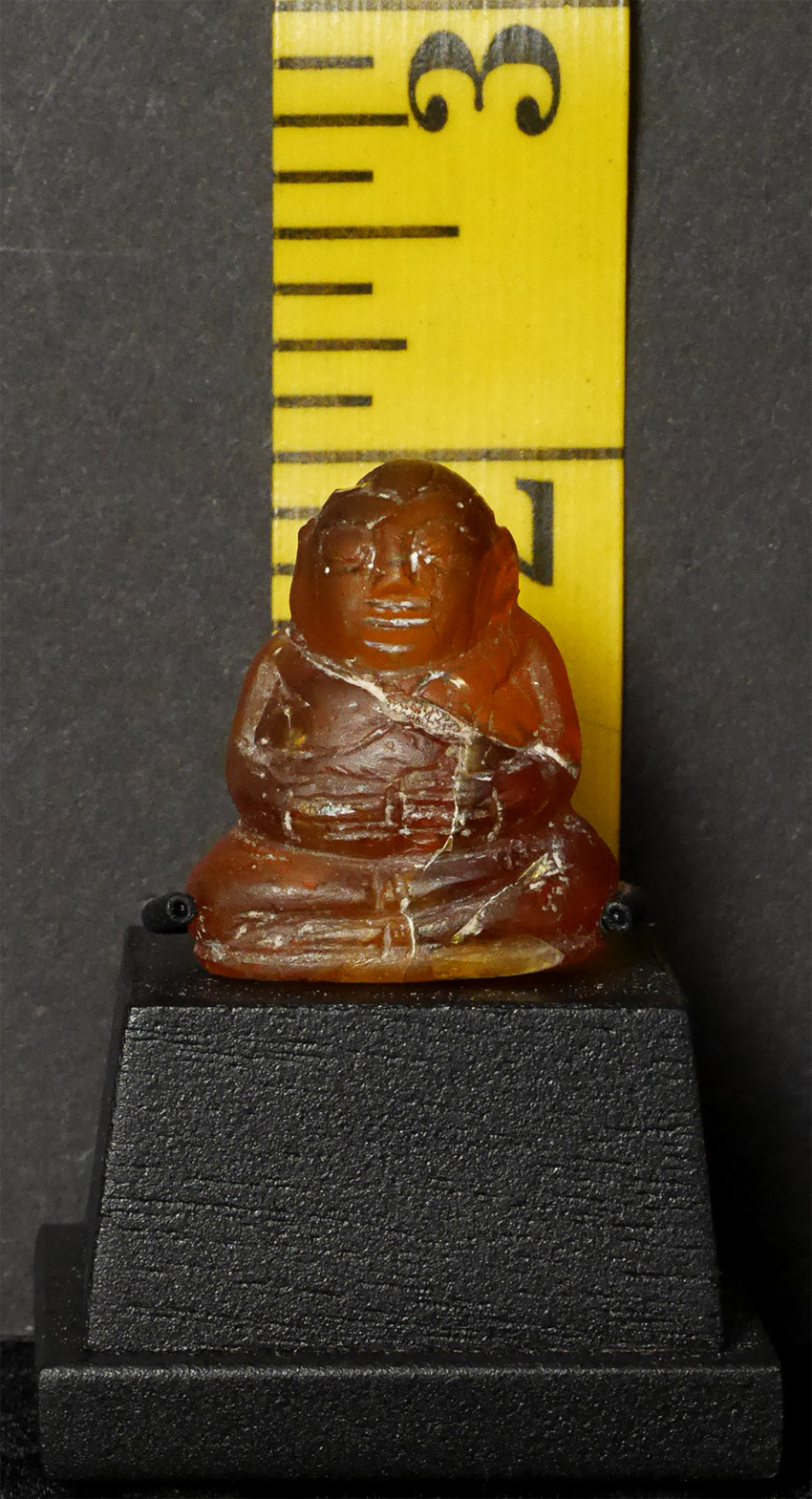 Extremely rare 15-17thC Northern Thai Buddhist figure sculpted out of a special glass which has significant amounts of gold mixed in to it (this gives it it's color as well as making it extremely heavy for its size). If you look on my site in the "search" area-look for advanced search in the upper right hand corner of the page, and then after you get there check both "sold" and "for sale", then scroll to"glass" items in "Thailand" you will see all the related items are pale yellow- this one has so much gold it is almost orange. Purchased from a farmer who excavated this in his field. Repairs and loss. Very strong spiritual feeling. This piece meaures 1" tall (approx.) and 2" tall on its custom base.