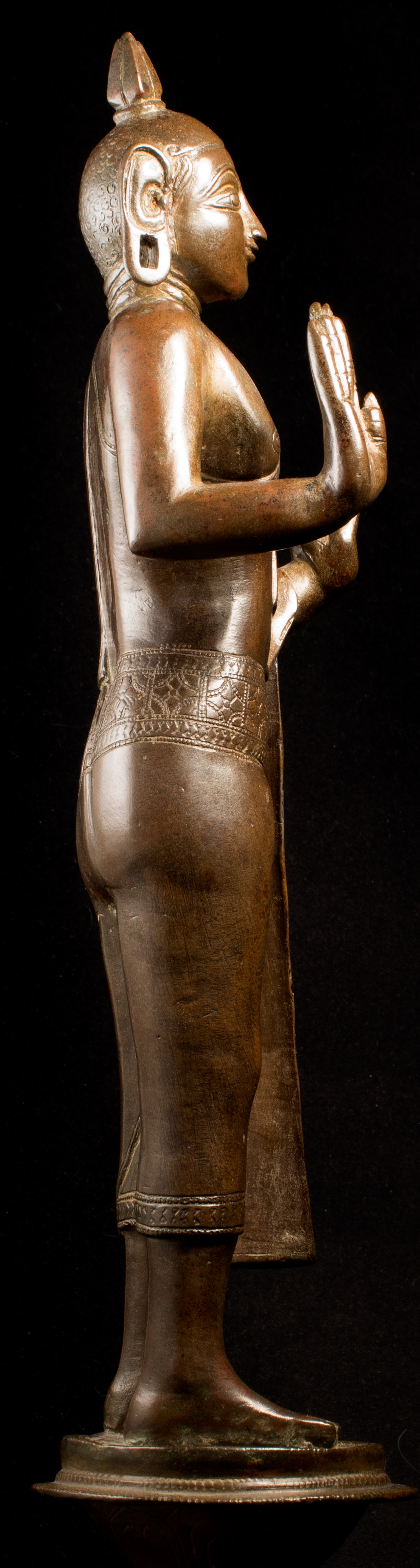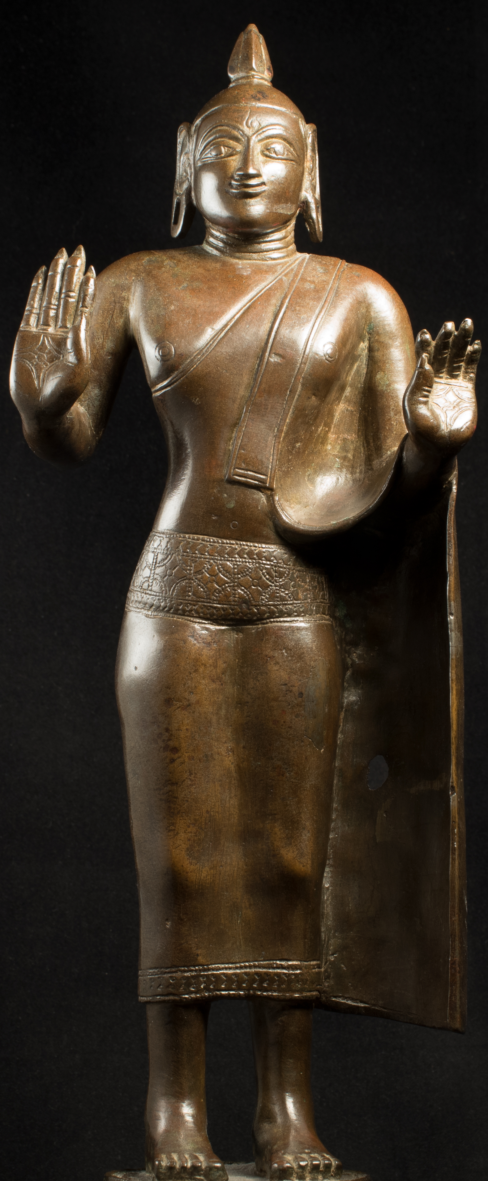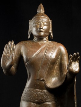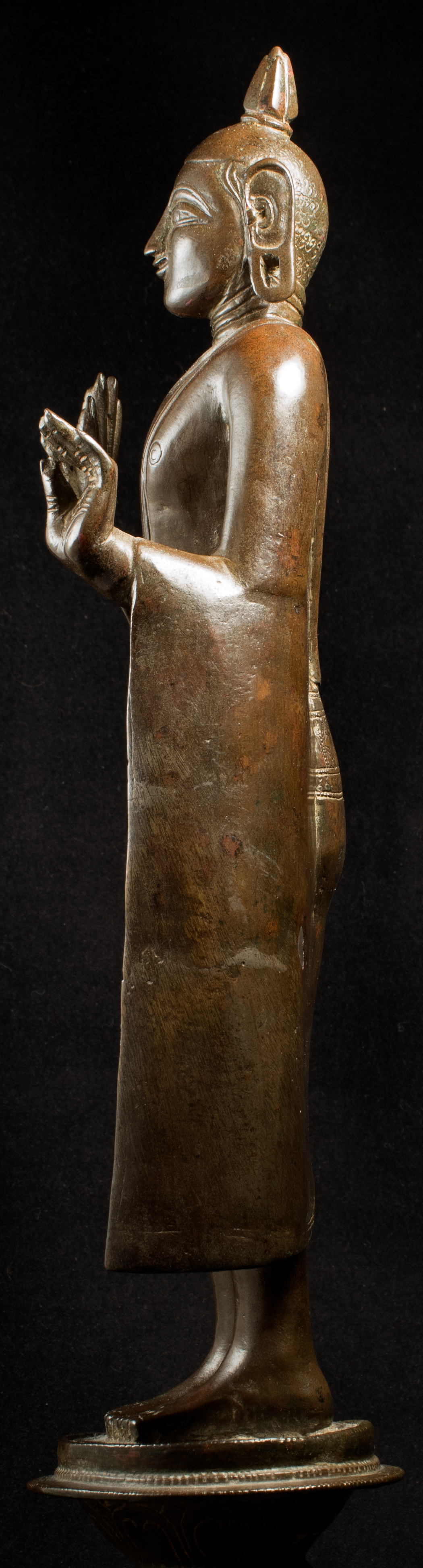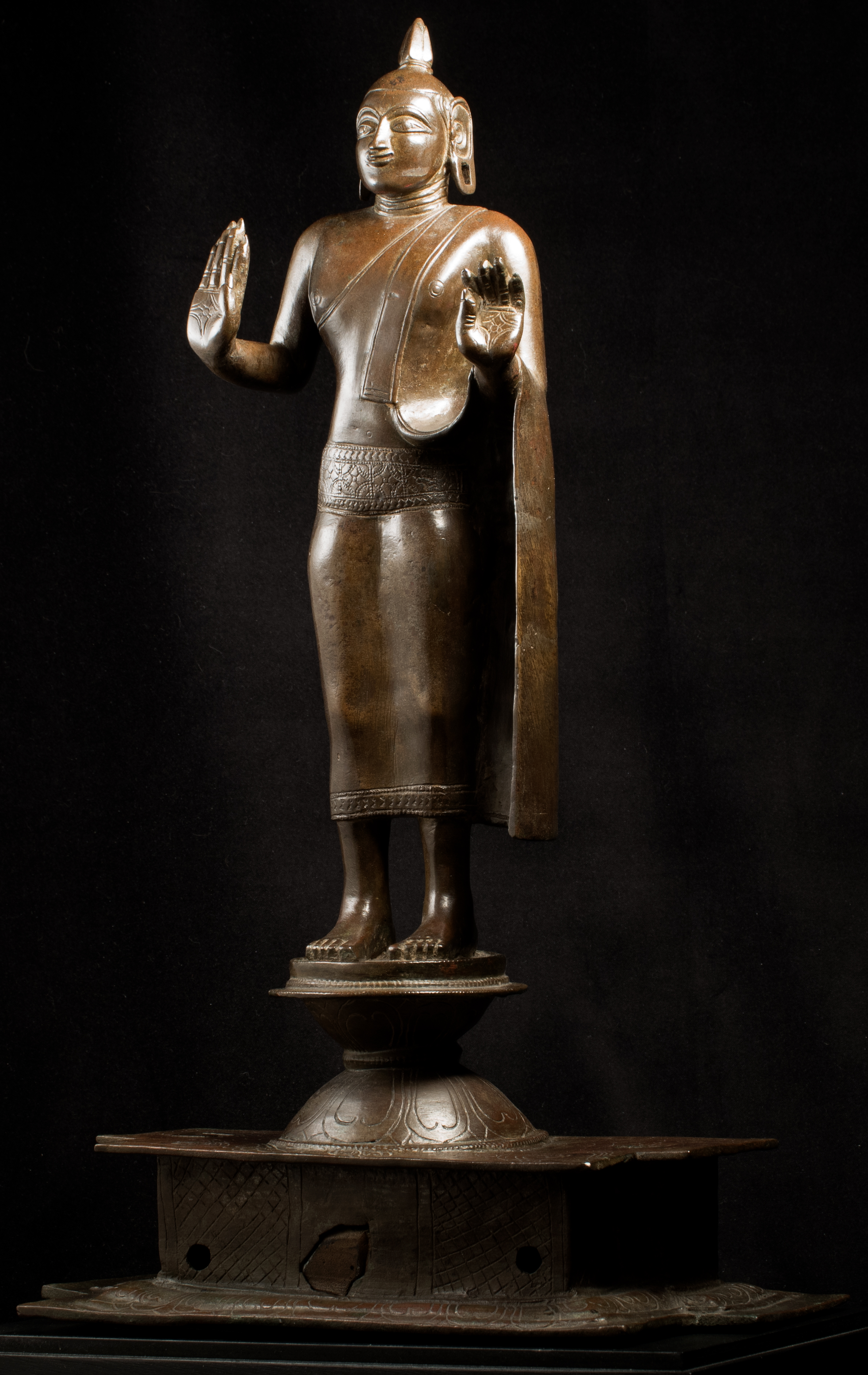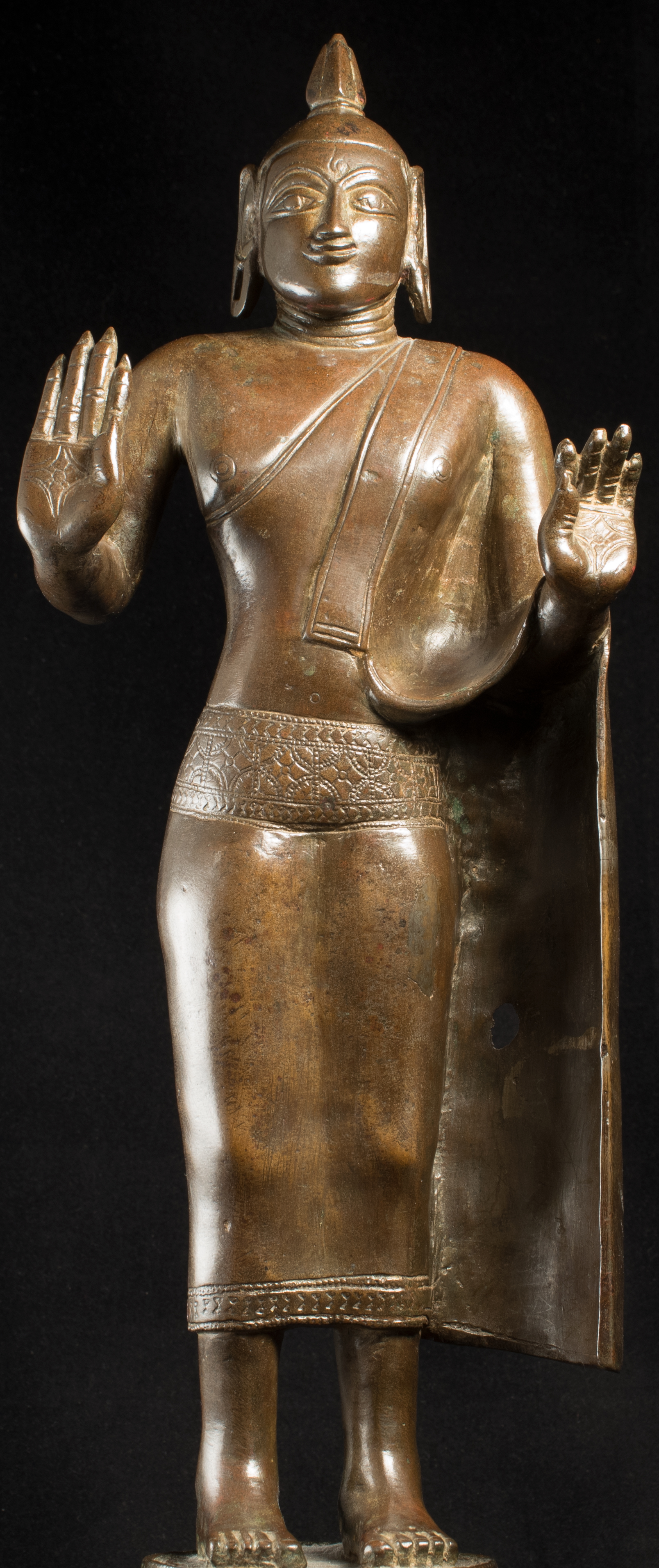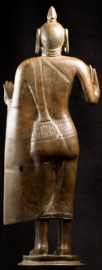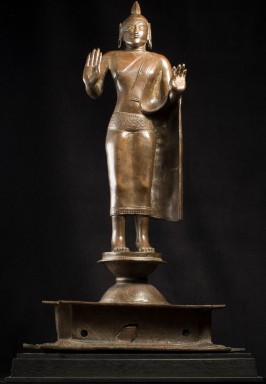 A one-of-a-kind 14-16thC Nagapattinam Standing Indian Bronze Buddha (close to Chola, in both location and time, but this one is Buddhist, the other Hindu. Chola is more famous- both are High points in Indian sculpture). Nagapattinam Bronze Buddhas of any size are pretty rare. Examples over 8 or 10 in are extremely rare. Nagapattinam Buddhas as giant as this Buddha are only found in museums or (very rarely)the best auction houses. Go online and search for this type of Buddha in bronze and see what comes up. I am aware that no other Nagapattinam of this size has sold at Sotheby's or Christie's since they began putting results on their sites. Height is 20." tall (bronze total), 21.5" tall with its custom base, 11" (widest point at the base), and 6" (width at hands). Excellent condition. One nail/fingertip is broken, and the base has a few holes. Outstanding, untouched, even patina covers the entire statue. One expert who examined it felt that it is possible the base was made a bit later than the figure as it is not quite as refined or finished as the actual figure. The starting bid price represents a 50% reduction from original bottom line price