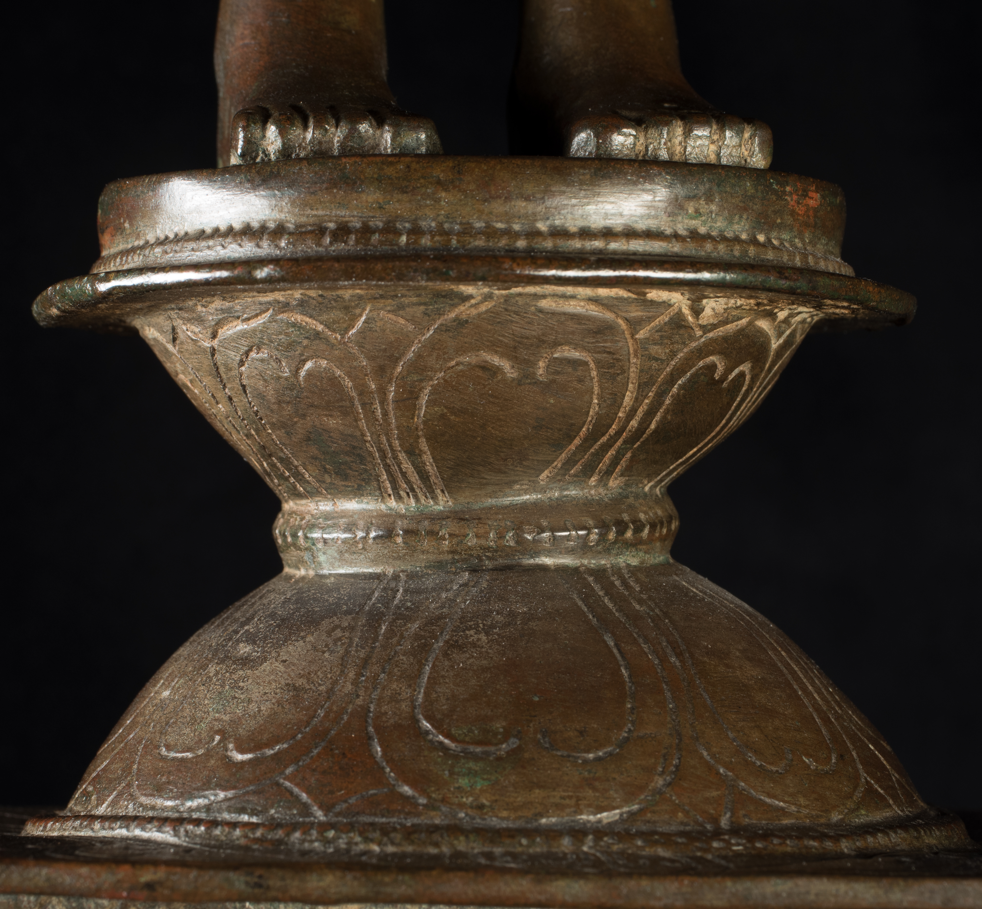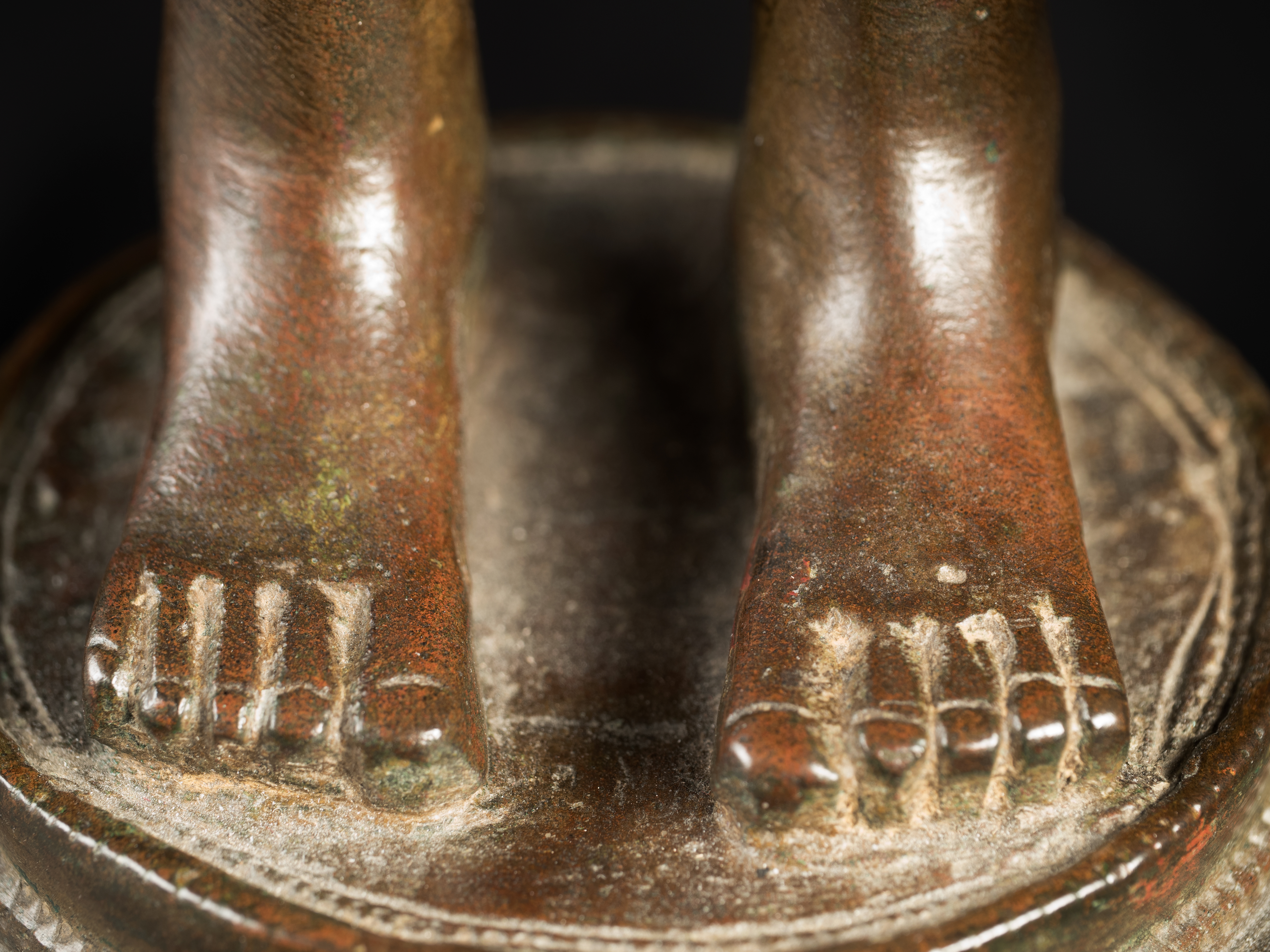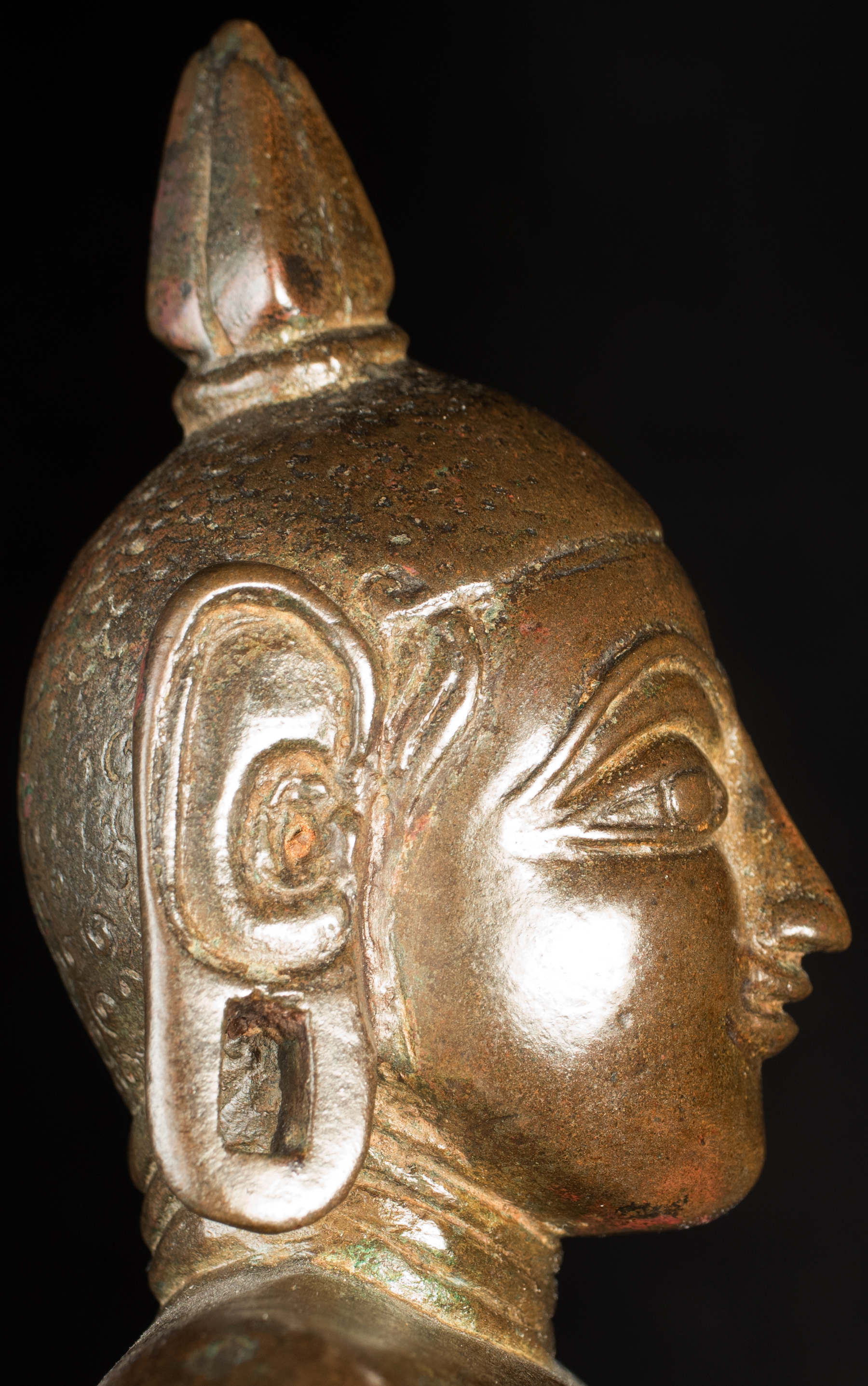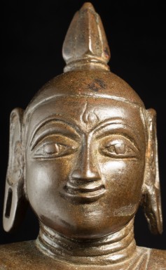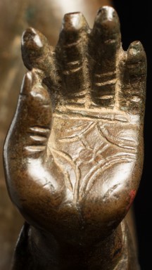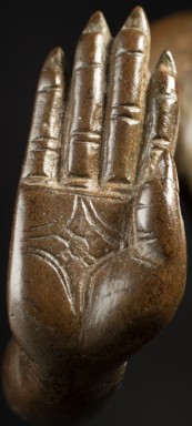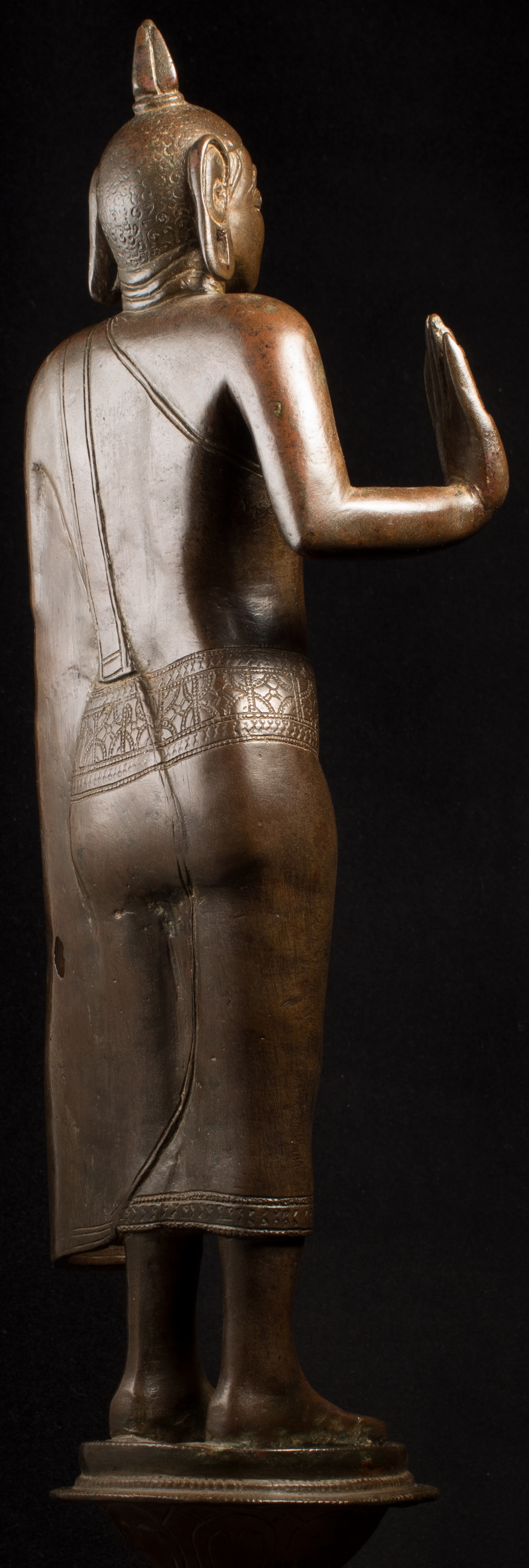 A one-of-a-kind 14-16thC Nagapattinam Standing Indian Bronze Buddha (close to Chola, in both location and time, but this one is Buddhist, the other Hindu. Chola is more famous- both are High points in Indian sculpture). Nagapattinam Bronze Buddhas of any size are pretty rare. Examples over 8 or 10 in are extremely rare. Nagapattinam Buddhas as giant as this Buddha are only found in museums or (very rarely)the best auction houses. Go online and search for this type of Buddha in bronze and see what comes up. I am aware that no other Nagapattinam of this size has sold at Sotheby's or Christie's since they began putting results on their sites. Height is 20." tall (bronze total), 21.5" tall with its custom base, 11" (widest point at the base), and 6" (width at hands). Excellent condition. One nail/fingertip is broken, and the base has a few holes. Outstanding, untouched, even patina covers the entire statue. One expert who examined it felt that it is possible the base was made a bit later than the figure as it is not quite as refined or finished as the actual figure. The starting bid price represents a 50% reduction from original bottom line price