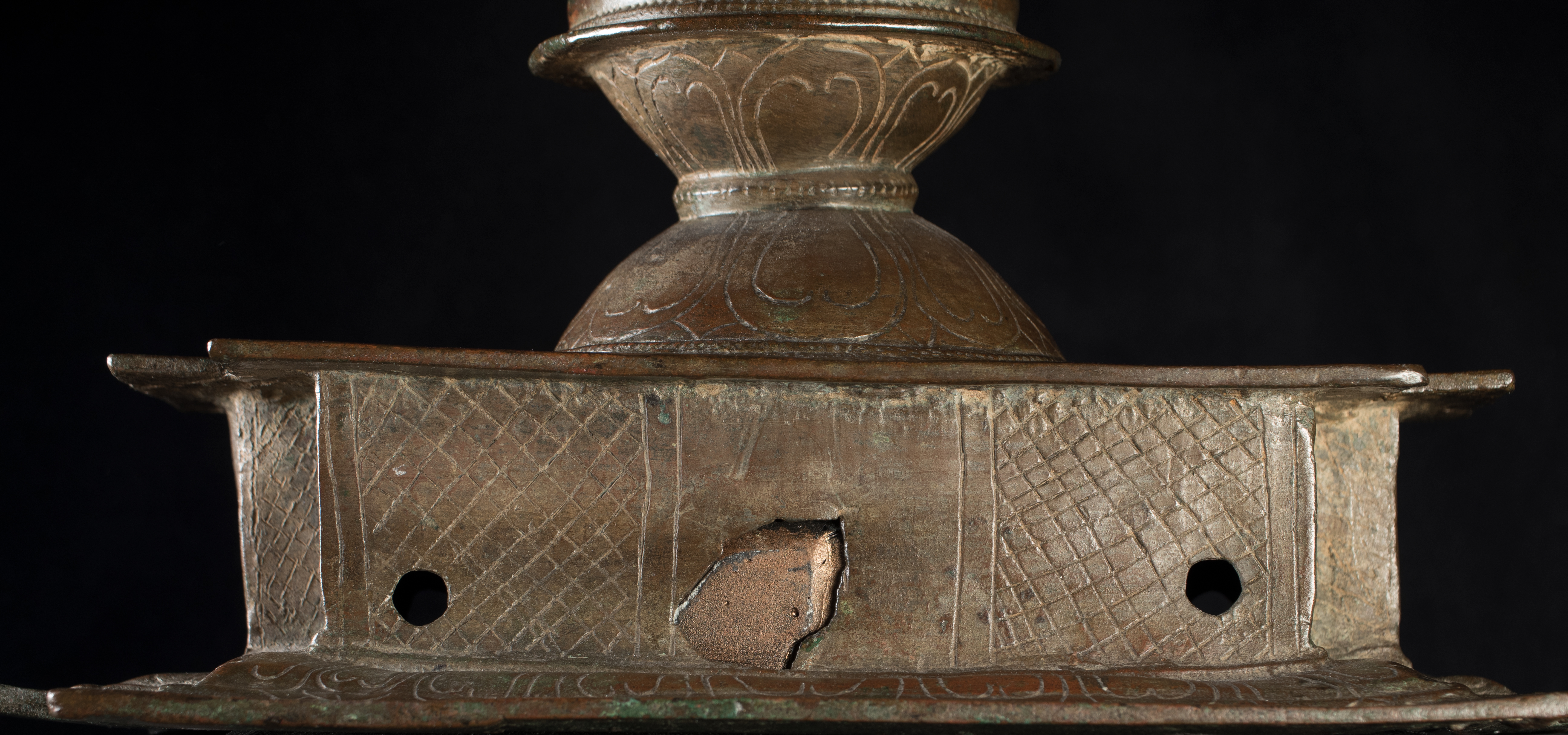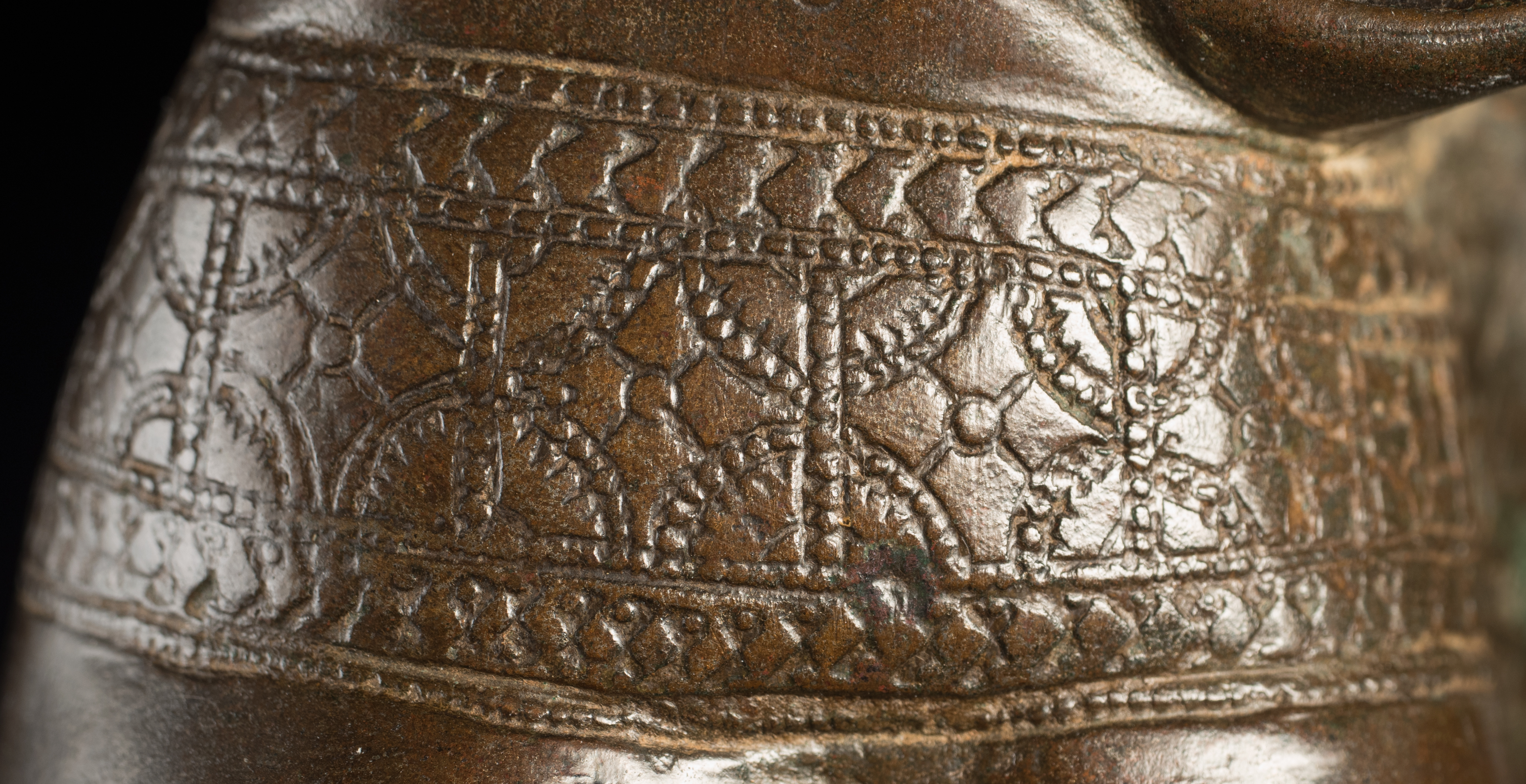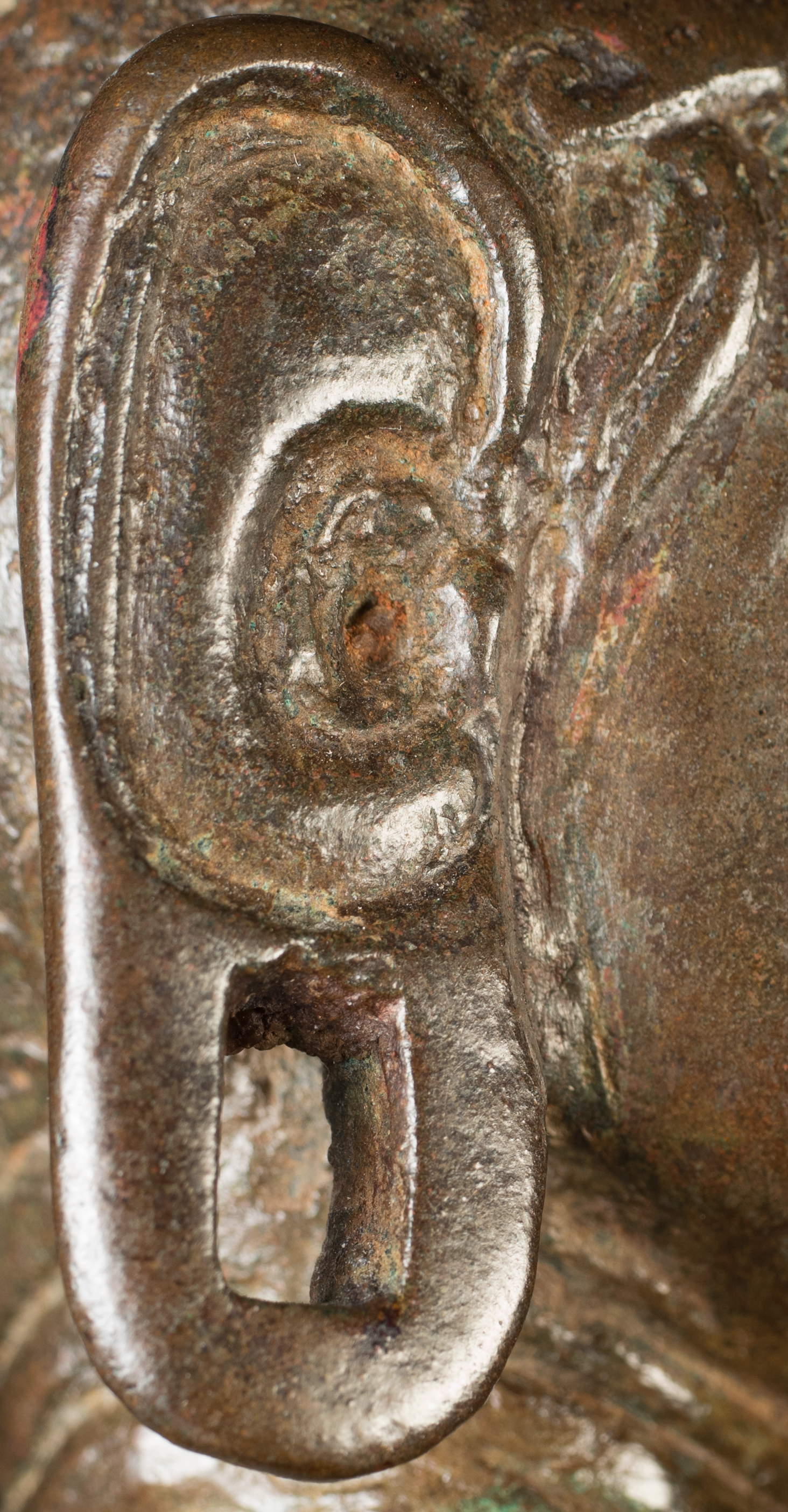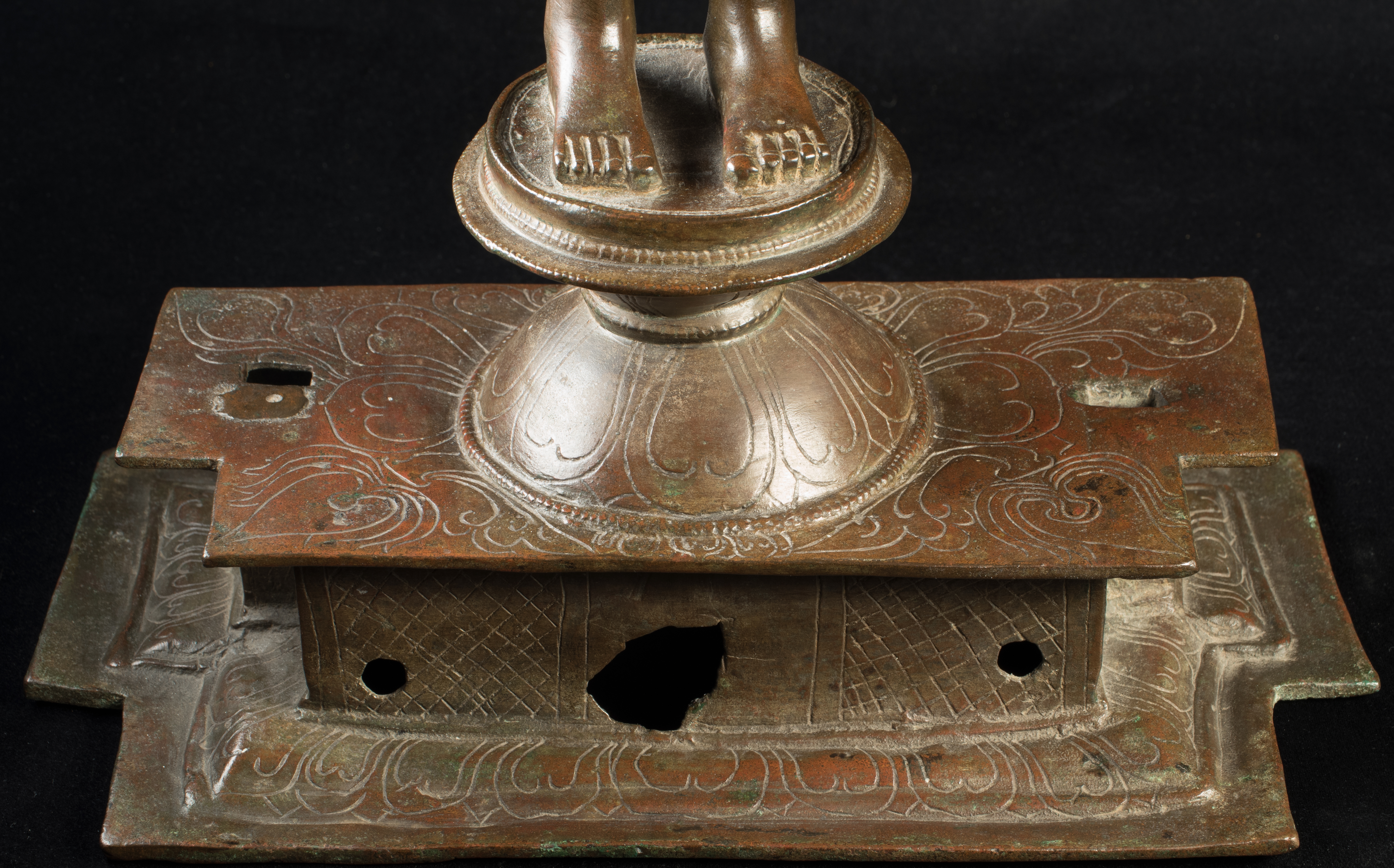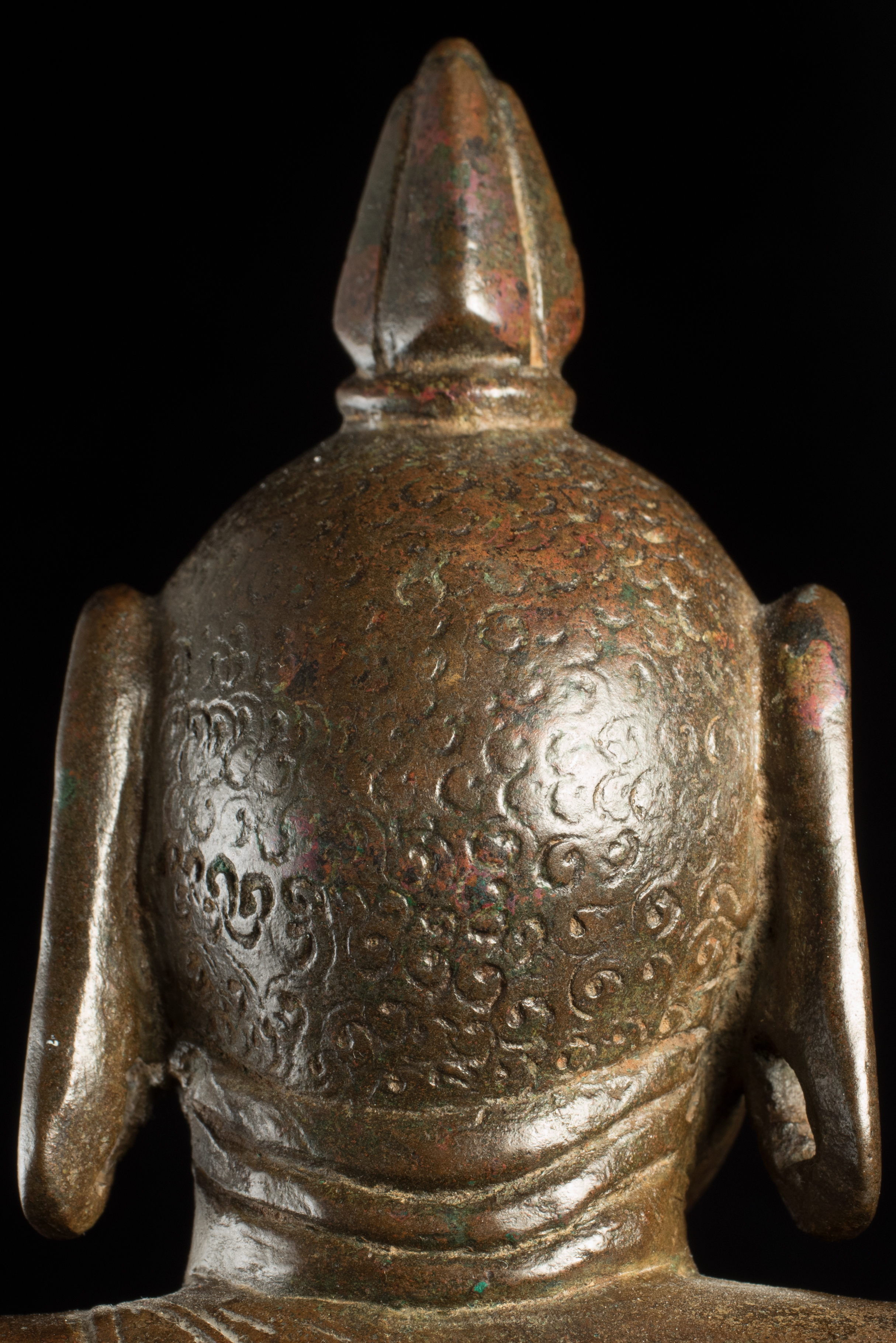 A one-of-a-kind 14-16thC Nagapattinam Standing Indian Bronze Buddha (close to Chola, in both location and time, but this one is Buddhist, the other Hindu. Chola is more famous- both are High points in Indian sculpture). Nagapattinam Bronze Buddhas of any size are pretty rare. Examples over 8 or 10 in are extremely rare. Nagapattinam Buddhas as giant as this Buddha are only found in museums or (very rarely)the best auction houses. Go online and search for this type of Buddha in bronze and see what comes up. I am aware that no other Nagapattinam of this size has sold at Sotheby's or Christie's since they began putting results on their sites. Height is 20." tall (bronze total), 21.5" tall with its custom base, 11" (widest point at the base), and 6" (width at hands). Excellent condition. One nail/fingertip is broken, and the base has a few holes. Outstanding, untouched, even patina covers the entire statue. One expert who examined it felt that it is possible the base was made a bit later than the figure as it is not quite as refined or finished as the actual figure. The starting bid price represents a 50% reduction from original bottom line price