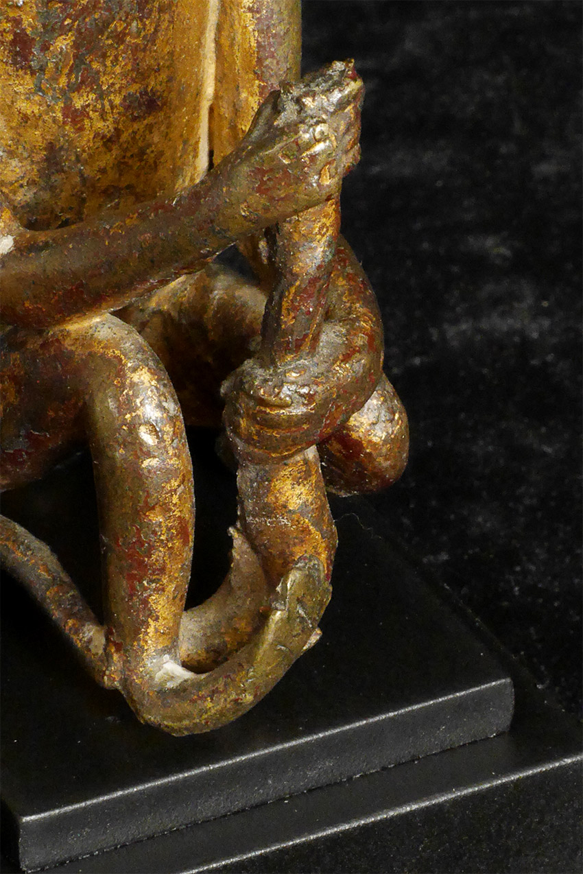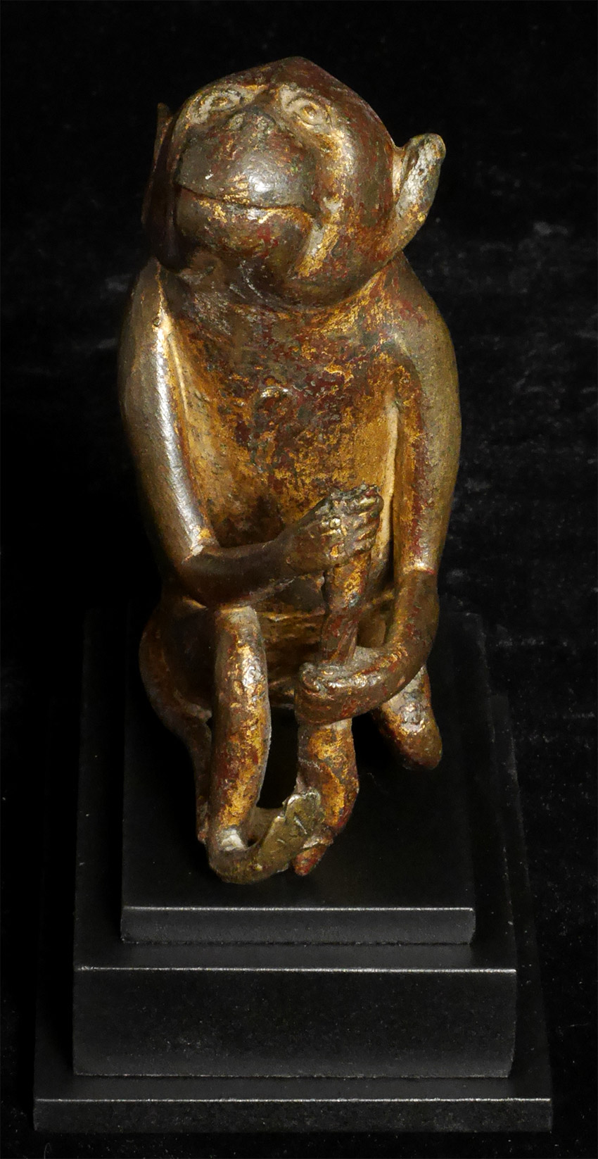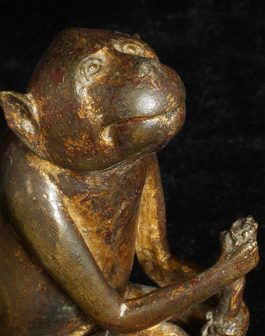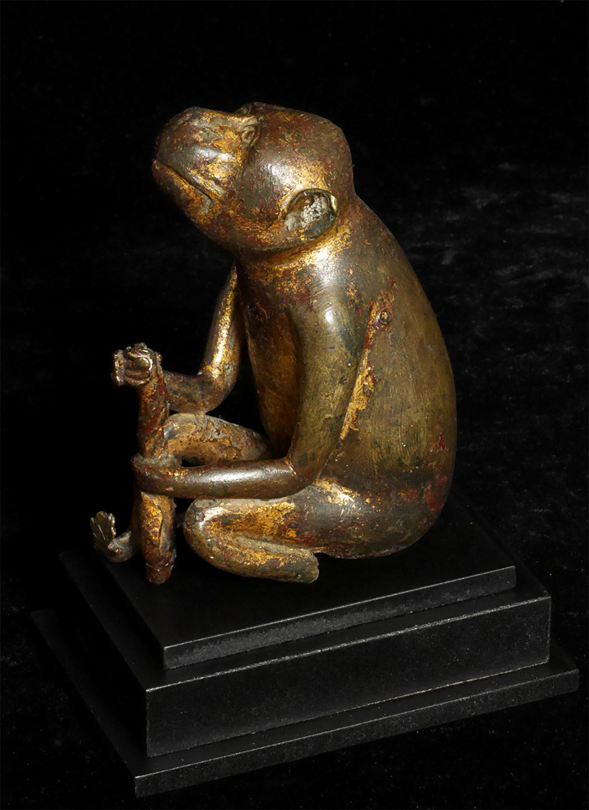 Remarkable intelligent monkey thinking deep thoughts. Solid cast and quite heavy for his size. Had this custom base made with just the right proportions to really bring out his sculptural beauty. Sits firmly at 4.75 inches tall, 6 inches tall on custom stand. Part of his staff held in his hands is long gone, and lacquer and gilding shows extensive wear. Looks to be quite old. Unsure of country of origin or how to date.