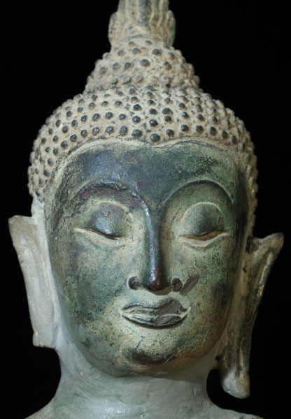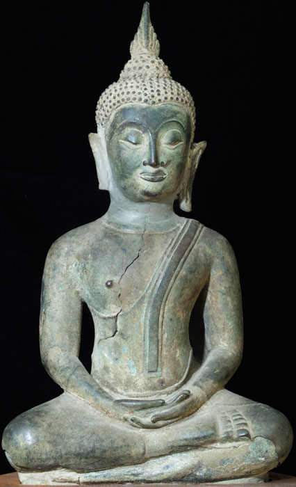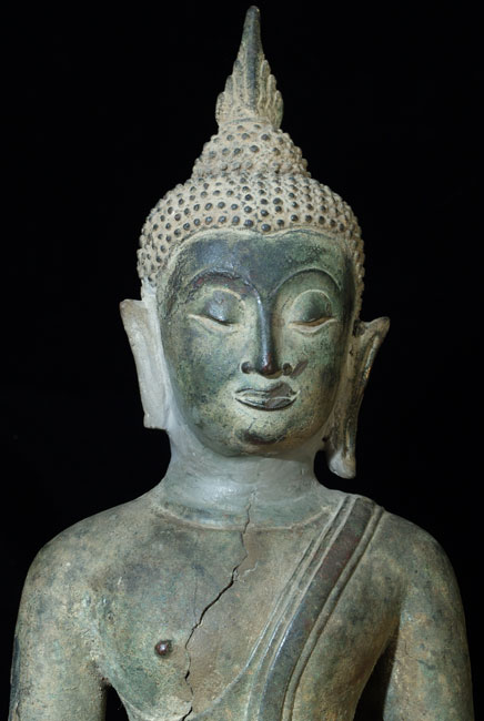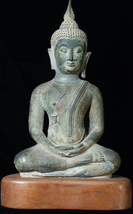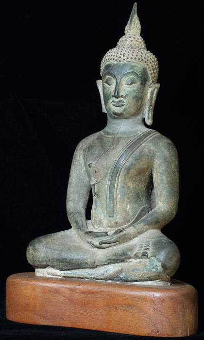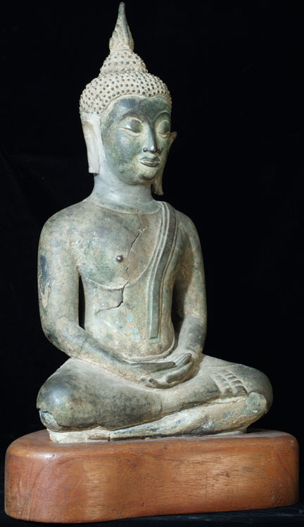 A lovely Buddha, although a bit of a mystery. This Buddha is clearly cast in the 15/17thth centuries by Thai artisans. This is evident based on the distinctive casting techniques applied, which were only used in Thailand during that period. The body looks Kamphen Phet style or Early Ayuthaya. The interesting thing is that the head and face have a number of elements which strongly suggest that this piece was made in Burma (often artisans were captured by each side during the centuries of battles between the various kingdoms in Thailand and Burma) or in an area of Thailand while it was under Burmese domination during that time. What makes it even more unusual, is that the influences are primarily Arakan (an area of Burma near India), rather than Shan (the area of Burma next to Northern Thailand and the type of Buddhist art which tends to be found in these crossover pieces). It is also the largest mixed-type piece I have ever come across. The Burmese aspects are- the distinctive flame, the actual shape of the head and face, something about the face – the mouth and chin and plane of the face. The ears are unusual, but they are clearly more Burmese than Thai. The style of these Burmese influences is consistent with the 15th century Arakan art which flourished in Maraku. The bronze on this piece is extremely thin- as if the makers tried to use as little as possible because Bronze was scarce in that area during that time. The result is that multiple areas have cracking, and other areas did not completely make it through the casting process. He also has no bronze base. Sometimes Buddhas like this were buried or melted down. This Buddha was beautiful and esteemed enough to complete with terracotta or some other hard substance much like the clay core, only finer. It completes the lower front leg, one (now partially broken) ear, a small bit of each arm the back of the head, and a small part of the lower back base. I believe that this was done when the Buddha was originally made, and then sometime later was improved upon. All that said, what we have is a large and complete (save one earlobe) Buddha. The condition is otherwise excellent- the only other thing I can find is that it looks like it may have hit something accross the cheek and mouth at one time. He sits 12 inches tall by 6.5 inches wide at the knees, and 13.5 with the custom wooden base. If he had a typical bronze base from this period (either Burmese or Thai) he would be a good 16 to 17 inches tall. He is in the deepest of concentration, in the "Samadhi", or meditation mudraYou probably won’t ever see another one of these!
