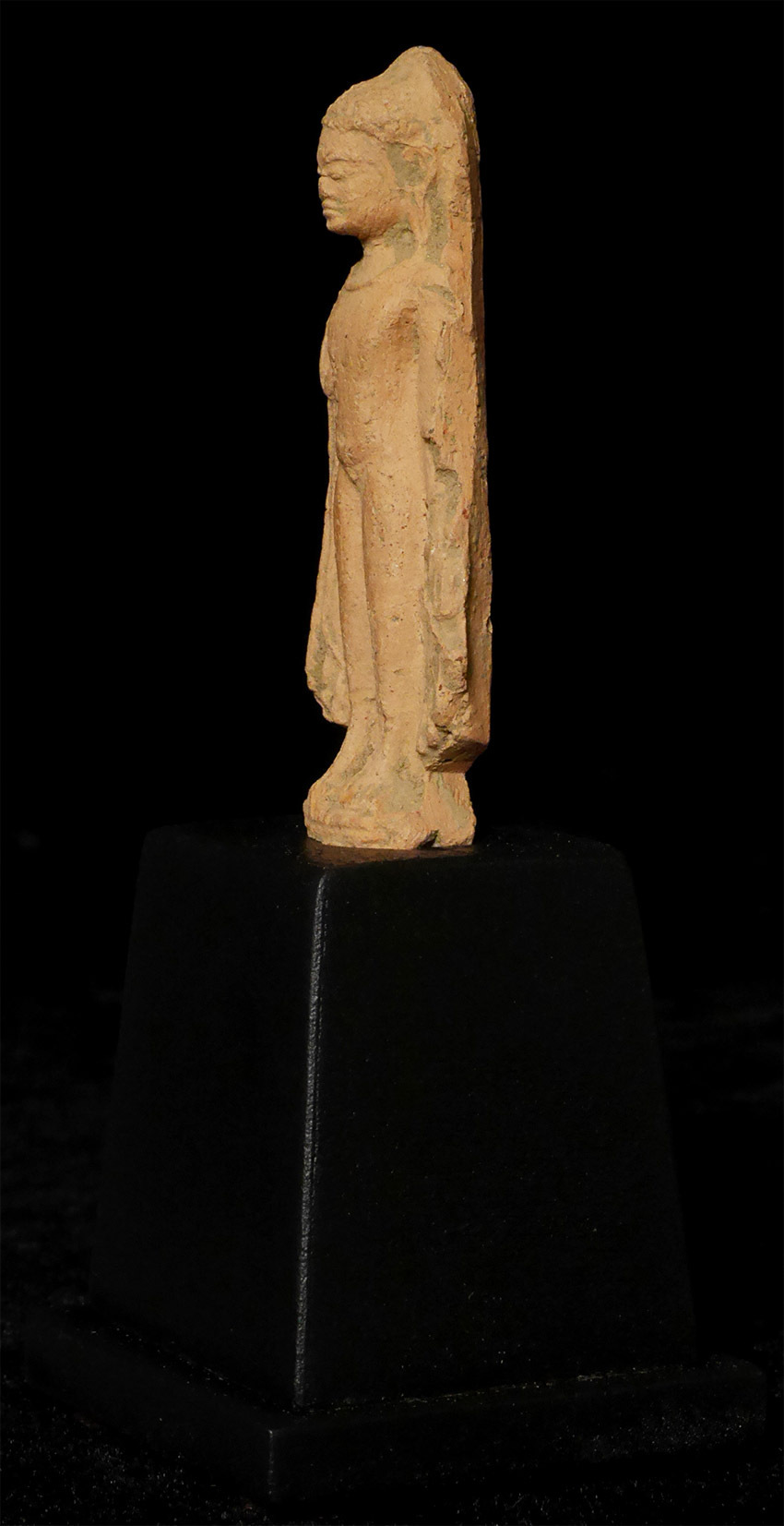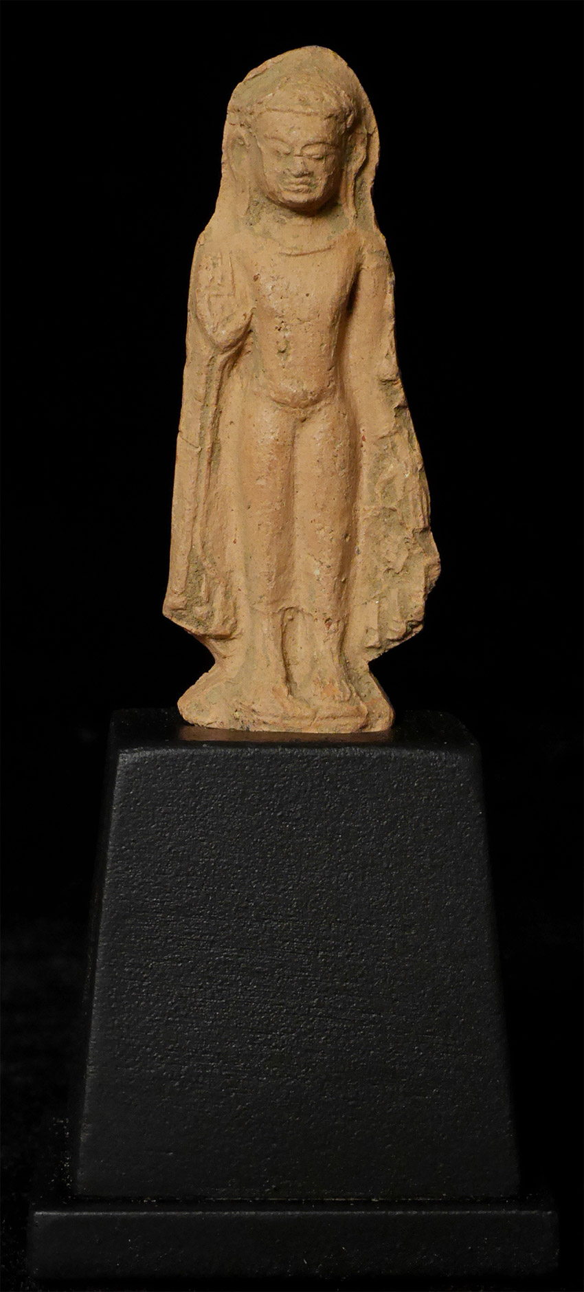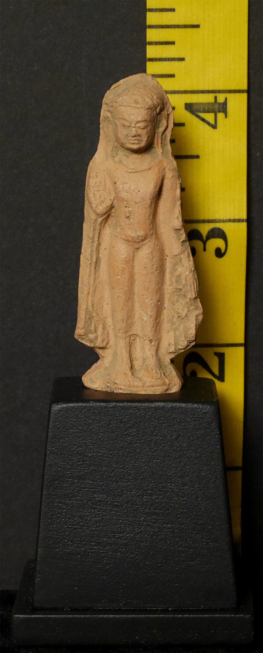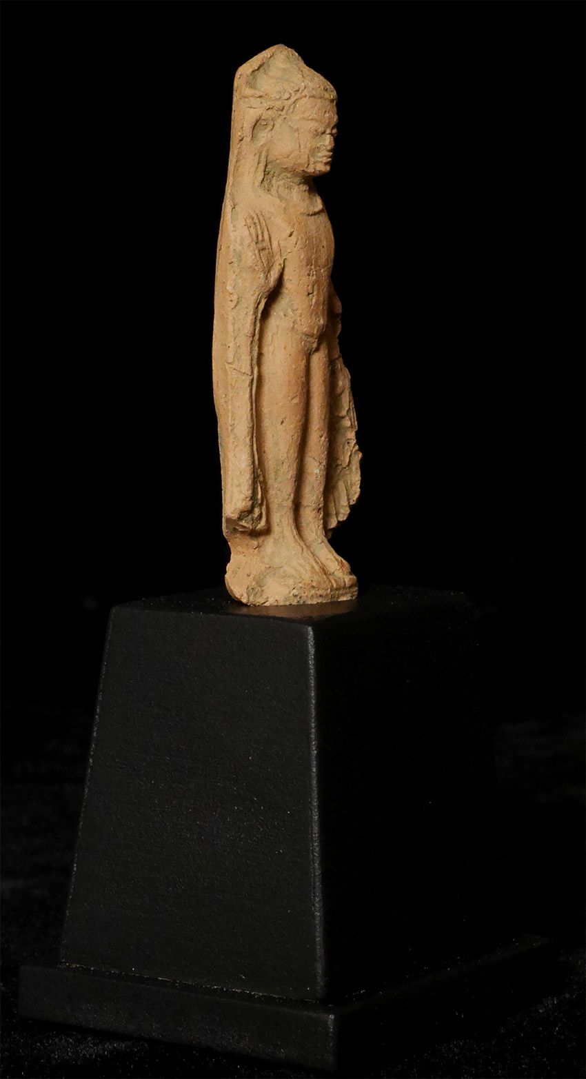 Authentic 11-13thC Dvarati Standing Buddha on Custom Base. Made of Terracotta. Dvarati Kingdom flourished in the 7th to 13thC in Northern Thailand, and was tied artistically and politically to the great Khmer empire. Quite rare. Stands 2.25 inches tall, 4 1/8 inches on custom stand