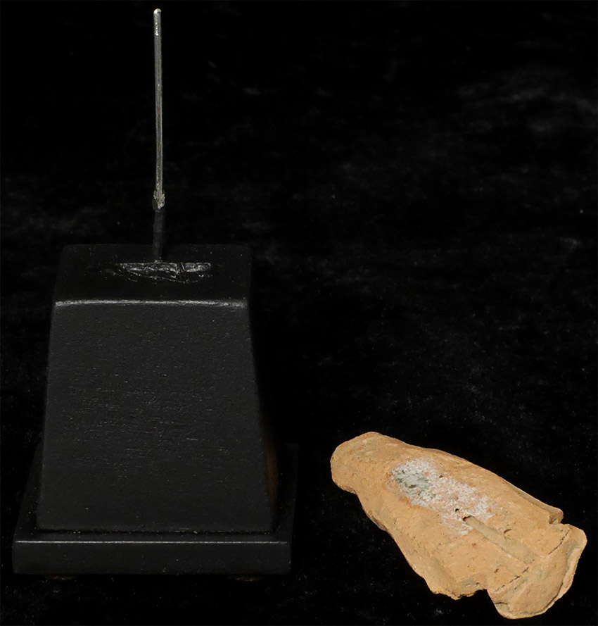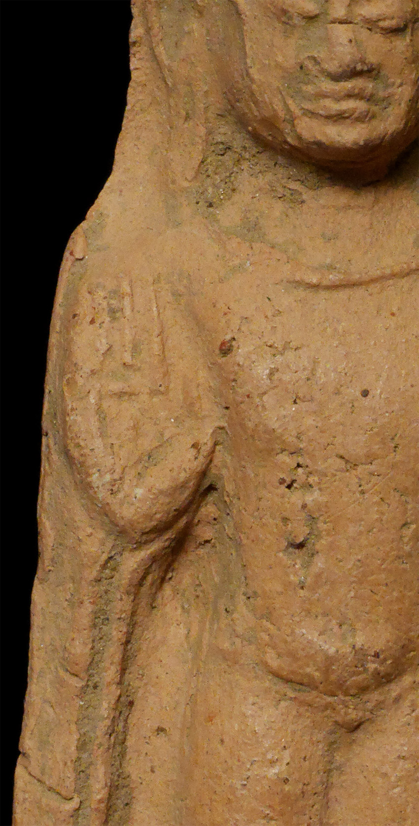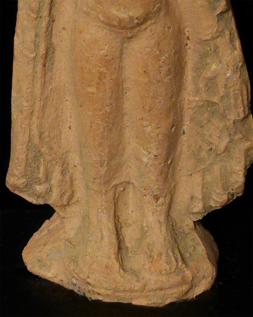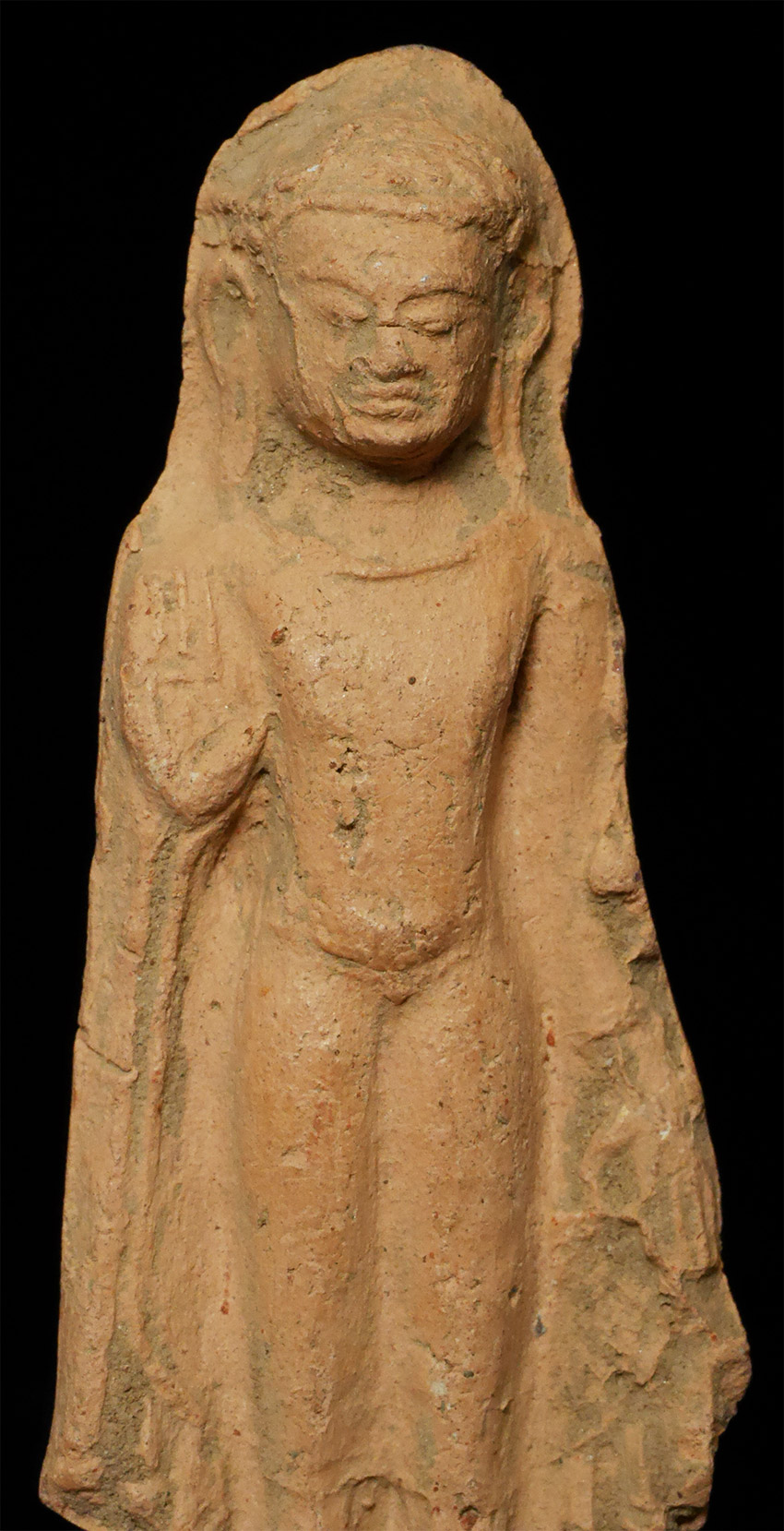 Authentic 11-13thC Dvarati Standing Buddha on Custom Base. Made of Terracotta. Dvarati Kingdom flourished in the 7th to 13thC in Northern Thailand, and was tied artistically and politically to the great Khmer empire. Quite rare. Stands 2.25 inches tall, 4 1/8 inches on custom stand