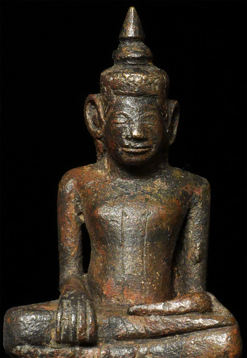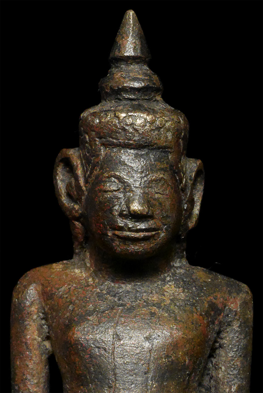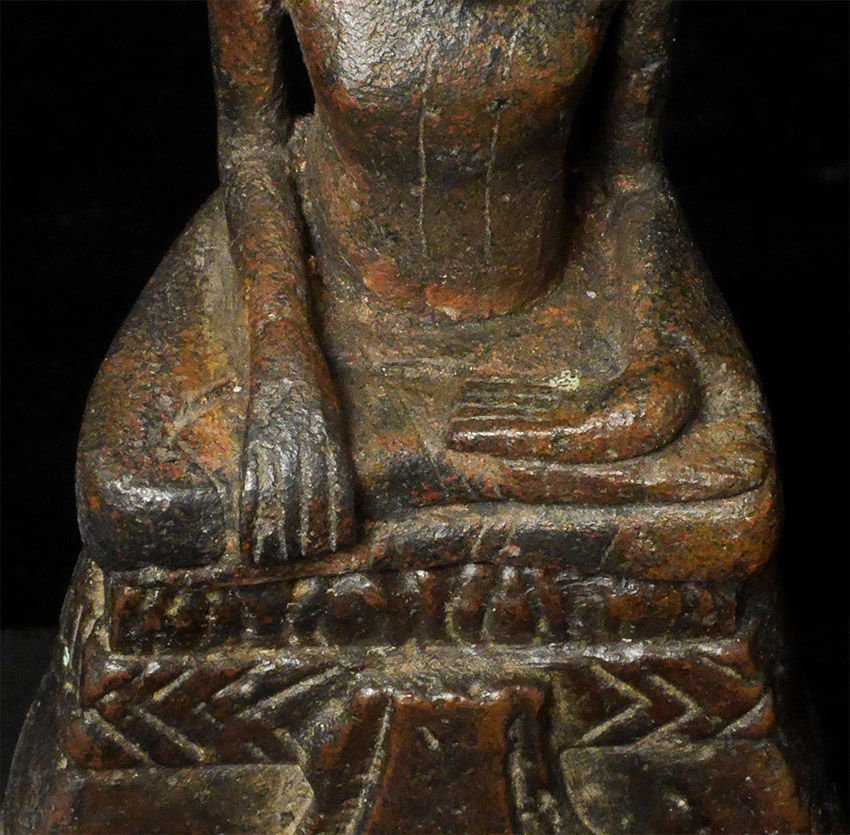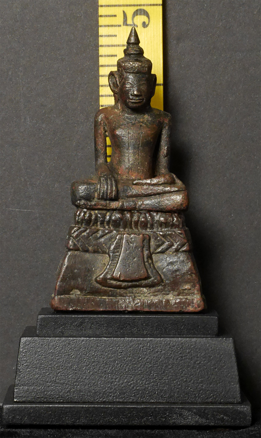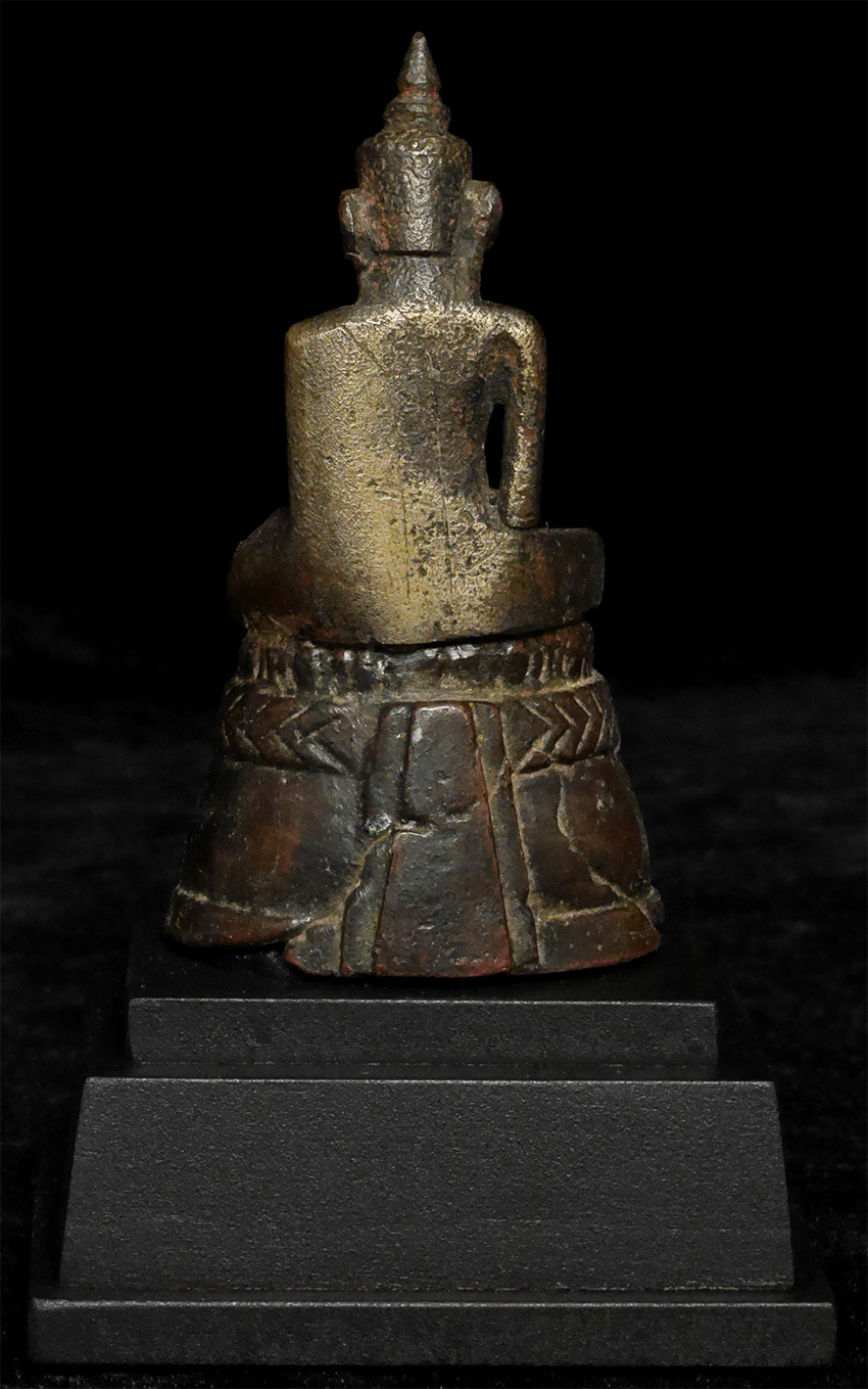 This is a very nice 17th or early 18thC Cambodian Buddha. It is made of a very high silver content alloy. The bronze base and silver Buddha are separately cast and attached with a lead plug. Quite heavy for its size, as the Buddha is solid cast. Wonderful dark patina. Someone cleaned part of the back. Very nice base- very often these are missing, as after 300+ years the lead plug loosens and the base falls off. Sits 3.5 inches tall, 4.75 inches on custom stand. These are getting very hard to find, especially in this original state.